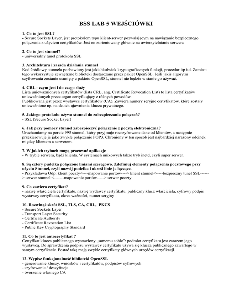 BSS LAB 5 WEJŚCIÓWKI 1. Co to jest SSL? - Secure Sockets Layer, jest protokołem typu klient-serwer pozwalającym na nawiązanie bezpiecznego połączenia z użyciem certyfikatów. Jest on zorientowany głównie na uwierzytelnianie serwera 2. Co to jest stunnel? - uniwersalny tunel protokołu SSL 3. Architektura i zasada działania stunnel Kod źródłowy stunnela pozbawiony jest jakichkolwiek kryptograficznych funkcji, procedur itp itd. Zamiast tego wykorzystuje zewnętrzne biblioteki dostarczane przez pakiet OpenSSL. Jeśli jakiś algorytm szyfrowania zostanie usunięty z pakietu OpenSSL, stunnel nie będzie w stanie go używać. 4. CRL - czym jest i do czego służy Lista unieważnionych certyfikatów (lista CRL, ang. Certificate Revocation List) to lista certyfikatów unieważnionych przez organ certyfikujący z różnych powodów. Publikowana jest przez wystawcę certyfikatów (CA). Zawiera numery seryjne certyfikatów, które zostały unieważnione np. na skutek ujawnienia klucza prywatnego. 5. Jakiego protokołu używa stunnel do zabezpieczania połączeń? - SSL (Secure Socket Layer) 6. Jak przy pomocy stunnel zabezpieczyć połączenie z pocztą elektroniczną? Uruchamiamy na porcie 995 stunnel, który przyjmuje rozszyfrowane dane od klientów, a następnie przekierowuje je jako zwykłe połączenie POP3. Chroniony w ten sposób jest najbardziej narażony odcinek między klientem a serwerem. 7. W jakich trybach mogą pracować aplikacje - W trybie serwera, bądź klienta. W systemach unixowych także tryb inetd, czyli super serwer. 8. Są cztery pudełka połączone liniami szeregowo. Zdefiniuj elementy połączenia pocztowego przy użyciu Stunnel, czyli nazwij pudełka i określ linie je łączące. - Przykładowa Odp: klient poczty<----mapowanie portów----> klient stunnel<-----bezpieczny tunel SSL-----> serwer stunnel <-------mapowanie portów-----> serwer poczty 9. Co zawiera certyfikat? - nazwę właściciela certyfikatu, nazwę wydawcy certyfikatu, publiczny klucz właściciela, cyfrowy podpis wystawcy certyfikatu, okres ważności, numer seryjny 10. Rozwinąć skrót SSL, TLS, CA, CRL, PKCS - Secure Sockets Layer - Transport Layer Security - Certificate Authority - Certificate Revocation List - Public Key Cryptography Standard 11. Co to jest autocertyfikat ? Certyfikat klucza publicznego wystawiony „samemu sobie”: podmiot certyfikatu jest zarazem jego wystawcą. Do sprawdzenia podpisu wystawcy certyfikatu używa się klucza publicznego zawartego w samym certyfikacie. Postać taką mają zwykle certyfikaty głównych urzędów certyfikacji. 12. Wypisz funkcjonalność biblioteki OpenSSL - generowanie kluczy, wniosków i certyfikatów, podpisów cyfrowych - szyfrowanie / deszyfracja - tworzenie własnego CA