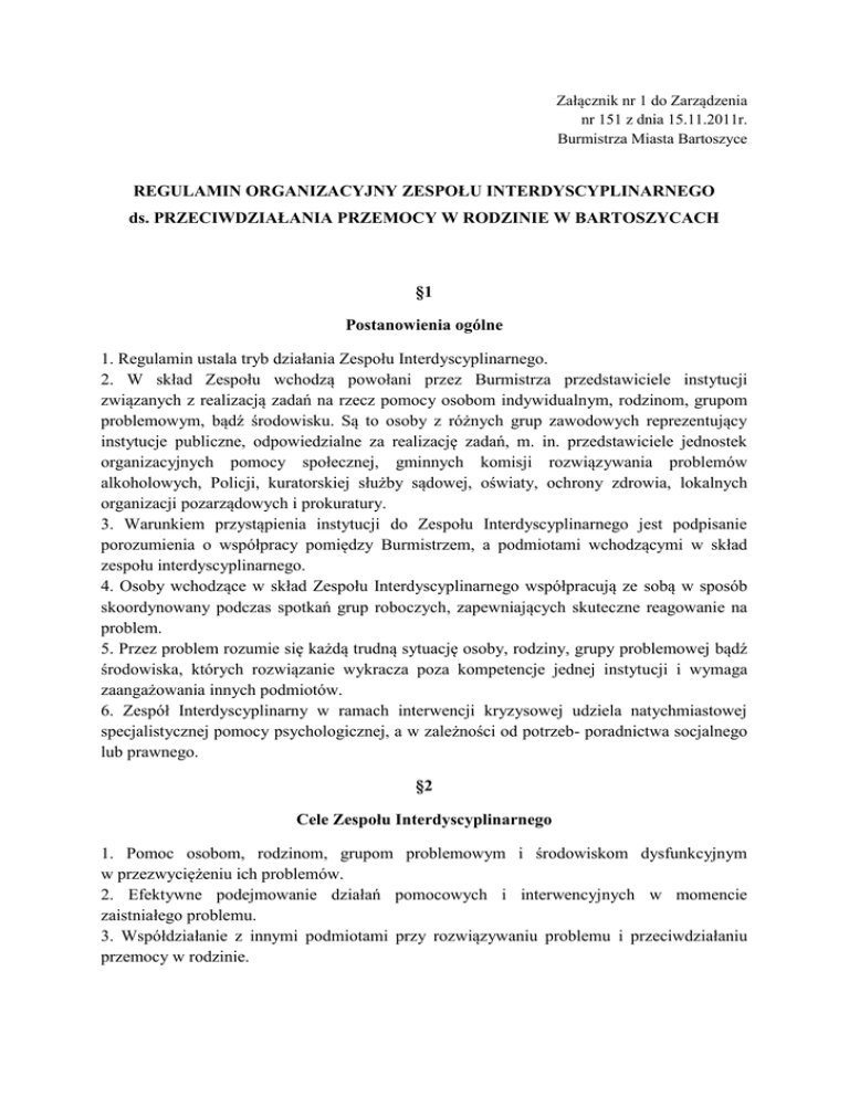 Załącznik nr 1 do Zarządzenia nr 151 z dnia 15.11.2011r. Burmistrza Miasta Bartoszyce REGULAMIN ORGANIZACYJNY ZESPOŁU INTERDYSCYPLINARNEGO ds. PRZECIWDZIAŁANIA PRZEMOCY W RODZINIE W BARTOSZYCACH §1 Postanowienia ogólne 1. Regulamin ustala tryb działania Zespołu Interdyscyplinarnego. 2. W skład Zespołu wchodzą powołani przez Burmistrza przedstawiciele instytucji związanych z realizacją zadań na rzecz pomocy osobom indywidualnym, rodzinom, grupom problemowym, bądź środowisku. Są to osoby z różnych grup zawodowych reprezentujący instytucje publiczne, odpowiedzialne za realizację zadań, m. in. przedstawiciele jednostek organizacyjnych pomocy społecznej, gminnych komisji rozwiązywania problemów alkoholowych, Policji, kuratorskiej służby sądowej, oświaty, ochrony zdrowia, lokalnych organizacji pozarządowych i prokuratury. 3. Warunkiem przystąpienia instytucji do Zespołu Interdyscyplinarnego jest podpisanie porozumienia o współpracy pomiędzy Burmistrzem, a podmiotami wchodzącymi w skład zespołu interdyscyplinarnego. 4. Osoby wchodzące w skład Zespołu Interdyscyplinarnego współpracują ze sobą w sposób skoordynowany podczas spotkań grup roboczych, zapewniających skuteczne reagowanie na problem. 5. Przez problem rozumie się każdą trudną sytuację osoby, rodziny, grupy problemowej bądź środowiska, których rozwiązanie wykracza poza kompetencje jednej instytucji i wymaga zaangażowania innych podmiotów. 6. Zespół Interdyscyplinarny w ramach interwencji kryzysowej udziela natychmiastowej specjalistycznej pomocy psychologicznej, a w zależności od potrzeb- poradnictwa socjalnego lub prawnego. §2 Cele Zespołu Interdyscyplinarnego 1. Pomoc osobom, rodzinom, grupom problemowym i środowiskom dysfunkcyjnym w przezwyciężeniu ich problemów. 2. Efektywne podejmowanie działań pomocowych i interwencyjnych w momencie zaistniałego problemu. 3. Współdziałanie z innymi podmiotami przy rozwiązywaniu problemu i przeciwdziałaniu przemocy w rodzinie. 4. Rozpowszechnianie informacji o instytucjach, osobach i możliwościach udzielenia pomocy w środowisku lokalnym. §3 Zadania Zespołu Interdyscyplinarnego 1. Cele Zespołu realizowane są poprzez: 1) Ocenę sytuacji problemowej osoby indywidualnej, rodziny, grup problemowych lub środowiska znajdujących się w sytuacji kryzysowej i wypracowanie sposobu postępowania, który będzie miał na celu przywrócenie integralności rodziny, bądź środowiska oraz możliwości realizowania ich funkcji, oraz podejmowanie działań w tym celu przewidzianych przepisami prawa. 2) Udzielanie pomocy, a w zależności od potrzeb poradnictwa socjalnego, prawnego, psychologicznego osobom, rodzinom, grupom problemowym i środowisku, które mają trudności lub wykazują potrzebę wsparcia w rozwiązywaniu swoich problemów. 3) Podejmowanie interwencji w przypadku przemocy domowej i uruchamianie procedur mających na celu jej powstrzymanie. 4) Udzielanie pomocy dzieciom doświadczającym i będących świadkami przemocy w rodzinie. 5) Kierowanie ofiar i sprawców do specjalistów. 6) Podejmowanie wspólnych działań w ramach procedury „Niebieska Karta”. 7) Gromadzenie informacji na temat instytucji udzielających pomocy rodzinom, w których występuje zjawisko przemocy domowej. 8) Występowanie z zawiadomieniami do Prokuratury o podejrzeniu popełnienia czynów określonych w art. 2 pkt 2 Ustawy o przeciwdziałaniu przemocy w rodzinie. 2. W ramach zespołu interdyscyplinarnego realizowane mogą być także: 1) Tworzenie lokalnych zintegrowanych programów i kampanii profilaktycznych m. in. z zakresu problemów uzależnień, bezrobocia, trudności wychowawczych, przestępczości i innych zagadnień lokalnej polityki społecznej. 2) Inicjowanie badań, diagnoz w tym wspólnego diagnozowania osób indywidualnych i środowiska, którego problem dotyczy oraz ekspertyz wspierających prace ZI w danym obszarze. 3) Współpraca z mediami w ramach upowszechniania informacji dotyczącego zjawiska przemocy w rodzinie. §4 Funkcjonowanie Miejskiego Zespołu Interdyscyplinarnego oraz grup roboczych 1. Zespół działa przy Miejskim Ośrodku Pomocy Społecznej w Bartoszycach, który zapewnia jego obsługę organizacyjno- techniczną. 2. Prace Zespołu i Grup Roboczych koordynuje Przewodniczący Zespołu– Pełnomocnik Burmistrza ds. Profilaktyki Uzależnień w Bartoszycach lub Koordynator Grup Roboczych- Pracownik Socjalny w MOPS-ie, ewentualnie w zastępstwie wskazany przez przewodniczącego inny członek zespołu. 3. Członkami Zespołu Interdyscyplinarnego są przedstawiciele instytucji, które podpisały porozumienie o współpracy. 4. Członkami grup roboczych są pracownicy instytucji wskazanych w ust. 3, zgodnie ze swoimi kompetencjami określonymi w szczególnych przepisach prawa, i dotyczących zakresu działania tych instytucji. Celem grup roboczych jest praca nad indywidualnymi problemami osób, rodzin, grup problemowych i środowisk. 5. Spotkania grup roboczych zwołuje się na wniosek osób, rodzin, grup problemowych bądź środowiska, mających trudności lub wykazujących potrzebę wsparcia w rozwiązywaniu sytuacji problemowych. 6. Wszystkich członków Zespołu i grup roboczych obowiązuje zasada tajności informacji przekazywanych w ramach prac Zespołu bądź grupy. Obowiązek ten utrzymuje się także po ustaniu członkostwa w Zespole lub grupie roboczej. 7. W celu tworzenie lokalnych zintegrowanych programów i kampanii profilaktycznych oraz lokalnej polityki społecznej w pracach uczestniczą wszyscy członkowie Zespołu Interdyscyplinarnego. §5 Zwoływanie Zespołu Interdyscyplinarnego i Grup Roboczych 1. Zgłoszenia sprawy na posiedzenie grup roboczych może dokonać każdy członek Zespołu lub grupy roboczej. Osoba zgłaszająca sprawę ustala z Przewodniczącym skład, miejsce i termin posiedzenia grupy roboczej. Zgłoszenie odbywa się poprzez wypełnienie przez członka Zespołu i przedsta