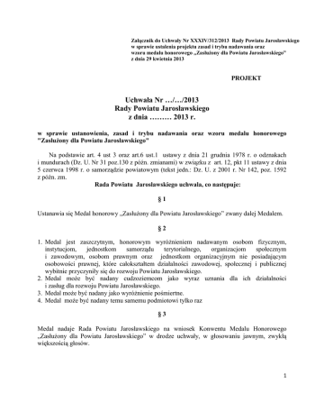 Załącznik do Uchwały Nr XXXIV/312/2013 Rady Powiatu Jarosławskiego w sprawie ustalenia projektu zasad i trybu nadawania oraz wzoru medalu honorowego „Zasłużony dla Powiatu Jarosławskiego” z dnia 29 kwietnia 2013 PROJEKT Uchwała Nr …/…/2013 Rady Powiatu Jarosławskiego z dnia ……… 2013 r. w sprawie ustanowienia, zasad i trybu nadawania oraz wzoru medalu honorowego "Zasłużony dla Powiatu Jarosławskiego" Na podstawie art. 4 ust 3 oraz art.6 ust.1 ustawy z dnia 21 grudnia 1978 r. o odznakach i mundurach (Dz. U. Nr 31 poz.130 z późn. zmianami) w związku z art. 12, pkt 11 ustawy z dnia 5 czerwca 1998 r. o samorządzie powiatowym (tekst jedn.: Dz. U. z 2001 r. Nr 142, poz. 1592 z późn. zm. Rada Powiatu Jarosławskiego uchwala, co następuje: §1 Ustanawia się Medal honorowy „Zasłużony dla Powiatu Jarosławskiego” zwany dalej Medalem. §2 1. Medal jest zaszczytnym, honorowym wyróżnieniem nadawanym osobom fizycznym, instytucjom, jednostkom samorządu terytorialnego, organizacjom społecznym i zawodowym, osobom prawnym oraz jednostkom organizacyjnym nie posiadającym osobowości prawnej, które całokształtem działalności zawodowej, społecznej i publicznej wybitnie przyczyniły się do rozwoju Powiatu Jarosławskiego. 2. Medal może być nadany cudzoziemcom jako wyraz uznania dla ich działalności i zasług dla rozwoju Powiatu Jarosławskiego. 3. Medal może być nadany jako wyróżnienie pośmiertne. 4. Medal może być nadany temu samemu podmiotowi tylko raz §3 Medal nadaje Rada Powiatu Jarosławskiego na wniosek Konwentu Medalu Honorowego „Zasłużony dla Powiatu Jarosławskiego” w drodze uchwały, w głosowaniu jawnym, zwykłą większością głosów. 1 §4 1. Zgłoszenia o nadanie Medalu opiniuje Konwent Medalu Honorowego „Zasłużony dla Powiatu Jarosławskiego” zwany dalej Konwentem w składzie: 1) Przewodniczący Rady Powiatu Jarosławskiego - jako jego Przewodniczący; 2) Starosta Jarosławski; 3) Wiceprzewodniczący Rady Powiatu Jarosławskiego; 4) Wiceprzewodniczący Rady Powiatu Jarosławskiego; 5) Przewodniczący Komisji Promocji i Rozwoju Powiatu oraz Współpracy Międzynarodowej Rady Powiatu Jarosławskiego. 2. Członkowie Konwentu pełnią swoją funkcję społecznie. 3. Posiedzenie Konwentu zwołuje jego Przewodniczący. W przypadku jego nieobecności pracami Konwentu kieruje najstarszy wiekiem członek Konwentu. 4. Posiedzenia Konwentu rozpatrujące zgłoszenia odbywają się nie rzadziej niż raz w roku. 5. Uchwały Konwentu podejmowane są w głosowaniu jawnym, zwykłą większością głosów. 6. Jeżeli zgłoszenie uzyska pozytywną opinię Konwentu, Przewodniczy kieruje wniosek o nadanie Medalu do Rady Powiatu. 7. Członkostwo w Konwencie nie wyklucza możliwości przyznania Medalu. W przypadku głosowania w sprawie przyznania Medalu osobie będącej członkiem Konwentu, kandydat nie bierze udziału w głosowaniu. §5 1. Podmiotami uprawnionymi do wniesienie zgłoszenia o nadanie Medalu są: 1) Przewodniczący Rady Powiatu Jarosławskiego; 2) Starosta Jarosławski; 3) Zarząd Powiatu Jarosławskiego; 4) Komisje Stałe Rady Powiatu Jarosławskiego; 5) Grupa co najmniej 5 Radnych Powiatu Jarosławskiego; 6) kierownicy zakładów pracy, instytucji i jednostek organizacyjnych powiatu; 7) organy jednostek samorządu terytorialnego; 8) organy statutowe organizacji społecznych, politycznych, związkowych, młodzieżowych, spółdzielczych, kościołów, związków wyznaniowych i innych. 2. Zgłoszenie o nadanie Medalu osobie fizycznej powinno zawierać dokładne dane osobowe zgłaszanego do wyróżnienia, przebieg pracy zawodowej, społecznej oraz uzasadnienie wskazujące szczególne dokonania i zasługi dla rozwoju Powiatu Jarosławskiego. 3. Zgłoszenie o nadanie Medalu podmiotowi nie będącemu osobą fizyczną powinno zawierać dokładne dane zgłaszanego do wyróżnienia, charakterystykę jego działań , oraz uzasadnienie wskazujące szczególne dokonania i zasługi dla rozwoju Powiatu Jarosławskiego. 4. Wzór zgłoszenia o nadanie Medalu: 1) Osobie fizycznej określa załącznik nr 1; 2) Podmiotowi nie będącemu osobą fizyczną określa załącznik nr 2. 5. Prowadzeniem spraw związanych z nadawaniem Medalu zajmuje się Biuro Rady, Komisji i Zarządu Powiatu - Starostwa Powiatowego w Jarosławiu zwane dalej Biurem. 2 6. Biuro dokonuje weryfikacji zgłoszenia pod względem formalnym. Zgłoszenia spełniające wymogi formalne kierowane są pod obrady Konwentu. §6 1. Ustala się wzór Medalu honorowego „Zasłużony dla Powiatu Jarosławskiego. Medal o wymiarach 10 cm x 10 cm wykonany z mosiądzu polerowanego jest kompozycją otwartą, asymetryczną, w której użyte zostały zestawione ze sobą geometrycznie figury koła i kwadratu. Na awersie w centralnym miejscu Medalu, znajdują się zarys granic powiatu oraz patron powiatu św. Michał Archanioł. Zarys granic powiatu przesunięty jest w dół względem środka płaszczyzny, nad nim prawie na obrzeżu koła przedstawiona jest postać anioła. W wierzchołki kwadratu wpisane są międzynarodowe symbole liternicze, które oznaczają strony świata(w zamyśle ideowym zagadnienie widzenia powiatu jako – małej ojczyzny w szerszej globalnej perspektywie, jako fragmentu świata). W dolnej części Medalu znajduje się prostokątne pole, które zostało wykorzystane jako płaszczyzna liternicza o charakterze informacyjnym. Znajduje się tam napis „Zasłużony dla Powiatu Jarosławskiego”. Na rewersie Medalu w centralnym miejscu grawerowane jest imię i nazwisko bądź nazwa podmiotu wyróżnionego, a na obrzeżu kolejny numer i data nadania. 2. Wzór Medalu stanowi załącznik nr 3. . §7 1. Medal wręcza w imieniu Rady Powiatu Jarosławskiego, Przewodniczący wraz ze Starostą Jarosławskim. 2. W przypadku nieobecności Przewodniczącego Rady Powiatu Jarosławskiego lub Starosty Jarosławskiego w ich imieniu Medal wręczyć mogą odpowiednio Wiceprzewodniczący Ra