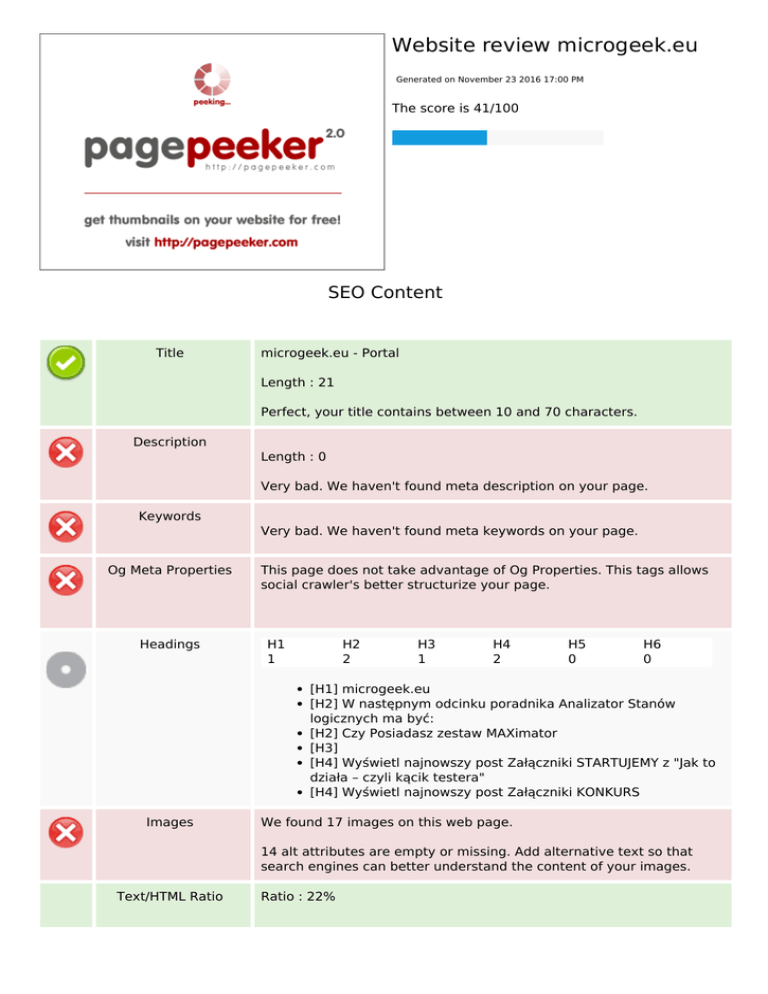 Website review microgeek.eu Generated on November 23 2016 17:00 PM The score is 41/100 SEO Content Title microgeek.eu - Portal Length : 21 Perfect, your title contains between 10 and 70 characters. Description Length : 0 Very bad. We haven't found meta description on your page. Keywords Very bad. We haven't found meta keywords on your page. Og Meta Properties Headings This page does not take advantage of Og Properties. This tags allows social crawler's better structurize your page. H1 1 H2 2 H3 1 H4 2 H5 0 H6 0 [H1] microgeek.eu [H2] W następnym odcinku poradnika Analizator Stanów logicznych ma być: [H2] Czy Posiadasz zestaw MAXimator [H3] [H4] Wyświetl najnowszy post Załączniki STARTUJEMY z "Jak to działa – czyli kącik testera" [H4] Wyświetl najnowszy post Załączniki KONKURS Images We found 17 images on this web page. 14 alt attributes are empty or missing. Add alternative text so that search engines can better understand the content of your images. Text/HTML Ratio Ratio : 22% SEO Content Good, this page's ratio of text to HTML code is higher than 15, but lower than 25 percent. Flash Iframe Perfect, no Flash content has been detected on this page. Great, there are no Iframes detected on this page. SEO Links URL Rewrite Bad. Your links have query string. Underscores in the URLs We have detected underscores in your URLs. You should rather use hyphens to optimize your SEO. In-page links We found a total of 95 links including 1 link(s) to files Statistics External Links : noFollow 0% External Links : Passing Juice 8.42% Internal Links 91.58% In-page links Anchor Type Juice Przejdź do zawartości Internal Passing Juice Wyszukiwanie zaawansowane Internal Passing Juice Więcej… Internal Passing Juice Posty bez odpowiedzi Internal Passing Juice Aktywne tematy Internal Passing Juice Zespół administracyjny Internal Passing Juice FAQ Internal Passing Juice Zaloguj się Internal Passing Juice In-page links Zarejestruj się Internal Passing Juice Portal Internal Passing Juice http://www.microgeek.eu Internal Passing Juice https://plus.google.com/communities/103 ... 0398231654 External Passing Juice https://www.facebook.com/microgeek.eu/ External Passing Juice app.php/mchat Internal Passing Juice STARTUJEMY z "Jak to działa – czyli kącik testera" Internal Passing Juice KONKURS Internal Passing Juice [Rozwiązane][Sprzęt] Karta grafiki Internal Passing Juice [Laptop] jaki kupić? Internal Passing Juice Jak sprawdzić op-amp Internal Passing Juice [Sprzedam] Oferta wyprzedażowa Internal Passing Juice Koszulki/bluzy a'la EEVblog. Internal Passing Juice Zajawka YUP :) Internal Passing Juice MAXimator (FPGA) Internal Passing Juice Problem z Arduino UNO Internal Passing Juice USBASP, Attiny2313 - błędy w AVRDude Internal Passing Juice STM32f103c8t6 po pierwszym programowaniu nie mogę się skomunikować Internal Passing Juice [Javascript, CSS3] JLCG - biblioteka do obsługi stacjonarnej grafiki 2d CSS3 Internal Passing Juice [FRDM-KL25Z] Ustawienie zegara na 48MHz Internal Passing Juice "Mikrokontrolery PIC w praktycznych zastosowaniach" - książka Internal Passing Juice Zegar na bramkach logicznych realizacja nastawy czasu Internal Passing Juice [MPLAB Xpress] IDE w chmurze Internal Passing Juice Polecany Router 1G + 300M Wifi Internal Passing Juice [MPLAB X IDE] - instalacja MCC i bibliotek Internal Passing Juice [Raspberry]Zmiana radiatora Internal Passing Juice Atari 65XE 1MB SIMM Internal Passing Juice In-page links wojtek Internal Passing Juice Jak to działa – czyli kącik testera Internal Passing Juice Odpowiedz Internal Passing Juice Read all Internal Passing Juice Na górę Internal Passing Juice acid3 Internal Passing Juice Uwagi, sprawy organizacyjne Internal Passing Juice KAMAMI External Passing Juice Projektowanie analogowych układów scalonych External Passing Juice Odpowiedz Internal Passing Juice Read all Internal Passing Juice StaryAnoda Internal Passing Juice ARM STMicroelectronics Internal Passing Juice rezasurmar Internal Passing Juice j23 Internal Passing Juice Inne języki programowania Internal Passing Juice Nefarious19 Internal Passing Juice Freescale - problemy układowe Internal Passing Juice Antystatyczny Internal Passing Juice Źródła wiedzy na temat PIC Internal Passing Juice Podstawy elektroniki - teoria i praktyka Internal Passing Juice 2 Internal Passing Juice 3 Internal Passing Juice 4 Internal Passing Juice 5 Internal Passing Juice 112 Internal Passing Juice Wyświetl temat Internal Passing Juice Moderatorzy globalni Internal Passing Juice In-page links Zarejestrowani użytkownicy Internal Passing Juice Kolonia karna Internal Passing Juice Wykaz forów Internal Passing Juice BBCode FAQ Internal Passing Juice Warunki użytkowania Internal Passing Juice Polityka Prywatności Internal Passing Juice 944 Internal Passing Juice 603 Internal Passing Juice 502 Internal Passing Juice PROTON Internal Passing Juice 190 Internal Passing Juice 169 Internal Passing Juice matty24 Internal Passing Juice 160 Internal Passing Juice Grzegorz... Internal Passing Juice 158 Internal Passing Juice netjack Internal Passing Juice izomebohe Internal Passing Juice [email protected] Internal Passing Juice biczysko Internal Passing Juice gpuk Internal Passing Juice barti19941 Internal Passing Juice Kocon Internal Passing Juice michalstankiewic Internal Passing Juice Board3.de External Passing Juice phpBB.com External Passing Juice admin Internal Passing Juice MicroGeek Internal Passing Juice In-page links Usuń ciasteczka witryny Internal Passing Juice Kontakt z nami Internal Passing Juice phpBB External Passing Juice phpBB.pl External Passing Juice SEO Keywords Keywords Cloud autor: ide dla lis jakie wyświetl post 2016, programowanie temat Keywords Consistency Keyword Content lis 18 2016, 15 post 13 temat 12 dla 10 Title Keywords Description Usability Url Domain : microgeek.eu Length : 12 Favicon Great, your website has a favicon. Printability We could not find a Pri