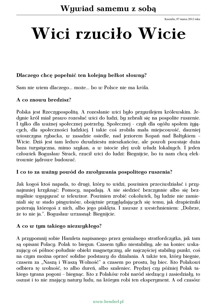 Wywiad samemu z sobą Koszalin, 07 marca 2012 roku Wici rzuciło Wicie Dlaczego chcę popełnić ten kolejny bełkot słowny? Sam nie wiem dlaczego... może... bo w Polsce nie ma króla. A co znowu bredzisz? Polska jest Rzeczypospolitą. A rozesłanie wici było przywilejem królewskim. Jedynie król miał prawo rozesłać wici do ludzi, by zebrali się na pospolite ruszenie. I tylko dla ważnej społecznej potrzeby. Społecznej - czyli dla ogółu społem żyjących, dla społeczności ludzkiej. I takie coś zrobiła mała miejscowość, dawniej wioszczyna rybacka, w zasadzie osiedle, nad jeziorem Kopań nad Bałtykiem – Wicie. Dziś jest tam ledwo dwudziestu mieszkańców, ale powoli powstaje duża baza turystyczna, mimo szykan, a w istocie złej woli władz lokalnych. I jeden człowiek Bogusław Strack, rzucił wici do ludzi: Biegnijcie, bo tu nam chcą elektrownie jądrowe budować. I co to za ważny powód do zwoływania pospolitego ruszenia? Jak kogoś ktoś napada, to drugi, który to widzi, powinien przeciwdziałać i przynajmniej krzyknąć: Pomocy, napadają. A nie siedzieć bezczynnie albo się bezmyślnie wgapywać w telewizor. Powinien zrobić cokolwiek, by ludzie nie zamieniali się w stado pingwinów, obojętnie przyglądających się temu, jak drapieżniki pożerają któregoś z nich, albo jego pisklęta. I zawsze z westchnieniem: „Dobrze, że to nie ja.”. Bogusław wrzasnął: Biegnijcie. A co w tym takiego niezwykłego? A przypomnij sobie Hamleta napisanego przez genialnego stratfordczytka, jak tam są opisani Polacy. Polak to biegun. Czasem tylko niestabilny, ale na koniec wskazujący oś północ-południe obiekt magnetyczny, ale najczęściej stabilny punkt, coś na czym można oprzeć solidne podstawy do działania. A także ten, który biegnie, czasem za „Naszą i Waszą Wolność” a czasem po prostu, by biec. Kto Polakowi odbiera tę wolność, to albo dureń, albo szaleniec. Prędzej czy później Polak takiego tyrana pogoni – biegnąc. Kto z Polaków robi naród siedzący i zasiedziały, to oszust i to nie znający natury ludu, na którym robi ten eksperyment. A od czasów www.hendzel.pl Wywiad samemu z sobą Koszalin, 07 marca 2012 roku królewicza duńskiego Polak się już czegoś dorobił, nie tylko lodowych pustkowi. Czemu nie miałby teraz biec i ratować tego, co ma? Ale przecież twierdzi się, że energetyka jądrowa to takie panaceum na problem energetyczny? Tak, słyszałem te brednie. Jak to niby będzie tu ciemna dziura, gdy prądu zabraknie. Dawniej nam wmawiano, że potrzebny nam jest komunizm, bo bez niego pomrzemy z głodu. I jakoś zaczęliśmy mrzeć z głodu, gdy przyszedł komunizm, a bez niego nie zdychamy. I jeszcze inni specjaliści od podobnych niedorzeczności wpajali nam, że bez porządku faszyzmu poginiemy z bałaganu. I ginęliśmy w tym porządku, a w tym bałaganie, który tak komuś solą w oku stoi, żyjemy i to godnie i jak ludzie. Jak mogę porównywać takie rzeczy jak totalitaryzm komunistyczny i faszystowski do energetyki jądrowej? Więcej – nie widzę tu żadnej różnicy. Gorzej nawet. Dla mnie ten rodzaj otumaniania powszechnego, który stosuje się tutaj jest jeszcze gorszy, gdyż odwołuje się do najniższych instynktów i to nowego chowu. Prąd elektryczny umiemy powszechnie stosować od wynalazków Tomasza Alvy Edisona – czyli od stu kilkudziesięciu lat. A ludźmi zaczęliśmy być jakieś 50 tysięcy lat temu. Czy nawołuję do powrotu do jaskiń? Nie – widzę to jasno. Energetyka jądrowa wywyższa godność człowieka, wysyłając go z powrotem na drzewa, zamieniając go w zdziczałą małpę pozbawioną uczuć wyższych. I wszystko w imię wyższego celu: Posiadania prądu elektrycznego. A przecież energetyka jądrowa nie ma monopolu na prąd elektryczny i bez niej świat świetnie sobie poradzi z jego produkcją. Chodzi jej tylko o stworzenie dogodnych warunków do tego, by zamienić społeczeństwo w tłum niewolników, który dostosuje się do tego wielkiego kołchozu, jakim jest system energetyczny oparty na scentralizowanym systemie dostaw prądu i to ze źródła, które powszechnie uważa się za niebezpieczne, bo jest niebezpieczne. Można przy tym stworzyć cały aparat przymusu i kontroli, bo jacyś niebezpieczni ludzie czyhają na elektrownie jądrowe, by je poniszczyć i spowodować katastrofę. Czyli energetyka jądrowa jest to zagrożenie dla wolności ludzkiej? Oczywiście, jest to zagrożenie dla wolności i to bardziej podstępne i niebezpieczne niż komunizm i reakcja na komunizm – czyli faszyzm. Nie możemy udawać. Przecież wierni funkcjonariusze zarówno komunizmu jak i faszyzmu świetnie odnajdywali się w aparacie tego tworu, który Robert Jungk nazwał państwem atomowym. Centralne sterowanie, zastraszenie, inwigilacja i powszechna kontrola – to wszystko cechy państwa totalnego. I takie jest państwo sterowane tą nowoczesną metodą uzurpacji – jakim są państwa atomowe. Przekonał się o tym Piotr Laskowski, którego zaniosło pod elektrownie jądrowe na wycieczce indywidualnej dla sprawdzenia, jak będzie wyglądać turystyka atomowa. We www.hendzel.pl Wywiad samemu z sobą Koszalin, 07 marca 2012 roku Francji – ojczyźnie Karty praw człowieka i obywatela – nie ma żadnej wolności oprócz swobody kupowania i sprzedawania. Aha, jest prawo do zwiedzania – ale tylko określonych obiektów muzealnych. I czasem można pójść do opery albo teatru, a dla ludu są przeróżne formy cyrku. I tyle tej wolności. I postoi człowiek pięć minut pod obiektem energetyki jądrowej, jak chcieli maniacy tego rodzaju budowli, niemal zamków i katedr współczesności – i zwiedzanie skończy się pojawieniem się żandarmów z bronią, zatrzymaniem, przetrzymaniem, natłokiem pytań a na koniec przymusowym kasowaniem materiału filmowego. Istny kraj wolności – i to wolności słowa. I owszem, człowiek ma tam wolność słowa, jak idzie do kibla z gazetą. A