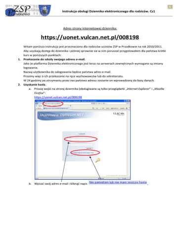 1 Instrukcja obsługi Dziennika elektronicznego dla rodziców. Cz1 Adres strony internetowej dziennika: https://uonet.vulcan.net.pl/008198 Witam poniższa instrukcja jest przeznaczona dla rodziców uczniów ZSP w Przodkowie na rok 2010/2011. Aby uzyskają dostęp do dziennika i później sprawnie sie w nim poruszać przygotowałem dla państwa krótki kurs w poniższych punktach: 1. Przekazanie do szkoły swojego adresu e-mail. Jako że platforma Dziennika elektronicznego jest teraz na serwerach zewnętrznych wymagane są zmiany logowania. Nazwą użytkownika do zalogowania będzie państwa adres e-mail. Prosimy więc o ich przekazanie na ręce wychowawców lub do sekretariatu. W 24 godziny po otrzymaniu przez nas państwa adresu zostanie on wprowadzony do bazy danych. 2. Uzyskanie hasła. a. Proszę wejść na stronę dziennika (obsługiwane są tylko przeglądarki „Internet Explorer” i „Mozilla Firefox”: https://uonet.vulcan.net.pl/008198 b. Wpisać swój adres e-mail i kliknąć napis , 2 Instrukcja obsługi Dziennika elektronicznego dla rodziców. Cz1 c. Jeżeli pojawi się czerwony napis „Jednorazowy link umożliwiający zmianę hasła został wysłany jako wiadomość e-mail” spowoduje to wysłanie na nasz adres listu z odnośnikiem do witryny nadającej hasła. d. Jednak gdy pojawi się napis „Niepoprawna nazwa użytkownika lub hasło” oznacza to że albo: * jest źle wpisany adres e-mail (sprawdzić i poprawić) * adres nie został jeszcze dodany do bazy danych (spróbować później) * adres został błędnie podany do bazy danych (jeżeli nie będą mogli się państwo zalogować przez klika dni prosimy o kontakt ze szkołą). 3 Instrukcja obsługi Dziennika elektronicznego dla rodziców. Cz1 e. Proszę się zalogować na swoją pocztę elektroniczną i znaleźć list od UONET z tematem „https://uonet.vulcan.net.pl/008198/, zmiana/nadanie hasła”. Na dole listu jest odnośnik w kolorze niebieskim który należy kliknąć prawym klawiszem myszki... f. Zostaniemy przeniesieni na stronę zmiany hasła. Wpisujemy tu nasze hasło dwukrotnie. Cechy hasła: *- długość hasła: co najmniej 8 *- liczba wielkich liter: co najmniej 1 *- liczba cyfr: co najmniej 1 4 Instrukcja obsługi Dziennika elektronicznego dla rodziców. Cz1 g. Po wprowadzeniu hasła pojawi sie potwierdzenie i możliwość powrotu na stronę startową dziennika W TEN SPOSÓB UZYSKALI PAŃSTWO HASŁO DO LOGOWANIA SIĘ NA DZIENNIK ELEKTRONICZNY. 3. Mając te dane możemy się zalogować. Wchodzimy na stronę dziennika: https://uonet.vulcan.net.pl/008198 wpisujemy nasz adres e-mail i wcześniej wybrane sobie hasło...i klikamy na przycisk „Logowanie” 5 Instrukcja obsługi Dziennika elektronicznego dla rodziców. Cz1 4. Po zalogowaniu się pojawia sie nam podstawowe informacje dotyczące naszego ucznia poukładane w zakładkach. Gdy posiadamy w szkole więcej niż jedno dziecko rozwijamy listę dziecko i wybieramy jedno z nich... Szczegółowa instrukcja obsługi jeżeli będą państwo mieli państwo jakieś pytania zostanie opracowane w późniejszym terminie. W razie pytań lub niejasności proszę o kontakt: e-mail: [email protected] lub poprzez szkołę pozdrawiam Damian Szczygieł