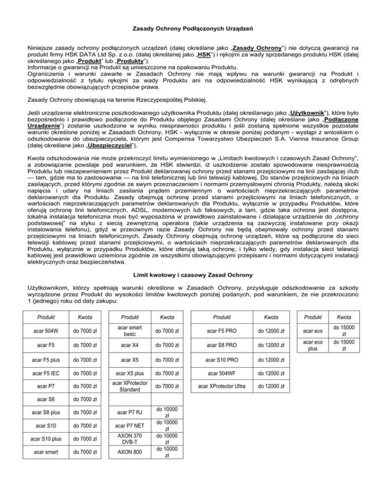 Zasady Ochrony Podłączonych Urządzeń Niniejsze zasady ochrony podłączonych urządzeń (dalej określane jako „Zasady Ochrony”) nie dotyczą gwarancji na produkt firmy HSK DATA Ltd Sp. z o.o. (dalej określanej jako „HSK”) i rękojmi za wady sprzedanego produktu HSK (dalej określanego jako „Produkt” lub „Produkty”). Informacje o gwarancji na Produkt są umieszczone na opakowaniu Produktu. Ograniczenia i warunki zawarte w Zasadach Ochrony nie mają wpływu na warunki gwarancji na Produkt i odpowiedzialność z tytułu rękojmi za wady Produktu ani na odpowiedzialność HSK wynikającą z odrębnych bezwzględnie obowiązujących przepisów prawa. Zasady Ochrony obowiązują na terenie Rzeczypospolitej Polskiej. Jeśli urządzenie elektroniczne poszkodowanego użytkownika Produktu (dalej określanego jako „Użytkownik”), które było bezpośrednio i prawidłowo podłączone do Produktu objętego Zasadami Ochrony (dalej określane jako „Podłączone Urządzenie”) zostanie uszkodzone w wyniku niesprawności produktu i jeśli zostaną spełnione wszystkie pozostałe warunki określone poniżej w Zasadach Ochrony, HSK - wyłącznie w okresie poniżej podanym - wystąpi z wnioskiem o odszkodowanie do ubezpieczyciela, którym jest Compensa Towarzystwo Ubezpieczeń S.A. Vienna Insurance Group (dalej określane jako „Ubezpieczyciel”). Kwota odszkodowania nie może przekroczyć limitu wymienionego w „Limitach kwotowych i czasowych Zasad Ochrony”, a zobowiązanie powstaje pod warunkiem, że HSK stwierdzi, iż uszkodzenie zostało spowodowane niesprawnością Produktu lub niezapewnieniem przez Produkt deklarowanej ochrony przed stanami przejściowymi na linii zasilającej i/lub — tam, gdzie ma to zastosowanie — na linii telefonicznej lub linii telewizji kablowej. Do stanów przejściowych na liniach zasilających, przed którymi zgodnie ze swym przeznaczeniem i normami przemysłowymi chronią Produkty, należą skoki napięcia i udary na liniach zasilania prądem przemiennym o wartościach nieprzekraczających parametrów deklarowanych dla Produktu. Zasady obejmują ochronę przed stanami przejściowymi na liniach telefonicznych, o wartościach nieprzekraczających parametrów deklarowanych dla Produktu, wyłącznie w przypadku Produktów, które oferują ochronę linii telefonicznych, ADSL, modemowych lub faksowych, a tam, gdzie taka ochrona jest dostępna, lokalna instalacja telefoniczna musi być wyposażona w prawidłowo zainstalowane i działające urządzenie do „ochrony podstawowej” na styku z siecią zewnętrzną operatora (takie urządzenia są zazwyczaj instalowane przy okazji instalowania telefonu), gdyż w przeciwnym razie Zasady Ochrony nie będą obejmowały ochrony przed stanami przejściowymi na liniach telefonicznych. Zasady Ochrony obejmują ochronę urządzeń, które są podłączone do sieci telewizji kablowej przed stanami przejściowymi, o wartościach nieprzekraczających parametrów deklarowanych dla Produktu, wyłącznie w przypadku Produktów, które oferują taką ochronę, i tylko wtedy, gdy instalacja sieci telewizji kablowej jest prawidłowo uziemiona zgodnie ze wszystkimi obowiązującymi przepisami i normami dotyczącymi instalacji elektrycznych oraz bezpieczeństwa. Limit kwotowy i czasowy Zasad Ochrony Użytkownikom, którzy spełniają warunki określone w Zasadach Ochrony, przysługuje odszkodowanie za szkody wyrządzone przez Produkt do wysokości limitów kwotowych poniżej podanych, pod warunkiem, że nie przekroczono 1 (jednego) roku od daty zakupu: Produkt Kwota Produkt Kwota Produkt Kwota Produkt acar 504W do 7000 zł acar smart basic do 7000 zł acar F5 PRO do 12000 zł acar eco acar F5 do 7000 zł acar X4 do 7000 zł acar S8 PRO do 12000 zł acar eco plus acar F5 plus do 7000 zł acar X5 do 7000 zł acar S10 PRO do 12000 zł acar F5 IEC do 7000 zł acar X5 plus do 7000 zł acar 504WF do 12000 zł acar P7 do 7000 zł acar XProtector Standard do 7000 zł acar XProtector Ultra do 12000 zł acar S8 do 7000 zł acar S8 plus do 7000 zł acar P7 RJ acar S10 do 7000 zł acar P7 NET acar S10 plus do 7000 zł AXON 370 DVB-T acar smart do 7000 zł AXON 800 do 10000 zł do 10000 zł do 10000 zł do 10000 zł Kwota do 15000 zł do 15000 zł Warunki obowiązywania Zasad Ochrony 1. 2. 3. 4. 5. 6. 7. 8. 9. 10. 11. 12. 13. Zasady Ochrony obejmują tylko modele Produktów wymienione w „Limitach kwotowych i czasowych Zasad Ochrony”. Użytkownik musi posiadać dokument zakupu Produktu z datą sprzedaży. Wszystkie Podłączone Urządzenia muszą być zaopatrzone znak CE. Produkt musi być podłączony do prawidłowo zainstalowanego i uziemionego gniazda sieciowego; niedozwolone jest używanie przedłużaczy, przejściówek, dodatkowych przewodów uziemiających ani złączy elektrycznych, z wyjątkiem innych standardowych produktów na napięcie 230 V. Instalacja nie może zawierać urządzeń do ochrony zasilania pochodzących od producentów innych niż HSK. Instalacja musi spełniać wszystkie przepisy i normy dotyczące instalacji elektrycznych oraz bezpieczeństwa. Zasady Ochrony nie obejmują uszkodzeń urządzeń elektronicznych wskutek stanów przejściowych na linii prądu przemiennego (linii telefonicznej lub telewizji kablowej, tam gdzie ma to zastosowanie) przekraczających parametry deklarowane dla Produktu. Zasady Ochrony nie obejmują uszkodzeń Podłączonych Urządzeń elektronicznych wskutek stanów przejściowych na liniach danych. Zasady Ochrony nie obejmują odtwarzania utraconych danych i ponownej instalacji oprogramowania. Zasady Ochrony nie obejmują uszkodzeń spowodowanych przyczynami innymi niż niesprawność Produktu lub stany przejściowe na liniach zasilania prądem przemiennym, z wyjątkiem uszkodzeń spowodowanych stanami przejściowymi na liniach telefonicznych lub sieci telewizji kablowej, które jednak objęte są tylko dla tych Produktów, które oferują ochronę takich linii. Zasady nie o