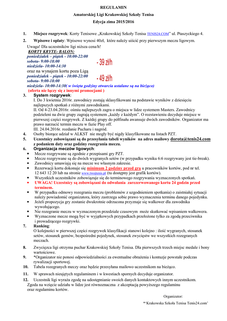 REGULAMIN Amatorskiej Ligi Krakowskiej Szkoły Tenisa Edycja zima 2015/2016 Miejsce rozgrywek: Korty Tenisowe „Krakowskiej Szkoły Tenisa TENIS24.COM” ul. Ptaszyckiego 4. 1. 2. Wpisowe i opłaty: Wpisowe wynosi 40zł, które należy uiścić przy pierwszym meczu ligowym. Uwaga! Dla uczestników ligi niższa cena/h! KORTY KRYTE- BALON: poniedziałek – piątek - 10:00-22:00 sobota- 9:00-18:00 niedziela- 10:00-14:30 oraz na wynajem kortu poza Ligą poniedziałek – piątek - 10:00-22:00 sobota- 9:00-18:00 niedziela- 10:00-14:30( w święta godziny otwarcia ustalane są na bieżąco) (oferta nie łączy się z innymi promocjami ) 3. System rozgrywek: I. Do 3 kwietnia 2016r. zawodnicy zostają sklasyfikowani na podstawie wyników z dziesięciu najlepszych spotkań z różnymi zawodnikami. II. Od 4-23.04.2016r. ośmiu najlepszych zagra o miejsca w lidze systemem Masters. Zawodnicy podzieleni na dwie grupy zagrają systemem „każdy z każdym”. O rozstawieniu decyduje miejsce w pierwszej części rozgrywek. Z każdej grupy do półfinału awansuje dwóch zawodników. Organizator ma prawo narzucić termin meczu w fazie Play off. III. 24.04.2016r. rozdanie Pucharu i nagród. 4. Osoby biorące udział w ALKST nie mogły być nigdy klasyfikowane na listach PZT. 5. Uczestnicy zobowiązani są do przesyłania tabeli wyników na adres mailowy [email protected] z podaniem daty oraz godziny rozegrania meczu. 6. Organizacja meczów ligowych: Mecze rozgrywane są zgodnie z przepisami gry PZT. Mecze rozgrywane są do dwóch wygranych setów (w przypadku wyniku 6:6 rozgrywany jest tie-break). Zawodnicy umawiają się na mecze we własnym zakresie. Rezerwacji kortu dokonuje się minimum 2 godziny przed grą u pracowników kortów, pod nr tel. 12 643 12 20 lub na stronie www.twojtenis.pl (tu dostępny jest grafik kortów). Wszystkich uczestników zobowiązuje się do terminowego rozgrywania wyznaczonych spotkań. UWAGA! Uczestnicy są zobowiązani do odwołania zarezerwowanego kortu 24 godzin przed terminem. W przypadku odmowy rozegrania meczu (problemów z uzgodnieniem spotkania) o zaistniałej sytuacji należy powiadomić organizatora, który zastrzega sobie prawo wyznaczenia terminu danego pojedynku. Jeżeli propozycja gry zostanie dwukrotnie odrzucona przyznaje się walkower dla zawodnika wywołującego. Nie rozegranie meczu w wyznaczonym przedziale czasowym może skutkować wpisaniem walkowera. Wyznaczone mecze mogą być w wyjątkowych przypadkach przełożone tylko za zgodą przeciwnika i prowadzącego rozgrywki. 7. Ranking: O kolejności w pierwszej części rozgrywek klasyfikacji stanowi kolejno : ilość wygranych, stosunek setów, stosunek gemów, bezpośredni pojedynek, stosunek zwycięstw we wszystkich rozegranych meczach. 8. 9. 10. Zwycięzca ligi otrzyma puchar Krakowskiej Szkoły Tenisa. Dla pierwszych trzech miejsc medale i bony wartościowe. *Organizator nie ponosi odpowiedzialności za ewentualne obrażenia i kontuzje powstałe podczas rywalizacji sportowej. Tabela rozegranych meczy oraz będzie przesyłana mailowo uczestnikom na bieżąco. 11. W sprawach nieujętych regulaminem i w kwestiach spornych decyduje organizator. 12. Uczestnik ligi wyraża zgodę na udostępnianie swoich danych kontaktowych innym uczestnikom. Zgoda na wzięcie udziału w lidze jest równoznaczna z akceptacją powyższego regulaminu oraz regulaminu kortów. Organizator: *‘Krakowska Szkoła Tenisa Tenis24.com’