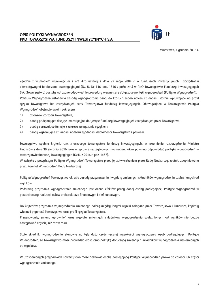 OPIS POLITYKI WYNAGRODZEŃ PKO TOWARZYSTWA FUNDUSZY INWESTYCYJNYCH S.A. Warszawa, 4 grudnia 2016 r. Zgodnie z wymogiem wynikającym z art. 47a ustawy z dnia 27 maja 2004 r. o funduszach inwestycyjnych i zarządzaniu alternatywnymi funduszami inwestycyjnymi (Dz. U. Nr 146, poz. 1546 z późn. zm.) w PKO Towarzystwie Funduszy Inwestycyjnych S.A. (Towarzystwo) zostały wdrożone odpowiednie procedury wewnętrzne dotyczące polityki wynagrodzeń (Polityka Wynagrodzeń). Polityka Wynagrodzeń ustanawia zasady wynagradzania osób, do których zadań należą czynności istotnie wpływające na profil ryzyka Towarzystwa lub zarządzanych przez Towarzystwo funduszy inwestycyjnych. Obowiązująca w Towarzystwie Polityka Wynagrodzeń obejmuje swoim zakresem: 1) członków Zarządu Towarzystwa; 2) osoby podejmujące decyzje inwestycyjne dotyczące funduszy inwestycyjnych zarządzanych przez Towarzystwo; 3) osoby sprawujące funkcje z zakresu zarządzania ryzykiem; 4) osoby wykonujące czynności nadzoru zgodności działalności Towarzystwa z prawem. Towarzystwo spełnia kryteria tzw. znaczącego towarzystwa funduszy inwestycyjnych, w rozumieniu rozporządzenia Ministra Finansów z dnia 30 sierpnia 2016 roku w sprawie szczegółowych wymagań, jakim powinna odpowiadać polityka wynagrodzeń w towarzystwie funduszy inwestycyjnych (Dz.U. z 2016 r. poz. 1487). W związku z powyższym Polityka Wynagrodzeń Towarzystwa przed jej zatwierdzeniem przez Radę Nadzorczą, została zaopiniowana przez Komitet Wynagrodzeń Rady Nadzorczej. Polityka Wynagrodzeń Towarzystwa określa zasady przyznawania i wypłaty zmiennych składników wynagrodzenia uzależnionych od wyników. Podstawą przyznania wynagrodzenia zmiennego jest ocena efektów pracy danej osoby podlegającej Polityce Wynagrodzeń w postaci oceny realizacji celów o charakterze finansowym i niefinansowym. Do kryteriów przyznania wynagrodzenia zmiennego należą między innymi wyniki osiągane przez Towarzystwo i Fundusze, kapitały własne i płynność Towarzystwa oraz profil ryzyka Towarzystwa. Przyznawanie, zmiana uprawnień oraz wypłata zmiennych składników wynagrodzenia uzależnionych od wyników nie będzie następować częściej niż raz w roku. Stałe składniki wynagrodzenia stanowią na tyle dużą część łącznej wysokości wynagrodzenia osób podlegających Polityce Wynagrodzeń, że Towarzystwo może prowadzić elastyczną politykę dotyczącą zmiennych składników wynagrodzenia uzależnionych od wyników. W uzasadnionych przypadkach Towarzystwo może pozbawić osobę podlegającą Polityce Wynagrodzeń prawa do całości lub części wynagrodzenia zmiennego. 1 Zgodnie z Polityką Wynagrodzeń 50% wartości zmiennych składników wynagrodzenia uzależnionych od wyników wypłacane jest w instrumencie finansowym, to jest jednostkach uczestnictwa lub certyfikatach inwestycyjnych funduszy inwestycyjnych zarządzanych przez Towarzystwo. Nabycie praw do wypłaty 40% wartości wynagrodzenia zmiennego uzależnionego od wyników podlega odroczeniu. Wypłata odroczonej części wynagrodzenia zmiennego następuje w ratach, przy czym wypłata pierwszej raty następuje po upływie 12 miesięcy od dnia ustalenia łącznej wysokości wynagrodzenia uzależnionego od wyników. Zmienne składniki wynagrodzenia uzależnione od wyników mogą być przyznawane lub wypłacane, gdy ich przyznanie lub wypłacenie nie ograniczy zdolności Towarzystwa do utrzymania odpowiedniej bazy kapitałowej. Zmienne składniki wynagrodzenia, do których zostały już nabyte uprawnienia podlegają okresowi wstrzymania. Zgodnie z Polityką Wynagrodzeń osoby jej podlegające są zobowiązane do niepodejmowania działań mających na celu podważenie skutków stosowania względem nich tej polityki. Zakazane jest przyznawanie gwarantowanego wynagrodzenia zmiennego, z zastrzeżeniem że wynagrodzenie tego rodzaju może zostać ustalone jedynie w wyjątkowych sytuacjach np. nawiązania zatrudnienia i wyłącznie dla pierwszego roku zatrudnienia. PKO Towarzystwo Funduszy Inwestycyjnych SA, ul. Chłodna 52, 00-872 Warszawa; tel: 022 358 56 00, fax: 022 358 56 01; www.pkotfi.pl Spółka zarejestrowana w Rejestrze Przedsiębiorców prowadzonym przez Sąd Rejestrowy dla m.st. Warszawy, XIII Wydział Gospodarczy Krajowego Rejestru Sądowego pod numerem 0000019384. Kapitał zakładowy 18.000.000 złotych. NIP 526-17-88-449 Strona 2/2