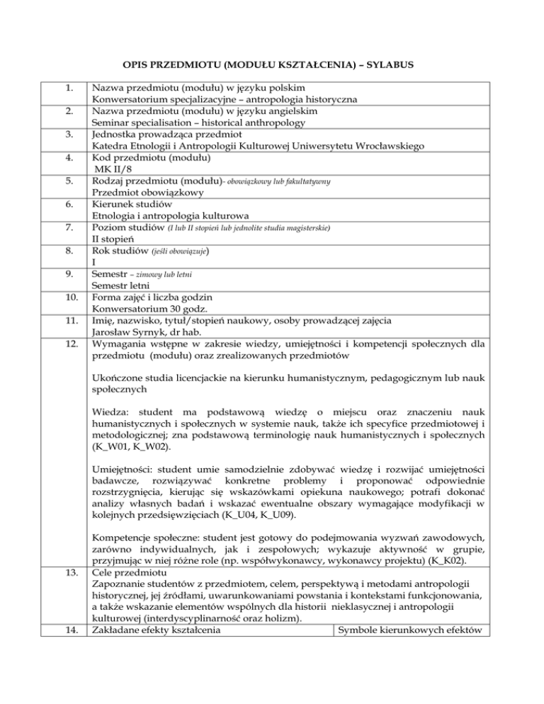 OPIS PRZEDMIOTU (MODUŁU KSZTAŁCENIA) – SYLABUS 1. 2. 3. 4. 5. 6. 7. 8. 9. 10. 11. 12. Nazwa przedmiotu (modułu) w języku polskim Konwersatorium specjalizacyjne – antropologia historyczna Nazwa przedmiotu (modułu) w języku angielskim Seminar specialisation – historical anthropology Jednostka prowadząca przedmiot Katedra Etnologii i Antropologii Kulturowej Uniwersytetu Wrocławskiego Kod przedmiotu (modułu) MK II/8 Rodzaj przedmiotu (modułu)- obowiązkowy lub fakultatywny Przedmiot obowiązkowy Kierunek studiów Etnologia i antropologia kulturowa Poziom studiów (I lub II stopień lub jednolite studia magisterskie) II stopień Rok studiów (jeśli obowiązuje) I Semestr – zimowy lub letni Semestr letni Forma zajęć i liczba godzin Konwersatorium 30 godz. Imię, nazwisko, tytuł/stopień naukowy, osoby prowadzącej zajęcia Jarosław Syrnyk, dr hab. Wymagania wstępne w zakresie wiedzy, umiejętności i kompetencji społecznych dla przedmiotu (modułu) oraz zrealizowanych przedmiotów Ukończone studia licencjackie na kierunku humanistycznym, pedagogicznym lub nauk społecznych Wiedza: student ma podstawową wiedzę o miejscu oraz znaczeniu nauk humanistycznych i społecznych w systemie nauk, także ich specyfice przedmiotowej i metodologicznej; zna podstawową terminologię nauk humanistycznych i społecznych (K_W01, K_W02). Umiejętności: student umie samodzielnie zdobywać wiedzę i rozwijać umiejętności badawcze, rozwiązywać konkretne problemy i proponować odpowiednie rozstrzygnięcia, kierując się wskazówkami opiekuna naukowego; potrafi dokonać analizy własnych badań i wskazać ewentualne obszary wymagające modyfikacji w kolejnych przedsięwzięciach (K_U04, K_U09). 13. 14. Kompetencje społeczne: student jest gotowy do podejmowania wyzwań zawodowych, zarówno indywidualnych, jak i zespołowych; wykazuje aktywność w grupie, przyjmując w niej różne role (np. współwykonawcy, wykonawcy projektu) (K_K02). Cele przedmiotu Zapoznanie studentów z przedmiotem, celem, perspektywą i metodami antropologii historycznej, jej źródłami, uwarunkowaniami powstania i kontekstami funkcjonowania, a także wskazanie elementów wspólnych dla historii nieklasycznej i antropologii kulturowej (interdyscyplinarność oraz holizm). Zakładane efekty kształcenia Symbole kierunkowych efektów - posiada wiedzę o różnych formach postrzegania/rozumienia czasu/przeszłości/historii na przestrzeni wieków w różnych kulturach świata; dysponuje wiedzą w zakresie pojęć stosowanych w nieklasycznej historiografii (szczegółowo wymienione w punkcie 15) 15. kształcenia K_W05; - ma podstawową wiedzę o historycznym aspekcie funkcjonowania człowieka i historyczności badań naukowych K_W08; - posiada podstawową wiedzę w zakresie metod stosowanych w obrębie historiografii klasycznej i nieklasycznej w tym krytyki źródeł, opisu gęstego, ANT, wywiad pogłębiony K_W09 - potrafi zdefiniować pojęcie antropologia historyczna, rozróżnia rodzaje historiografii, potrafi wskazać podobieństwa pomiędzy historią i antropologią kulturową K_U01; - posiada umiejętność wykorzystywania, integrowania oraz zastosowania wiedzy z zakresu antropologii historycznej K_U05; - posiada umiejętność merytorycznego argumentowania, z wykorzystaniem własnych poglądów oraz poglądów innych badaczy, pojęć poznanych w trakcie zajęć i formułowania wniosków oraz tworzenia syntetycznych podsumowań z wykorzystaniem wiedzy i umiejętności wyniesionych z zajęć antropologii historycznej K_U07 - potrafi odpowiednio określić priorytety służące realizacji określonego przez siebie lub innych zadania (np. badawczego, edukacyjnego, popularyzatorskiego) K_K03; - poprzez pogłębioną wiedzę z zakresu antropologii K_K06 historycznej i rozumienie pojęć tożsamość, polityka historyczna przez co ma dodatkowe kompetencje do aktywnego uczestnictwa w działaniach na rzecz zachowania dziedzictwa kulturowego regionu, kraju, Europy i świata, jest otwarty na inicjatywy organizacji pozarządowych (NGO) Treści programowe 1. Założenia ontologiczno-epistemologiczne (byt, ontologia, epistemologia, koncepcje prawdy, poznanie utajone, przypadek, chaos, kreacjonizm, emanatyzm, materializm) 2. Status naukowy historii (definicje nauki, paradygmat, Thomas Kuhn, dedukcja- 16. korelacja-opis, prawda, obiektywizm, narracja historyczna, hermeneutyka) 3. Oblicza historiografii (Herodot, Giambattisto Vico, Leopold von Ranke, szkoła Annales, historiografia klasyczna i nieklasyczna, postmodernizm) 4. Zwrot językowy (Hayden White, tropologia, semiotyka) 5. Przedmiot, perspektywa i metoda antropologii historycznej 6. Pamięć i tożsamość (mneme i anamnesis, Arystoteles, Platon, pamięć kulturowa, pamięć komunikatywna, pamięć społeczna, postpamięć, miejsca pamięci, tożsamość, polityka historyczna) 7. Komunikacja: język-metafora-mit (mit, znak, signifiant, signifie, mit fundamentalny, jednia, sygnał) 8. Jednostka-społeczeństwo-władza (definicje władzy, biowładza, przemoc symboliczna, figura „kozła ofiarnego”, legitymacja władzy) 9. Genocide Studies oraz zwrot etyczny (Holokaust, ludobójstwo) 10. Studia postkolonialne (teoria postkolonialna) 11. Mikrohistoria (Pascal, historie grup wykluczonych, marginalizowanych, mniejszości; mikrohistoria vs. makrohistoria) 12. Współczesna biografistyka (ujęcie socjologiczne, historyczne, antropologiczne, autobiografie) 13. Metoda antropologii historycznej: od krytyki źródeł do „opisu gęstego” (krytyka źródłowa, „opis gęsty”, ANT, teoria gier, semiotyka, wywiad pogłębiony) 14. Perspektywy antropologii historycznej (praktyczne zastosowania, antropolog jako tłumacz) Zalecana literatura: Ad. 15.1 Stary Testament, Ks. Wyjścia, 3,14. Heller Michał, Filozofia przypadku. Kosmiczna fuga z preludium i codą, Kraków 2015, s. 5-12, 19-34. Underwood G., Wright J. E.H., Poznanie z udziałem świadomości i bez udziału św