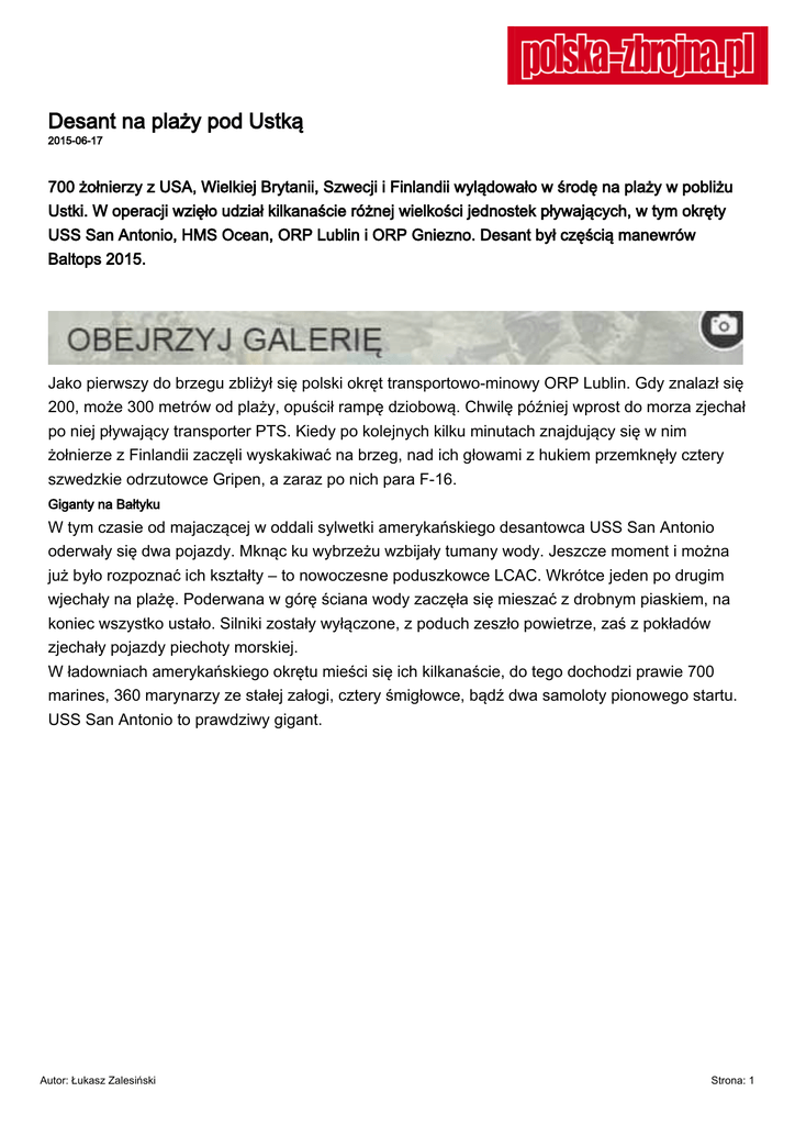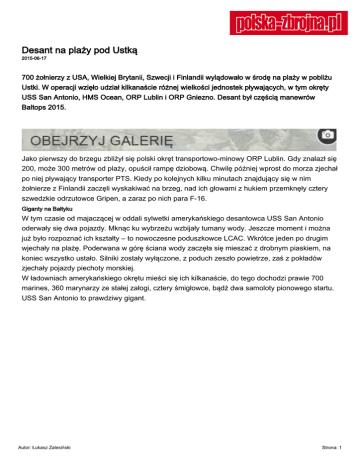 Desant na plaży pod Ustką 2015-06-17 700 żołnierzy z USA, Wielkiej Brytanii, Szwecji i Finlandii wylądowało w środę na plaży w pobliżu Ustki. W operacji wzięło udział kilkanaście różnej wielkości jednostek pływających, w tym okręty USS San Antonio, HMS Ocean, ORP Lublin i ORP Gniezno. Desant był częścią manewrów Baltops 2015. Jako pierwszy do brzegu zbliżył się polski okręt transportowo-minowy ORP Lublin. Gdy znalazł się 200, może 300 metrów od plaży, opuścił rampę dziobową. Chwilę później wprost do morza zjechał po niej pływający transporter PTS. Kiedy po kolejnych kilku minutach znajdujący się w nim żołnierze z Finlandii zaczęli wyskakiwać na brzeg, nad ich głowami z hukiem przemknęły cztery szwedzkie odrzutowce Gripen, a zaraz po nich para F-16. Giganty na Bałtyku W tym czasie od majaczącej w oddali sylwetki amerykańskiego desantowca USS San Antonio oderwały się dwa pojazdy. Mknąc ku wybrzeżu wzbijały tumany wody. Jeszcze moment i można już było rozpoznać ich kształty – to nowoczesne poduszkowce LCAC. Wkrótce jeden po drugim wjechały na plażę. Poderwana w górę ściana wody zaczęła się mieszać z drobnym piaskiem, na koniec wszystko ustało. Silniki zostały wyłączone, z poduch zeszło powietrze, zaś z pokładów zjechały pojazdy piechoty morskiej. W ładowniach amerykańskiego okrętu mieści się ich kilkanaście, do tego dochodzi prawie 700 marines, 360 marynarzy ze stałej załogi, cztery śmigłowce, bądź dwa samoloty pionowego startu. USS San Antonio to prawdziwy gigant. Autor: Łukasz Zalesiński Strona: 1 Tymczasem amerykańskiemu desantowcowi wcale nie ustępuje kolejny okręt biorący udział w operacji – śmigłowcowiec HMS Ocean z Wielkiej Brytanii. Stanowi on bazę dla 18 różnego typu helikopterów, posiada też na wyposażeniu cztery kutry desantowe. Kiedy przyszedł sygnał do lądowania, z pokładu brytyjskiej jednostki wzbiły się w powietrze między innymi śmigłowce Lynx. PTS wydobyty z dna Na oddziały lądujące w Ustce czekali żołnierze 7 Brygady Obrony Wybrzeża. To właśnie oni podczas ćwiczenia wcielili się w rolę sił przeciwnika. – Desant morski to jedna z najbardziej skomplikowanych operacji, jakie można sobie wyobrazić. Największym wyzwaniem jest czas. Aby całość się udała, każdy detal musi być idealnie dograny – podkreśla kadm. Roy Kitchener z Dowództwa Morskich Sił Uderzeniowych i Wsparcia NATO (z ang. STRIKFORNATO), które organizuje manewry Baltops 2015. Jak dodaje, operacja w Ustce zakończyła się sukcesem. Choć nie obeszło się bez niespodziewanych wydarzeń. Po przerzuceniu na brzeg fińskich żołnierzy, wracający na okręt PTS został zalany przez fale. W efekcie pojazd poszedł na dno. – Dwóch znajdujących się w nim żołnierzy wyciągnęli z wody ratownicy, którzy zabezpieczali desant z pontonów – informuje mjr Michał Romańczuk z Dowództwa Generalnego Rodzajów Sił Zbrojnych. – Życie żołnierzy nie było zagrożone, tym bardziej, że zgodnie z procedurami mieli na sobie kamizelki – dodaje. PTS spoczął na głębokości trzech metrów, mniej więcej sto metrów od brzegu. – Zostanie wydobyty, kiedy tylko pozwoli na to stan morza. Wówczas też okaże się, czy będzie go można nadal używać. Okoliczności zdarzenia zbada specjalna komisja, choć biorąc pod uwagę skalę ćwiczenia to naprawdę drobny incydent – Autor: Łukasz Zalesiński Strona: 2 zapowiadał mjr Romańczuk. Z wydobyciem nie czekano na koniec ćwiczeń, PTS wyciągnięto z morza jeszcze tego samego popołudnia. Modelowy przykład współpracy Przeprowadzoną dziś operację desantową wysoko ocenił również gen. Philip Breedlove, dowódca wojsk NATO w Europie, który gościł w Ustce. – Jestem dumny z żołnierzy. Prawdę mówiąc przed rozpoczęciem operacji wiedziałem o niej tyle, że nie powinienem być zaskoczony. Ale byłem – przyznaje gen. Breedlove. Według niego, dziś mieliśmy okazję oglądać modelowy przykład współpracy pomiędzy żołnierzami z różnych krajów i różnych rodzajów wojsk. Gen. Breedlove odniósł się też do słów prezydenta Rosji Władimira Putina, który zapowiedział zwiększenie rosyjskiego arsenału jądrowego. – Te ćwiczenia pokazują naszą gotowość do odpowiedzi na tego rodzaju retorykę. Musimy umieć ze sobą współpracować właśnie z powodu tego typu postawy – zaznaczył gen. Breedlove. Manewry Baltops 2015 rozpoczęły się w ubiegłym tygodniu. To największe w tym roku ćwiczenia NATO na Bałtyku. Bierze w nich udział 17 państw, które na manewry wysłały 49 okrętów, ponad 60 samolotów i śmigłowców, 5600 żołnierzy i marynarzy. Kilka dni temu desant trenowany był na wybrzeżu Szwecji. Manewry potrwają do końca tygodnia, a podsumowane zostaną w Niemczech. Baltops 2015 to jedno z czterech ćwiczeń pod wspólnym kryptonimem Allied Shield. Trzy z nich prowadzone są między innymi na terenie Polski. W ten sposób NATO realizuje zapowiedź wzmocnienia tak zwanej wschodniej flanki. – Będziemy obecni w tej części świata, ale nasze działania będzie cechowała otwartość i przejrzystość – zapewnia gen. Breedlove. Autor: Łukasz Zalesiński Strona: 3