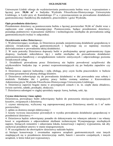 OGŁOSZENIE Uniwersytet Łódzki oferuje do wydzierżawienia pomieszczenia bufetu wraz z wyposażeniem o łącznej pow. 58,06 m2 w budynku Wydziału Filozoficzno-Historycznego Uniwersytetu Łódzkiego, w Łodzi przy ul. Kamińskiego 27 a, z przeznaczeniem na prowadzenie działalności gastronomicznej i handlowej dla studentów, pracowników i gości Wydziału. Opis przedmiotu dzierżawy: Przedmiotem dzierżawy są pomieszczenia bufetu o łącznej powierzchni 58,06 m2 (bufet wraz z zapleczem oraz częścią konsumpcyjną). Pomieszczenia, będące przedmiotem dzierżawy, posiadają podstawowe wyposażenie meblowe i technologiczne niezbędne do prowadzenia usług gastronomicznych (wykaz w załączniku). Oczekiwania wobec Dzierżawcy: 1. Wydzierżawiający oczekuje, że Dzierżawca posiada zarejestrowaną działalność gospodarczą w zakresie świadczenia usług gastronomicznych i legitymuje się co najmniej rocznym doświadczeniem w prowadzeniu takiej działalności. 2. W razie potrzeby Dzierżawca doposaży bufet w profesjonalny sprzęt gastronomiczny (typu ekspresy, kuchenki mikrofalowe itp.) i meble niezbędne do prowadzenia działalności gastronomiczno-handlowej z uwzględnieniem walorów estetycznych i odpowiedniego poziomu świadczonych usług. 3. Działalność prowadzona przez Dzierżawcę nie będzie powodować uciążliwości dla użytkowników budynku (np. w postaci rozprzestrzeniających się po budynku zapachów czy hałasu). 4. Dzierżawca zapewni kulturalną i miłą obsługę, przy czym liczba pracowników w bufecie powinna gwarantować płynną obsługę klientów. 5. Dzierżawca zobowiązuje się do prowadzenia działalności w dni powszednie oraz soboty i niedziele. Dokładne dni i godziny pracy bufetu zostaną ustalone z Kierownikiem Administracyjnym Wydziału Filozoficzno-Historycznego Uniwersytetu Łódzkiego. 6. Dzierżawca zapewni bogate menu w przystępnych cenach ( m. in. ciepłe dania obiadowe, świeże surówki, sałatki, przekąski, słodycze). 7. Dzierżawca udostępni w ciągłej sprzedaży napoje: kawę, herbatę, soki, itp. Czynsz dzierżawny i inne opłaty Dzierżawca, prowadzący bufet zobowiązany będzie do ponoszenia miesięcznie następujących kosztów, związanych z dzierżawą: 1. czynsz miesięczny, wyliczony wg zaproponowanej przez Dzierżawcę stawki za 1 m2 netto powierzchni,* 2. opłata za dostawę energii elektrycznej,** 3. koszty wywozu nieczystości powstałych w wyniku prowadzenia działalności gospodarczej w przedmiocie dzierżawy.*** 4. Dzierżawca będzie zobowiązany ponadto do dokonywania we własnym zakresie i na własny koszt w uzgodnieniu z odpowiednimi służbami technicznymi Wynajmującego niezbędnych napraw, bieżących remontów i odnawiania lokalu, konserwacji i naprawy wyposażenia, tak aby zachować przedmiot umowy w stanie niepogorszonym. 5. W szczególności do obowiązków dzierżawcy należało będzie: a) bieżąca konserwacja i ewentualna naprawa urządzeń gastronomicznych oraz innych znajdujących się w przedmiocie dzierżawy(np. mebli, baterii i zaworów czerpalnych, i innych urządzeń, w które lokal jest wyposażony), b) konserwacja i naprawa przewodów odpływowych urządzeń sanitarnych aż do pionów zbiorczych, c) konserwacja i naprawa osprzętu i zabezpieczeń instalacji elektrycznej, d) naprawa ewentualnych uszkodzeń tynków ścian i sufitów, e) konserwacja i naprawa podłóg i posadzek, f) konserwacja i naprawa stolarki okiennej i drzwiowej, g) obsługa czystościowo-porządkowa przedmiotu dzierżawy, czyli m. in: - sprzątanie, - przeprowadzanie okresowych dezynsekcji i deratyzacji, - czyszczenie kanalizacji. 6. Wszelkich prac adaptacyjnych Dzierżawca dokonuje na własny koszt i we własnym zakresie po uprzednim pisemnym uzgodnieniu warunków z odpowiednimi służbami technicznymi Wynajmującego. Dotyczy to także wszelkiego rodzaju reklam umieszczanych wewnątrz i na zewnątrz budynku. W razie rozwiązania umowy Dzierżawcy nie będzie przysługiwał zwrot nakładów poniesionych na remont i adaptację przedmiotu dzierżawy. 7. Kalkulując stawkę czynszu należy uwzględnić, specyfikę funkcjonowania szkoły wyższej (m. in. spadek przychodów ze sprzedaży w okresie przerw międzysemestralnych i wakacyjnych). W okresie od lipca do września trwa przerwa wakacyjna i w obiektach przebywają praktyczni wyłącznie pracownicy. 8. Wynajmujący nie przewiduje zmniejszenia wysokości czynszu w okresach przerw międzysemestralnych i świątecznych z wyjątkiem okresu wakacyjnego (lipiec-wrzesień) . Obniżka w ww. okresie do uzgodnienia; zwyczajowo przyjęta jest obniżka do 50% czynszu podstawowego. Pozostałe opłaty związane z przedmiotem dzierżawy nie podlegają obniżce. * W czynszu zawarta jest opłata za dzierżawę pomieszczeń i wyposażenia, centralne ogrzewanie, podatek od nieruchomości wg obowiązujących przepisów (w 2016 r. – 110,60 zł/m-c), opłata za gospodarowanie odpadami komunalnymi. ** Opłaty za energię elektryczną Dzierżawca wnosił będzie na podstawie odrębnych faktur wystawianych przez Dział Gospodarki Energetycznej wg rzeczywistego zużycia (na podstawie wskazań podlicznika), *** Dzierżawca zobowiązany będzie do podpisania stosownej umowy z odpowiednim podmiotem, zajmującym się utylizacją odpadów. Wymagania dotyczące oferty: Oferta opatrzona datą i podpisana przez osobę\osoby do tego upoważnione powinna zawierać co najmniej: 1. dane oferenta: a) w przypadku osób fizycznych, prowadzących działalność gospodarczą: imię, nazwisko, adres zamieszkania, nazwę działalności (firmę), adres wykonywania działalności, adres do korespondencji (jeżeli jest inny niż adres wykonywania działalności), NIP, b) w przypadku pozostałych jednostek występujących w obrocie prawnym: nazwę (firmę), adres siedziby, NIP, KRS, REGON, 2. Dane kontaktowe: telefon, e-mail, 3. Proponowany czynsz netto za 1 m2 powierzchni przedmiotu najmu, 4. Przykładowe menu wraz 