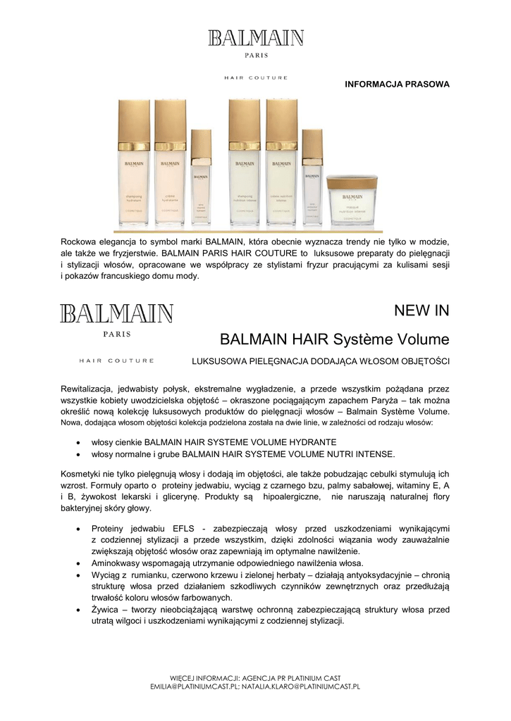 INFORMACJA PRASOWA Rockowa elegancja to symbol marki BALMAIN, która obecnie wyznacza trendy nie tylko w modzie, ale także we fryzjerstwie. BALMAIN PARIS HAIR COUTURE to luksusowe preparaty do pielęgnacji i stylizacji włosów, opracowane we współpracy ze stylistami fryzur pracującymi za kulisami sesji i pokazów francuskiego domu mody. NEW IN BALMAIN HAIR Système Volume LUKSUSOWA PIELĘGNACJA DODAJĄCA WŁOSOM OBJĘTOŚCI Rewitalizacja, jedwabisty połysk, ekstremalne wygładzenie, a przede wszystkim pożądana przez wszystkie kobiety uwodzicielska objętość – okraszone pociągającym zapachem Paryża – tak można określić nową kolekcję luksusowych produktów do pielęgnacji włosów – Balmain Système Volume. Nowa, dodająca włosom objętości kolekcja podzielona została na dwie linie, w zależności od rodzaju włosów: włosy cienkie BALMAIN HAIR SYSTEME VOLUME HYDRANTE włosy normalne i grube BALMAIN HAIR SYSTEME VOLUME NUTRI INTENSE. Kosmetyki nie tylko pielęgnują włosy i dodają im objętości, ale także pobudzając cebulki stymulują ich wzrost. Formuły oparto o proteiny jedwabiu, wyciąg z czarnego bzu, palmy sabałowej, witaminy E, A i B, żywokost lekarski i glicerynę. Produkty są hipoalergiczne, nie naruszają naturalnej flory bakteryjnej skóry głowy. Proteiny jedwabiu EFLS - zabezpieczają włosy przed uszkodzeniami wynikającymi z codziennej stylizacji a przede wszystkim, dzięki zdolności wiązania wody zauważalnie zwiększają objętość włosów oraz zapewniają im optymalne nawilżenie. Aminokwasy wspomagają utrzymanie odpowiedniego nawilżenia włosa. Wyciąg z rumianku, czerwono krzewu i zielonej herbaty – działają antyoksydacyjnie – chronią strukturę włosa przed działaniem szkodliwych czynników zewnętrznych oraz przedłużają trwałość koloru włosów farbowanych. Żywica – tworzy nieobciążającą warstwę ochronną zabezpieczającą struktury włosa przed utratą wilgoci i uszkodzeniami wynikającymi z codziennej stylizacji. WIĘCEJ INFORMACJI: AGENCJA PR PLATINIUM CAST [email protected]; [email protected] INFORMACJA PRASOWA BALMAIN HAIR SYSTEME VOLUME LINIA NUTRI INTENSE REWITALIZACJA DODAJĄCA OBJĘTOŚCI, DO WŁOSÓW NORMALNYCH I GRUBYCH BALMAIN HAIR SYSTEME VOLUME - SZAMPON NUTRI INTENSE Rewitalizujący szampon dodający objętości, do włosów normalnych/grubych POJ. 250 ml/ CENA: około: 140 PLN BALMAIN HAIR SYSTEME VOLUME - ODŻYWKA NUTRI INTENSE Rewitalizująca odżywka dodająca objętości, do włosów normalnych/grubych POJ.250 ml/ CENA: około: 150 PLN BALMAIN HAIR SYSTEME VOLUME SPRAY PROTECTEUR NOURRISSANT Spray rewitalizująco- ochronny, dodający włosom objętości, do włosów normalnych/grubych POJ.50 ml/ CENA: około: 130 PLN Rewitalizuje włosy i dodaje im objętości oraz skutecznie chroni przed przesuszeniem i uszkodzeniem ich struktury wynikającym z codziennej stylizacji (lokówki, prostownice). Spray należy stosować od nasady, aż po końce - na mokre lub suche włosy. BALMAIN HAIR SYSTEME VOLUME MASKA NUTRI INTENSE Rewitalizująca maska dodająca objętości, do włosów normalnych/grubych POJ.250 ml/ CENA: około: 160 PLN WIĘCEJ INFORMACJI: AGENCJA PR PLATINIUM CAST [email protected]; [email protected]
