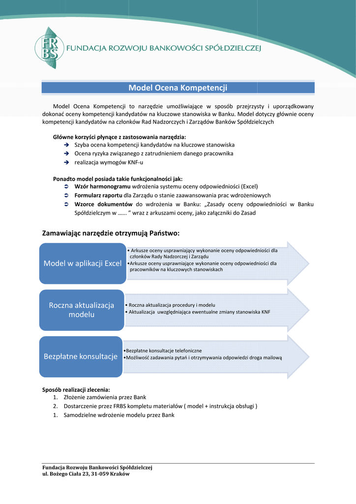 Model Ocena Kompetencji Model Ocena Kompetencji to narzędzie umożliwiające w sposób przejrzysty i uporządkowany dokonać oceny kompetencji kandydatów na kluczowe stanowiska w Banku. Model dotyczy głównie oceny kompetencji kandydatów na członków Rad Nadzorczych i Zarządów Banków Spółdzielczych Główne korzyści płynące z zastosowania narzędzia: Szyba ocena kompetencji kandydatów na kluczowe stanowiska Ocena ryzyka związanego z zatrudnieniem danego pracownika realizacja wymogów KNF-u KNF Ponadto model posiada takie funkcjonalności jak: Wzór harmonogramu wdrożenia systemu oceny odpowiedniości (Excel) Formularz raportu dla Zarządu o stanie zaawansowania prac wdrożeniowych Wzorce dokumentów do wdrożenia w Banku: „Zasady oceny odpowiedniości w Banku Spółdzielczym elczym w …... ” wraz z arkuszami oceny, jako załączniki do Zasad Zamawiając narzędzie dzie otrzymują Państwo: Model w aplikacji Excel Roczna aktualizacja modelu Bezpłatne konsultacje • Arkusze oceny usprawniający wykonanie oceny odpowiedniości dla członków Rady Nadzorczej i Zarządu •Arkusze oceny usprawniające wykonanie oceny odpowiedniości dla •Arkusze pracowników na kluczowych stanowiskach • Roczna aktualizacja procedury i modelu • Aktualizacja uwzględniająca ewentualne zmiany stanowiska KNF •Bezpłatne Bezpłatne konsultacje telefoniczne •Możliwość Możliwość zadawania pytań i otrzymywania odpowiedzi droga mailową Sposób realizacji zlecenia: 1. Złożenie zamówienia przez Bank 2. Dostarczenie przez FRBS kompletu materiałów ( model + instrukcja obsługi ) 1. Samodzielne wdrożenie modelu przez Bank Fundacja Rozwoju Bankowości Spółdzielczej ul. Bożego Ciała 23, 31-059 059 Kraków