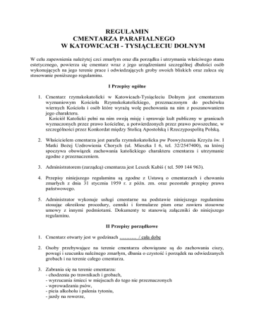 REGULAMIN CMENTARZA PARAFIALNEGO W KATOWICACH - TYSIĄCLECIU DOLNYM W celu zapewnienia należytej czci zmarłym oraz dla porządku i utrzymania właściwego stanu estetycznego, powierza się cmentarz wraz z jego urządzeniami szczególnej dbałości osób wykonujących na jego terenie prace i odwiedzających groby swoich bliskich oraz zaleca się stosowanie poniższego regulaminu. I Przepisy ogólne 1. Cmentarz rzymskokatolicki w Katowicach-Tysiącleciu Dolnym jest cmentarzem wyznaniowym Kościoła Rzymskokatolickiego, przeznaczonym do pochówku wiernych Kościoła i osób które wyrażą wolę pochowania na nim z poszanowaniem jego charakteru. Kościół Katolicki pełni na nim swoją misję i sprawuje kult publiczny w granicach wyznaczonych przez prawo kościelne, a potwierdzonych przez prawo powszechne, w szczególności przez Konkordat między Stolicą Apostolską i Rzeczypospolitą Polską. 2. Właścicielem cmentarza jest parafia rzymskokatolicka pw Poswyższenia Krzyża św. I Matki Bożej Uzdrowienia Chorych (ul. Mieszka I 6, tel. 32/2547400), na której spoczywa obowiązek zachowania katolickiego charakteru cmentarza i utrzymanie zgodne z przeznaczeniem. 3. Administratorem (zarządcą) cmentarza jest Leszek Kubiś ( tel. 509 144 963). 4. Przepisy niniejszego regulaminu są zgodne z Ustawą o cmentarzach i chowaniu zmarłych z dnia 31 stycznia 1959 r. z późn. zm. oraz pozostałe przepisy prawa państwowego. 5. Administrator wykonuje usługi cmentarne na podstawie niniejszego regulaminu stosując określone procedury, cenniki i formularze pism oraz zawiera stosowne umowy z innymi podmiotami. Dokumenty te stanowią załączniki do niniejszego regulaminu. II Przepisy porządkowe 1. Cmentarz otwarty jest w godzinach ………. / cała dobę 2. Osoby przebywające na terenie cmentarza obowiązane są do zachowania ciszy, powagi i szacunku należnego zmarłym, dbania o czystość i porządek na odwiedzanych grobach i na terenie całego cmentarza. 3. Zabrania się na terenie cmentarza: - chodzenia po trawnikach i grobach, - wyrzucania śmieci w miejscach do tego nie przeznaczonych - wprowadzania psów, - picia alkoholu i palenia tytoniu, - jazdy na rowerze, - wieszania reklam i rozmieszczania ulotek na nagrobkach, - handlowania i zarobkowania w inny sposób bez zgody Administratora, - wjeżdżania wszelkimi pojazdami mechanicznymi, za wyjątkiem uprawnionych, - wykonywania prac budowlanych i kamieniarskich bez zgody administratora, 4. Zwiędłe kwiaty, wieńce, chwasty, znicze i wszelkie odpadki należy usuwać z grobów i składać w miejscach do tego przeznaczonych. III Zasady wykonywania prac i usług na cmentarzu 1. Wykonywanie wszelkich robót budowlanych, rozbiórkowych, konserwatorskich, prac kamieniarskich, murarskich, kopania grobów, zmiany usytuowania grobów, grodzenia brukowanie, stawianie rzeźb, montaż ławek itp. muszą być wcześniej zaakceptowane przez Administratora, który wyda stosowne zezwolenie na piśmie. 2. Na ustawienie nagrobka konieczne jest uzyskanie pozwolenia Administratora. Należy przedstawić Administratorowi projekt rysunkowy celem stwierdzenia czy odpowiada wymogom przepisów o zakładaniu i pielęgnowaniu cmentarzy. 3. Uzyskane pisemne zezwolenie należy przekazać zakładowi kamieniarskiemu przed przystąpieniem do wykonania dzieła, ten zaś oddaje dokument Administratorowi po uprzednim uzgodnieniu z nim terminu prac, aby możliwy był nadzór nad rozpoczęciem i zakończeniem prac. 4. Zezwolenia są uzyskiwane przez rodzinę pochowanej osoby lub osobę upoważnioną – te osoby uiszczają należną opłatę. 5. Wszelkie roboty na terenie cmentarza mogą być wykonywane jedynie przez dysponentów miejsc grzebalnych, na zasadach określonych regulaminem, z zaznaczeniem, że dysponenci miejsc grzebalnych mogą wykonywać roboty we własnym zakresie lub zlecać je wybranym przez siebie wykonawcom. 6. W przypadku powierzenia przez dysponenta miejsca grzebalnego wykonania robót wybranemu wykonawcy – wykonawca przedkłada Administratorowi pisemne oświadczenie o powierzeniu wykonania robót określonemu wykonawcy. 7. Uprawniony wykonawca usług pogrzebowych i cmentarnych, który zamierza świadczyć usługi na terenie cmentarza winien przedstawić Administratorowi w formie odpisu dokumenty potwierdzające wpis do ewidencji działalności gospodarczej lub Krajowego Rejestru Sądowego. 8. Po zakończeniu robót wykonawca zobowiązany jest do niezwłocznego uprzątnięcia terenu z wywozem wszystkich materiałów i odpadów powstałych po robotach. 9. Wykonawcy ponoszą pełną odpowiedzialność za wszelkie szkody i straty wyrządzone w mieniu cmentarza i osób trzecich. Wykonawca ponosi wyłączną odpowiedzialność za działania i zaniechania swoich pracowników, realizujących prace i usługi na terenie cmentarza. 10. Usługi i prace kamieniarskie przy grobach mogą być wykonywane tylko w dni robocze od poniedziałku do piątku w godzinach od 8.00 do 15.00. 11. O zamierzonej ekshumacji należy powiadomić na piśmie Administratora cmentarza a) ekshumacja zwłok i szczątków dopuszczalna jest w okresie od 16 października do 15 kwietnia i przeprowadza się ją we wczesnych godzinach rannych, b) ekshumacja zwłok i szczątków może być dokonana : - na umotywowaną prośbę osób uprawnionych do pochowania zwłok za zezwoleniem właściwego państwowego inspektora sanitarnego, - na zarządzenie prokuratora lub sądu, - na podstawie decyzji właściwego państwowego inspektora sanitarnego, w razie zajęcia cmentarza na inny cel c) państwowy inspektor sanitarny może zezwolić na dokonanie ekshumacji w innym terminie niż określony w ppkt a. IV Zasady dysponowania grobem 1. Na cmentarzu mogą znajdować się: a) groby ziemne – tj. doły w ziemi, do których składa się trumnę ze zwłokami lub urnę i zasypuje ziemią, b) groby murowane – tj. doły, w których boki są murowane do poziomu gruntu, do których składa się trumnę ze zwłoka