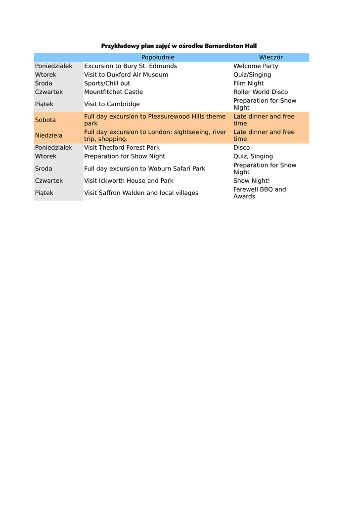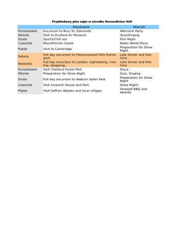 Przykładowy plan zajęć w ośrodku Barnardiston Hall Poniedziałek Wtorek Środa Czwartek Popołudnie Excursion to Bury St. Edmunds Visit to Duxford Air Museum Sports/Chill out Mountfitchet Castle Piątek Visit to Cambridge Poniedziałek Wtorek Full day excursion to Pleasurewood Hills theme park Full day excursion to London: sightseeing, river trip, shopping. Visit Thetford Forest Park Preparation for Show Night Środa Full day excursion to Woburn Safari Park Czwartek Visit Ickworth House and Park Piątek Visit Saffron Walden and local villages Sobota Niedziela Wieczór Welcome Party Quiz/Singing Film Night Roller World Disco Preparation for Show Night Late dinner and free time Late dinner and free time Disco Quiz, Singing Preparation for Show Night Show Night! Farewell BBQ and Awards