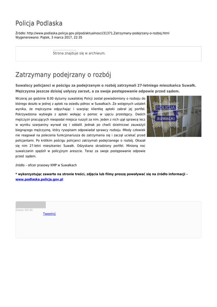 Policja Podlaska Źródło: http://www.podlaska.policja.gov.pl/pod/aktualnosci/31371,Zatrzymany-podejrzany-o-rozboj.html Wygenerowano: Piątek, 3 marca 2017, 22:35 Strona znajduje się w archiwum. Zatrzymany podejrzany o rozbój Suwalscy policjanci w pościgu za podejrzanym o rozbój zatrzymali 27-letniego mieszkańca Suwałk. Mężczyzna jeszcze dzisiaj usłyszy zarzut, a za swoje postępowanie odpowie przed sądem. Wczoraj po godzinie 8.00 dyżurny suwalskiej Policji został powiadomiony o rozboju do którego doszło w jednej z aptek na osiedlu północ w Suwałkach. Ze wstępnych ustaleń wynika, że mężczyzna odpychając i szarpiąc klientkę apteki zabrał jej portfel. Pokrzywdzona wybiegła z apteki wołając o pomoc w ujęciu przestępcy. Dwóch mężczyzn pracujących nieopodal miejsca ruszyli za nim. Jeden z nich ujął sprawcę lecz w wyniku szarpaniny wyrwał się i oddalił. Jednak po chwili dzielnicowi zauważyli biegnącego mężczyznę, który rysopisem odpowiadał sprawcy rozboju. Młody człowiek nie reagował na polecenia funkcjonariusza do zatrzymania się i zaczął uciekać przed policjantami. Po krótkim pościgu policjanci zatrzymali podejrzanego o rozbój. Okazał się nim 27-letni mieszkaniec Suwałk. Odzyskano skradziony portfel. Minioną noc suwalczanin spędził w policyjnym areszcie. Teraz za swoje postępowanie odpowie przed sądem. źródło – oficer prasowy KMP w Suwałkach * wykorzystując zawarte na stronie treści, zdjęcia lub filmy proszę powoływać się na źródło informacji – www.podlaska.policja.gov.pl Ocena: 0/5 (0) Tweetnij