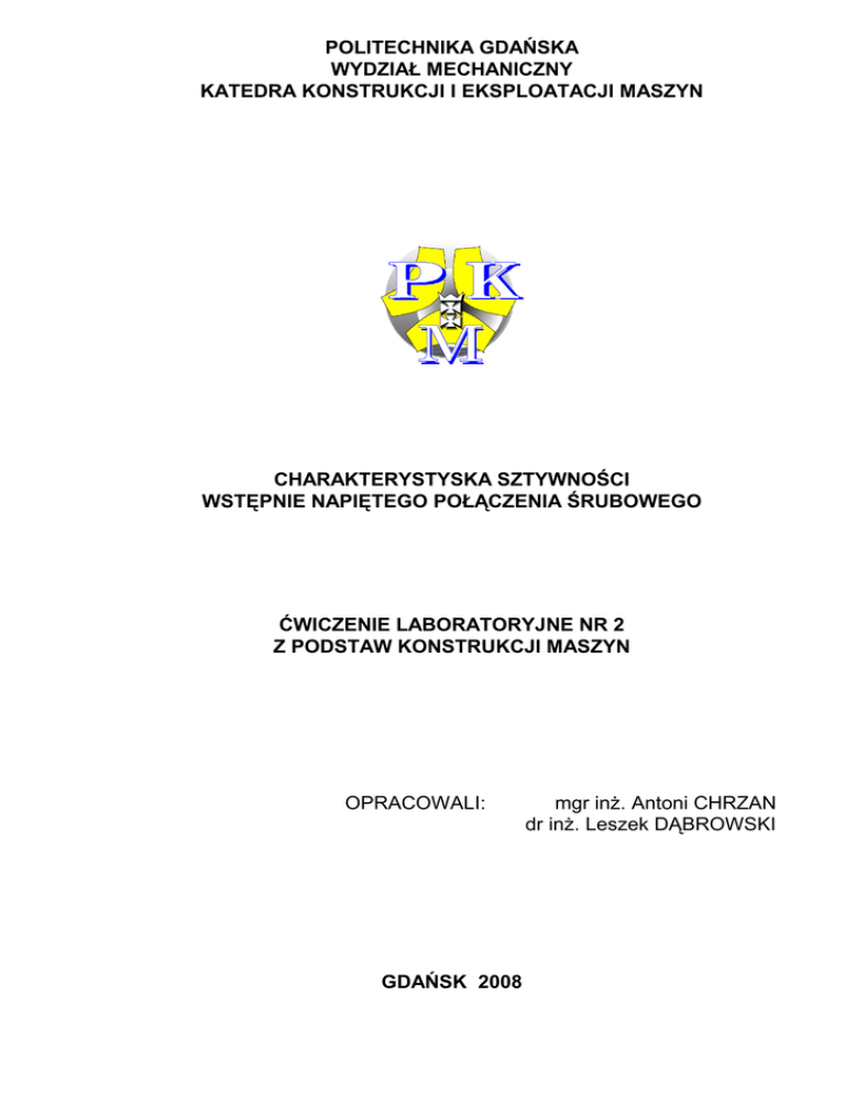 POLITECHNIKA GDAŃSKA WYDZIAŁ MECHANICZNY KATEDRA KONSTRUKCJI I EKSPLOATACJI MASZYN CHARAKTERYSTYSKA SZTYWNOŚCI WSTĘPNIE NAPIĘTEGO POŁĄCZENIA ŚRUBOWEGO ĆWICZENIE LABORATORYJNE NR 2 Z PODSTAW KONSTRUKCJI MASZYN OPRACOWALI: GDAŃSK 2008 mgr inż. Antoni CHRZAN dr inż. Leszek DĄBROWSKI -2CEL ĆWICZEŃ Celem ćwiczenia jest porównanie charakterystyk sztywności dwóch odmian konstrukcyjnych wstępnie napiętego połączenia śrubowego i porównanie charakterystyki doświadczalnej z teoretyczną oraz wyciągnięcie wniosków konstrukcyjnych z tych porównań. 1. 2. WPROWADZENIE DO ĆWICZENIA 2.1. Połączenie śrubowe bez napięcia wstępnego Odkształcanie się elementów kołnierzowego połączenia śrubowego bez napięcia wstępnego pod wpływem obciążenia zewnętrznego Q (np. od ciśnienia medium w rurociągu) przedstawiono na rysunku 1. Niektóre elementy połączenia są rozciągane (trzon śruby 4), inne ściskane (tulejka uelastyczniająca 5). Dla uproszczenia w analizie pominięto odkształcenia kołnierzy 1 i 2, które są projektowane jako bardzo sztywne na ściskanie. Zespół elementów odkształcanych w obciążonym połączeniu bez napięcia wstępnego nazywamy układem śruby. Sumaryczne odkształcenie układu śruby (patrz rysunek 1.) jest zgodne z przemieszczeniem kołnierza 1 i jest sumą odkształceń trzonu śruby l4 i tulejki l5: s= l4+ l5 a obciążenie każdego z tych elementów wynosi Qs (Qs – obciążenie zewnętrzne przypadające na 1 śrubę). Układ śruby jest tutaj szeregowym połączeniem elementów i jego sztywność cs można wyliczyć ze sztywności elementów ci: 1 ci (1) A 3 Q 5 s 1 Qs l0,5 l5 l0,5 l4 1 cs 4 B Qs 2 s Rysunek 1 Połączenie śrubowe bez napięcia wstępnego: nieobciążone A: 1 - kołnierz górny, 2 kołnierz dolny, 3 - uszczelka (w stanowisku labor. wkładka metapleksowa), 4 – trzon śruby, 5 – tulejka uelastyczniająca, obciążone B oraz charakterystyka sztywności układu śruby. -3Sztywności ci poszczególnych elementów układu śruby można wyliczyć wg modelu prętowego (prawa Hooke’a): ci E A l (2) gdzie: A - powierzchnia przenoszenia obciążenia, l - długość elementu, E - moduł Yunga, Charakterystyka sztywności układu śruby to zależność jego obciążenia Qs od odkształcenia s. Jeśli jest ona obliczona w oparciu o powyższe modele prętowe, to jest liniowa: Qs=cs· s (3) co przedstawiono na rys. 1. Doświadczalną charakterystykę sztywności układu śruby można wyznaczyć z pomiarów odkształceń elementów układu pod wpływem obciążenia zewnętrznego zadawanego w szerokim zakresie wartości. Połączenie śrubowe bez napięcia wstępnego nie jest stosowane w technice, a zostało omówione jedynie jako wprowadzenie do analizy połączenia napiętego. Wady wykluczające techniczne zastosowanie połączenia bez napięcia to: - brak zdolności do przenoszenia obciążeń poprzecznych (sił leżących w płaszczyźnie połączenia), - nierówny rozkład obciążenia na śruby na obwodzie połączenia, - konieczność zabezpieczania nakrętek przed odkręcaniem, - bezpośrednie przenoszenie się amplitudy zmiennego obciążenia zewnętrznego na śruby, znacznie obniżające ich wytrzymałość zmęczeniową, - w przypadku połączeń rurociągowych - brak szczelności, - osiowy luz w łączonej konstrukcji, wpływający na dramatyczny wzrost jej drgań. W pewnym stopniu wady te posiada także połączenie za słabo napięte. 2.2. Wstępnie napięte, nieobciążone połączenie śrubowe Napięcie wstępne połączenia śrubowego (poprzez pokręcanie nakrętki, po wykasowaniu luzów) nie tylko odkształca elementy układu śruby analogicznie jak obciążenie zewn. w połączeniu nie napiętym, ale także odkształca inne elementy, zaliczane do układu krezy. Na układ krezy w przykładowym połączeniu z rysunku 2 składa się jedynie uszczelka 3. (w stanowisku laboratoryjnym zastąpiona metapleksową wkładką pomiędzy kołnierzami 1. i 2.). Układ śruby i układ krezy po napięciu wstępnym obciążają siebie nawzajem (rysunek 2). Obciążenia obu układów Qw są zatem jednakowe, a odkształcenia wynikają z ich sztywności: -4lw,s= Qw/cs, lw,k= Qw/ck (4) l0,5 l0,5 lw,5 lw,4 Zgodne obciążenie obu układów napięciem wstępnym Qw i odpowiednie proporcje odkształceń są przedstawiane na ich wspólnej charakterystyce sztywności, zwanej wykresem „śruba-kreza” Określanie sztywności układu śruby cs zostało omówione w p. 2.1. Sztywność krezy ck czyli ściskanej uszczelki (wkładki metapleksowej) można obliczać z modelu prętowego (2), podstawiając jako A pole pierścienia metapleksowego, a jako l – jego grubość. Moduł Younga metapleksu wynosi E3=3.2×103 MPa. Sztywność układu krezy należy rozdzielić na poszczególne śruby połączenia. Doświadczalne określenie sztywności tego układu jest możliwe jedynie metodą pośrednią ze względu na jego niewielkie odkształcenie (patrz 3.2.3.). 4 1 3 A 2 C lw,3 l0,3 l0,4 5 Q Qw Qw C Qw Qw Qw Połączenie śrubowe napięte wykasowanymi luzami A. Rysunek 2 wstępnie C w lw,s porównaniu lw,k z połączeniem z Przy zbyt słabym napięciu wstępnym połączenia Qw ujawniają się wady wspomniane w 2.1., a nadmierne napięcie zagraża wytrzymałości śrub. Prawidłową wartość napięcia Qw można uzyskać kierując się pomiarem -5– wydłużenia śruby lw,4 – zgodnie z charakterystyką sztywności Q( ). Śruby o długościach przekraczających 100 mm są w trakcie napięcia wstępnego wydłużane powyżej 0.1 mm. Pomiar takiego wydłużenia jest łatwy i zapewnia dużą precyzję napięcia wstępnego. Powszechnie stosowane klucze dynamometryczne do napinania połączeń śrubowych są jeszcze łatwiejsze w stosowaniu, ale ich dokładność jest niewielka ze względu na zależność współczynnika tarcia między śrubą, nakrętką i kołnierzem od bardzo wielu trudno uchwytnych czynników. 2.3. Wstępnie napięte, obci