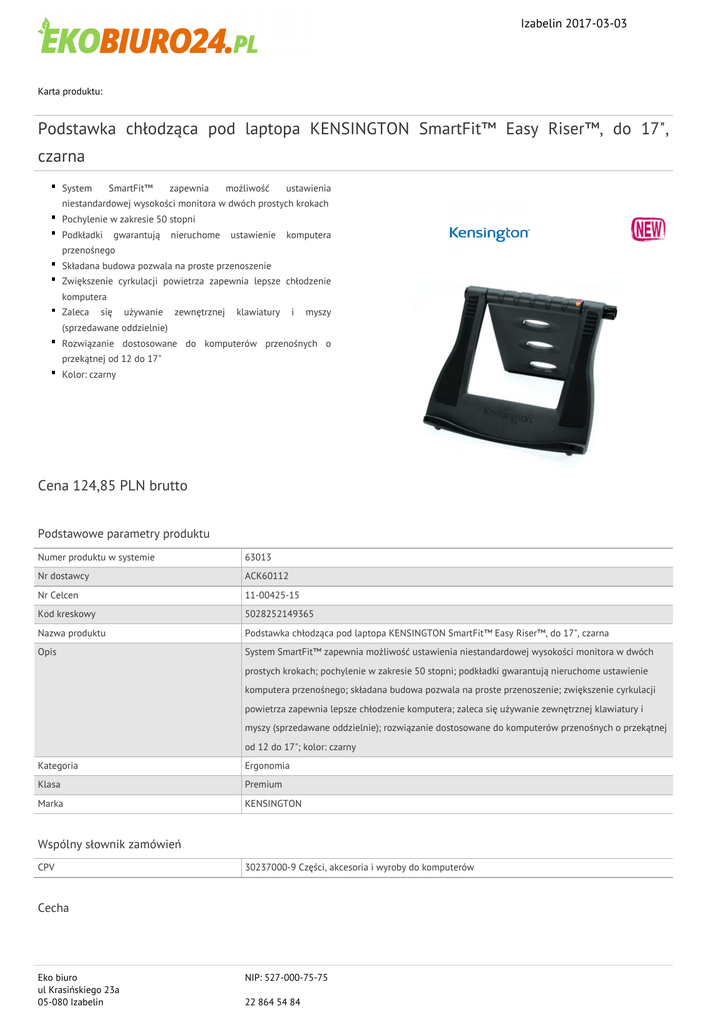 Izabelin 2017-03-03 Karta produktu: Podstawka chłodząca pod laptopa KENSINGTON SmartFit™ Easy Riser™, do 17", czarna System SmartFit™ zapewnia możliwość ustawienia niestandardowej wysokości monitora w dwóch prostych krokach Pochylenie w zakresie 50 stopni Podkładki gwarantują nieruchome ustawienie komputera przenośnego Składana budowa pozwala na proste przenoszenie Zwiększenie cyrkulacji powietrza zapewnia lepsze chłodzenie komputera Zaleca się używanie zewnętrznej klawiatury i myszy (sprzedawane oddzielnie) Rozwiązanie dostosowane do komputerów przenośnych o przekątnej od 12 do 17" Kolor: czarny Cena 124,85 PLN brutto Podstawowe parametry produktu Numer produktu w systemie 63013 Nr dostawcy ACK60112 Nr Celcen 11-00425-15 Kod kreskowy 5028252149365 Nazwa produktu Podstawka chłodząca pod laptopa KENSINGTON SmartFit™ Easy Riser™, do 17", czarna Opis System SmartFit™ zapewnia możliwość ustawienia niestandardowej wysokości monitora w dwóch prostych krokach; pochylenie w zakresie 50 stopni; podkładki gwarantują nieruchome ustawienie komputera przenośnego; składana budowa pozwala na proste przenoszenie; zwiększenie cyrkulacji powietrza zapewnia lepsze chłodzenie komputera; zaleca się używanie zewnętrznej klawiatury i myszy (sprzedawane oddzielnie); rozwiązanie dostosowane do komputerów przenośnych o przekątnej od 12 do 17"; kolor: czarny Kategoria Ergonomia Klasa Premium Marka KENSINGTON Wspólny słownik zamówień CPV 30237000-9 Części, akcesoria i wyroby do komputerów Cecha Eko biuro ul Krasińskiego 23a 05-080 Izabelin NIP: 527-000-75-75 22 864 54 84 Izabelin 2017-03-03 Karta katalogowa produktu cd. Podstawka chłodząca pod laptopa KENSINGTON SmartFit™ Easy Riser™, do 17", czarna Typ Chłodząca Produkt Podstawka na laptopa W ofercie od 2017-01 Certyfikaty Hit Standard Nowy produkt w ofercie Nowość Kolor Kolor Czarny Pozostałe zdjęcia produktu Serdecznie zapraszamy do współpracy Eko biuro zespół. Eko biuro ul Krasińskiego 23a 05-080 Izabelin NIP: 527-000-75-75 22 864 54 84