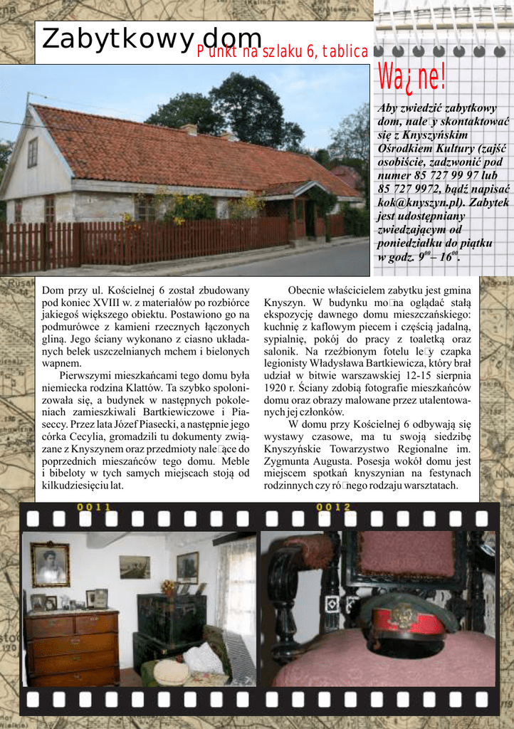 Zabytkowy Punkt dom na szlaku 6, tablica Wa¿ne! Aby zwiedzić zabytkowy dom, należy skontaktować się z Knyszyńskim Ośrodkiem Kultury (zajść osobiście, zadzwonić pod numer 85 727 99 97 lub 85 727 9972, bądź napisać [email protected]). Zabytek jest udostępniany zwiedzającym od poniedziałku do piątku w godz. 900– 1600. Dom przy ul. Kościelnej 6 został zbudowany pod koniec XVIII w. z materiałów po rozbiórce jakiegoś większego obiektu. Postawiono go na podmurówce z kamieni rzecznych łączonych gliną. Jego ściany wykonano z ciasno układanych belek uszczelnianych mchem i bielonych wapnem. Pierwszymi mieszkańcami tego domu była niemiecka rodzina Klattów. Ta szybko spolonizowała się, a budynek w następnych pokoleniach zamieszkiwali Bartkiewiczowe i Piaseccy. Przez lata Józef Piasecki, a następnie jego córka Cecylia, gromadzili tu dokumenty związane z Knyszynem oraz przedmioty należące do poprzednich mieszańców tego domu. Meble i bibeloty w tych samych miejscach stoją od kilkudziesięciu lat. Obecnie właścicielem zabytku jest gmina Knyszyn. W budynku można oglądać stałą ekspozycję dawnego domu mieszczańskiego: kuchnię z kaflowym piecem i częścią jadalną, sypialnię, pokój do pracy z toaletką oraz salonik. Na rzeźbionym fotelu leży czapka legionisty Władysława Bartkiewicza, który brał udział w bitwie warszawskiej 12-15 sierpnia 1920 r. Ściany zdobią fotografie mieszkańców domu oraz obrazy malowane przez utalentowanych jej członków. W domu przy Kościelnej 6 odbywają się wystawy czasowe, ma tu swoją siedzibę Knyszyńskie Towarzystwo Regionalne im. Zygmunta Augusta. Posesja wokół domu jest miejscem spotkań knyszynian na festynach rodzinnych czy różnego rodzaju warsztatach.