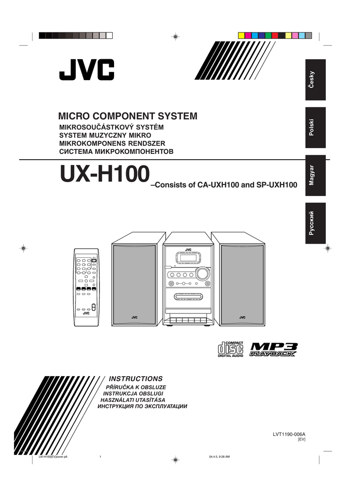 Česky Polski MICRO COMPONENT SYSTEM –Consists of CA-UXH100 and SP-UXH100 Pyccкий UX-H100 Magyar MIKROSOUČÁSTKOVÝ SYSTÉM SYSTEM MUZYCZNY MIKRO MIKROKOMPONENS RENDSZER CИCTEMA MИKPOKOMПOHEHTOB INSTRUCTIONS PŘÍRUČKA K OBSLUZE INSTRUKCJA OBSLUGI HASZNÁLATI UTASÍTÁSA ИHCTPYKЦИЯ ПO ЭKCПЛУATAЦИИ LVT1190-006A [EV] UX-H100[EV]cover.p6 1 04.4.5, 9:28 AM Varování, upozorněni a jiné Ostrzeżenia, uwagi i inne Figyelmeztetések, biztonsági óvintézkedések és egyéb tudnivalók Предупреждения, меры предосторожности и другие указания В соответствии с Законом Российской Федерации “О защите прав потребителей” срок службы (годности) данного товара, “по истечении которого он может представлять опасность для жизни, здоровья потребителя, причинять вред его имуществу или окружающей среде” составляет семь (7) лет со дня производства. Этот срок является временем, в течение которого потребитель данного товара может безопасно им пользоваться при условии соблюдения инструкции по эксплуатации данного товара, проводя необходимое обслуживание, включающее замену расходных материалов и/или соответствующее ремонтное обеспечение в специализированном сервисном центре. Дополнительные косметические материалы к данному товару, поставляемые вместе с ним, могут храниться в течение двух (2) лет со дня его производства. Срок службы (годности), кроме срока хранения дополнительных косметических материалов, упомянутых в предыдущих двух пунктах, не затрагивает никаких других прав потребителя, в частности, гарантийного свидетельства JVC, которое он может получить в соответствии с законом о правах потребителя или других законов, связанных с ним. Upozornění—Tlačítko (STANDBY/ON)! Odpojte síťovou zástrčku, abyste vypnuli proud úplně (veškeré kontrolky a indikátory zhasnou). Tlačítko (STANDBY/ON) v žádné poloze nevypíná síťové napájení. • Pokud je přístroj v pohotovostním režimu, kontrolka STANDBY/ON svítí červeně. • Pokud je přístroj zapnutý, kontrolka STANDBY/ON svítí zeleně. Napájení může být ovládáno dálkově. Uwaga—Przycisk (STANDBY/ON)! Aby całkowicie wyłączyć zasilanie, należy odłączyć przewód sieciowy (gasną wszystkie kontrolki i wskaźniki). Przycisk (STANDBY/ON) w żadnym położeniu nie odłącza urządzenia od sieci. • Gdy urządzenie pracuje w trybie gotowości, wskaźnik STANDBY/ ON świeci na czerwono. • Gdy włączone jest zasilanie, wskaźnik STANDBY/ON świeci na zielono. Zasilanie można włączać i wyłączać zdalnie. Vigyázat— (STANDBY/ON) gomb! A hálózati áramellátás teljes kikapcsolásához ki kell húzni a csatlakozó-dugót (az összes égõ és jelzõ kikapcsol). A (STANDBY/ON) gomb egyik állásával sem kapcsolható ki a hálózati áramellátás. • Készenléti állapotban a STANDBY/ON lámpája piros fénnyel világít. • A készülék kikapcsolásakor a STANDBY/ON lámpa zöld fénnyel világít. A hálózati áramellátás távirányítóval vezérelhető. Внимание—Кнопка (STANDBY/ON)! Извлеките вилку из розетки, чтобы полностью отключить питания (пoгacнут вce лaмпы). Нажатие кнопки (STANDBY/ ON) не приводит к выключению питания. • Если устройство находится в режиме ожидания, индикатор STANDBY/ON горит красным цветом. • Если устройство находится в включено, индикатор STANDBY/ ON горит зеленым цветом. Включение и выключение питания можно осуществлять с помощью пульта дистанционного управления. G-1 Safety_UX_H100[EV]2.p65 1 04.4.5, 9:29 AM UPOZORNĚNĺ Aby se zabránilo poranění elektrickým proudem, požáru atd.: 1. Nesnímejte šrouby, kryty nebo skříňku. 2. Nevystavujte toto zařízení dešti nebo vlhkosti. OSTRZEŻENIE Aby zmniejszyć niebezpieczeństwo porażenia prądem elektrycznym, pożaru, itp.: 1. Nie zdejmuj wkrętów, osłon ani obudowy. 2. Nie narażaj niniejszego urządzenia na działanie deszczu lub wilgoci. ÓVINTÉZKEDÉS A tűz és az áramütés stb. veszélyének csökkentése érdekében: 1. Ne távolítsa el a készülék csavarjait, külső burkolatát vagy a készülékdobozt. 2. Ne tegye ki a készüléket eső vagy nedvesség hatásának. ПРЕДОСТЕРЕЖЕНИЕ Во избежание риска поражения электрическим током, пожара и т.п.: 1. Не снимайте винты, крышки или корпус. 2. Не подвергайте это электрическое оборудование воздействию дождя или влаги. UPOZORNĚNĺ • Nezakrývejte větrcí otvory. Jestliže budou ventilační otvory zakryty novinami nebo látkou, může docházet k přehřívání zařízení. • V žádném p