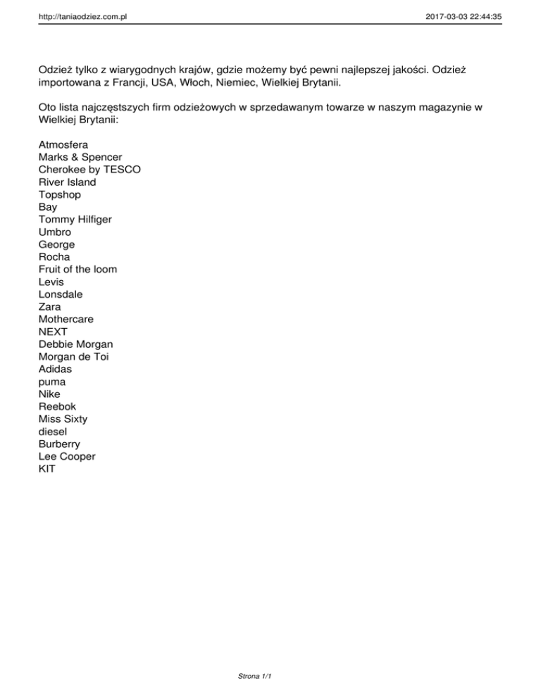 http://taniaodziez.com.pl 2017-03-03 22:44:35 Odzież tylko z wiarygodnych krajów, gdzie możemy być pewni najlepszej jakości. Odzież importowana z Francji, USA, Włoch, Niemiec, Wielkiej Brytanii. Oto lista najczęstszych firm odzieżowych w sprzedawanym towarze w naszym magazynie w Wielkiej Brytanii: Atmosfera Marks & Spencer Cherokee by TESCO River Island Topshop Bay Tommy Hilfiger Umbro George Rocha Fruit of the loom Levis Lonsdale Zara Mothercare NEXT Debbie Morgan Morgan de Toi Adidas puma Nike Reebok Miss Sixty diesel Burberry Lee Cooper KIT Strona 1/1