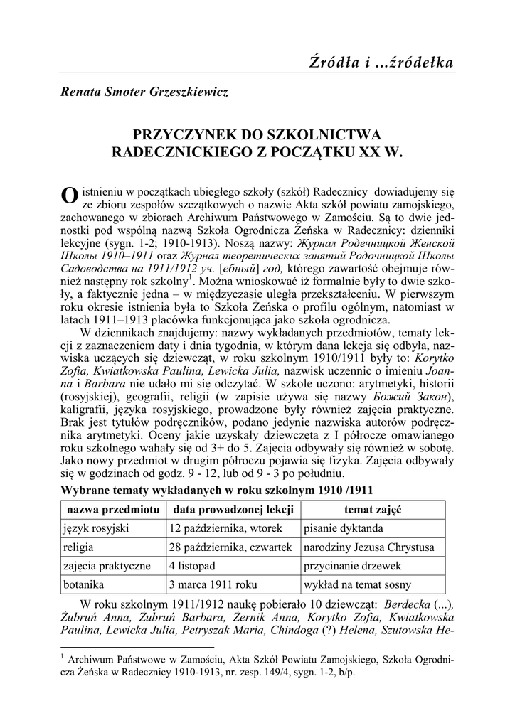 Źródła i ...źródełka Renata Smoter Grzeszkiewicz PRZYCZYNEK DO SZKOLNICTWA RADECZNICKIEGO Z POCZĄTKU XX W. w początkach ubiegłego szkoły (szkół) Radecznicy dowiadujemy się O istnieniu ze zbioru zespołów szczątkowych o nazwie Akta szkół powiatu zamojskiego, zachowanego w zbiorach Archiwum Państwowego w Zamościu. Są to dwie jednostki pod wspólną nazwą Szkoła Ogrodnicza Żeńska w Radecznicy: dzienniki lekcyjne (sygn. 1-2; 1910-1913). Noszą nazwy: Журнал Родечницкой Женской Школы 1910–1911 oraz Журнал теоретических занятий Родочницкой Школы Садоводства на 1911/1912 уч. [ебный] год, którego zawartość obejmuje również następny rok szkolny1. Można wnioskować iż formalnie były to dwie szkoły, a faktycznie jedna – w międzyczasie uległa przekształceniu. W pierwszym roku okresie istnienia była to Szkoła Żeńska o profilu ogólnym, natomiast w latach 1911–1913 placówka funkcjonująca jako szkoła ogrodnicza. W dziennikach znajdujemy: nazwy wykładanych przedmiotów, tematy lekcji z zaznaczeniem daty i dnia tygodnia, w którym dana lekcja się odbyła, nazwiska uczących się dziewcząt, w roku szkolnym 1910/1911 były to: Korytko Zofia, Kwiatkowska Paulina, Lewicka Julia, nazwisk uczennic o imieniu Joanna i Barbara nie udało mi się odczytać. W szkole uczono: arytmetyki, historii (rosyjskiej), geografii, religii (w zapisie używa się nazwy Божий Закон), kaligrafii, języka rosyjskiego, prowadzone były również zajęcia praktyczne. Brak jest tytułów podręczników, podano jedynie nazwiska autorów podręcznika arytmetyki. Oceny jakie uzyskały dziewczęta z I półrocze omawianego roku szkolnego wahały się od 3+ do 5. Zajęcia odbywały się również w sobotę. Jako nowy przedmiot w drugim półroczu pojawia się fizyka. Zajęcia odbywały się w godzinach od godz. 9 - 12, lub od 9 - 3 po południu. Wybrane tematy wykładanych w roku szkolnym 1910 /1911 nazwa przedmiotu data prowadzonej lekcji temat zajęć język rosyjski 12 października, wtorek pisanie dyktanda religia 28 października, czwartek narodziny Jezusa Chrystusa zajęcia praktyczne 4 listopad przycinanie drzewek botanika 3 marca 1911 roku wykład na temat sosny W roku szkolnym 1911/1912 naukę pobierało 10 dziewcząt: Berdecka (...), Żubruń Anna, Żubruń Barbara, Żernik Anna, Korytko Zofia, Kwiatkowska Paulina, Lewicka Julia, Petryszak Maria, Chindoga (?) Helena, Szutowska He1 Archiwum Państwowe w Zamościu, Akta Szkół Powiatu Zamojskiego, Szkoła Ogrodnicza Żeńska w Radecznicy 1910-1913, nr. zesp. 149/4, sygn. 1-2, b/p. Renata Smoter Grzeszkiewicz lena. Dokonano podziału na I i II oddział (klasy?). Wykaz tematów z danego przedmiotu zapisany został na początku dziennika. W roku 1911/1912 wykładano: religię, język rosyjski, historię, geometrię, fizykę, zoologię. Oceny za I półrocze: od oceny niedostatecznej poprzez 3+, 4– , 4= do 5. Wybrane tematy wykładanych w roku szkolnym 1911 /1912 prowadzonej temat zajęć nazwa przedmiotu data lekcji geometria 11października podstawowe pojęcia geometryczne - linia, powierzchnia, kropka arytmetyka 12 października rozwiązywanie zadań z podręcznika autorstwa Буренина i Машнина; sądząc po numerach zadań, bardzo wysokich, w tym dniu rozwiązywano zadanie o nr. 1039 - był to więc bardzo obszerny podręcznik fizyka 17 października inercja, zajęcia na temat działania barometru język rosyjski 20 października praca pisemna na temat "Opisanie wieczornicy upamiętniającej Wojnę Narodową" religia 12 marca 1912 roku w tym dniu zajęcia z religii nie odbyły się W roku szkolnym 1912/1913 pojawia się nowy podręcznik do arytmetyki autorstwa Борысова i Саторова, także "opasły" – figurują w nim zadania powyżej numeru 1546. Historia, której uczą się dziewczęta, podobnie jak w latach ubiegłych dotyczyła Rosji. Zapisane za pierwsze półrocze oceny z zoologii w przedziale od 3+ do 5–, natomiast zestawienie ocen z wszystkich przedmiotów wskazuje iż najlepszą uczennica była Julia Lewicka. 158