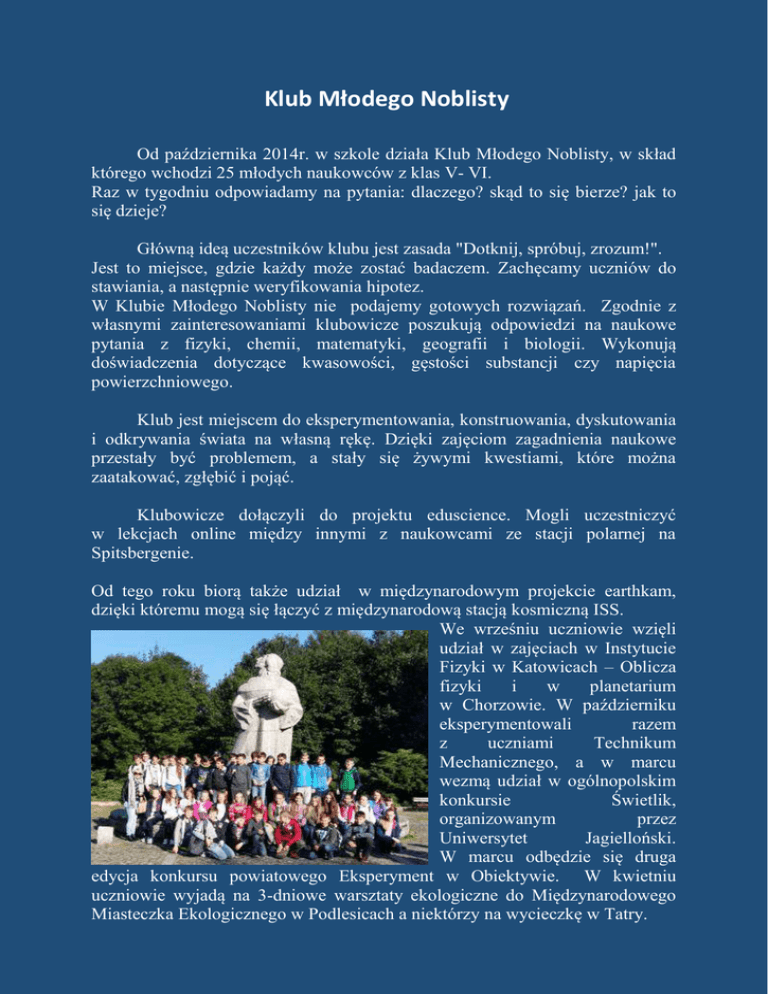 Klub Młodego Noblisty Od października 2014r. w szkole działa Klub Młodego Noblisty, w skład którego wchodzi 25 młodych naukowców z klas V- VI. Raz w tygodniu odpowiadamy na pytania: dlaczego? skąd to się bierze? jak to się dzieje? Główną ideą uczestników klubu jest zasada "Dotknij, spróbuj, zrozum!". Jest to miejsce, gdzie każdy może zostać badaczem. Zachęcamy uczniów do stawiania, a następnie weryfikowania hipotez. W Klubie Młodego Noblisty nie podajemy gotowych rozwiązań. Zgodnie z własnymi zainteresowaniami klubowicze poszukują odpowiedzi na naukowe pytania z fizyki, chemii, matematyki, geografii i biologii. Wykonują doświadczenia dotyczące kwasowości, gęstości substancji czy napięcia powierzchniowego. Klub jest miejscem do eksperymentowania, konstruowania, dyskutowania i odkrywania świata na własną rękę. Dzięki zajęciom zagadnienia naukowe przestały być problemem, a stały się żywymi kwestiami, które można zaatakować, zgłębić i pojąć. Klubowicze dołączyli do projektu eduscience. Mogli uczestniczyć w lekcjach online między innymi z naukowcami ze stacji polarnej na Spitsbergenie. Od tego roku biorą także udział w międzynarodowym projekcie earthkam, dzięki któremu mogą się łączyć z międzynarodową stacją kosmiczną ISS. We wrześniu uczniowie wzięli udział w zajęciach w Instytucie Fizyki w Katowicach – Oblicza fizyki i w planetarium w Chorzowie. W październiku eksperymentowali razem z uczniami Technikum Mechanicznego, a w marcu wezmą udział w ogólnopolskim konkursie Świetlik, organizowanym przez Uniwersytet Jagielloński. W marcu odbędzie się druga edycja konkursu powiatowego Eksperyment w Obiektywie. W kwietniu uczniowie wyjadą na 3-dniowe warsztaty ekologiczne do Międzynarodowego Miasteczka Ekologicznego w Podlesicach a niektórzy na wycieczkę w Tatry.