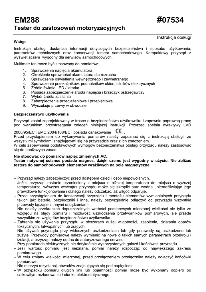 EM288 #07534 Tester do zastosowań motoryzacyjnych Instrukcja obsługi Wstęp Instrukcja obsługi dostarcza informacji dotyczących bezpieczeństwa i sposobu uŜytkowania, parametrów technicznych oraz konserwacji testera samochodowego. Kompaktowy przyrząd z wyświetlaczem wygodny dla serwisów samochodowych. Multimetr ten moŜe być stosowany do pomiarów: 1. 2. 3. 4. 5. 6. 7. 8. 9. Sprawdzenia napięcia akumulatora Określenie sprawności akumulatora dla rozruchu Sprawdzenie oświetlenia wewnętrznego i zewnętrznego Sprawdzenie przekaźników, podnośników okien, silników elektrycznych Źródło światła LED / latarka Posiada zabezpieczenie źródła napięcia i brzęczyk ostrzegawczy Wybór źródła zasilania Zabezpieczenie przeciąŜeniowe i przepięciowe Wyszukuje przerwy w obwodzie Bezpieczeństwo uŜytkowania Przyrząd został zaprojektowany w trosce o bezpieczeństwo uŜytkownika i zapewnia poprawną pracę pod warunkiem przestrzegania zaleceń niniejszej instrukcji. Przyrząd spełnia dyrektywy LVD 2006/95/EC i EMC 2004/108/EC i posiada oznakowanie . Przed przystąpieniem do wykonywania pomiarów naleŜy zapoznać się z instrukcją obsługi, ze wszystkimi symbolami znajdującymi się na przyrządzie oraz z ich znaczeniem. W celu zapewnienia podstawowych wymogów bezpieczeństwa obsługi przyrządu naleŜy zastosować się do poniŜszych zasad: Nie stosować do pomiarów napięć zmiennych AC. Tester natywnej ściance posiada magnes, dzięki czemu jest wygodny w uŜyciu. Nie zbliŜać testera do samochodowych elementów wraŜliwych na pole magnetyczne. – Przyrząd naleŜy zabezpieczyć przed dostępem dzieci i osób niepowołanych. – JeŜeli przyrząd zostanie przeniesiony z miejsca o niŜszej temperaturze do miejsca o wyŜszej temperaturze, wówczas wewnątrz przyrządu moŜe się skroplić para wodna uniemoŜliwiając jego prawidłowe funkcjonowanie i dlatego naleŜy odczekać, aŜ wilgoć odparuje. – Przed przystąpieniem do konserwacji przyrządu i montaŜu elementów wymienialnych przyrządu takich jak: baterie, bezpieczniki i inne, naleŜy bezwzględnie odłączyć od przyrządu wszystkie przewody łączące z innymi urządzeniami. – Nie naleŜy przekraczać dopuszczalnych wartości pomiarowych mierzonej wielkości nie tylko ze względu na błędy pomiaru i moŜliwość uszkodzenia przetworników pomiarowych, ale przede wszystkim ze względów bezpieczeństwa uŜytkownika. – Zabrania się uŜywania przyrządu w obszarach duŜej wilgotności, zasolenia, działania oparów toksycznych, łatwopalnych lub Ŝrących. – Nie uŜywać przyrządu przy widocznych uszkodzeniach lub gdy przewody są uszkodzone lub zuŜyte. Przewody pomiarowe naleŜy wymienić na nowe o takich samych parametrach przekroju i izolacji, a przyrząd naleŜy oddać do autoryzowanego serwisu. – Przy pomiarach elektrycznych nie dotykać nie wykorzystanych gniazd i końcówek przyrządu. – Jeśli wartość pomiaru jest nieznana, pomiar naleŜy rozpocząć od największego zakresu pomiarowego. – W celu zmiany wielkości mierzonej, przed przełączeniem przełącznika naleŜy odłączyć końcówki pomiarowe. – Nie mierzyć rezystancji obwodów znajdujących się pod napięciem. – W przypadku pomiaru długich linii lub pojemności pomiar moŜe być wykonany dopiero po całkowitym rozładowaniu ładunku elektrostatycznego. Budowa Zgodnie z rys. od 1 do 5 podłącz przewody pomiarowe do mierzonego akumulatora. Podłącz czerwony Klips do (+) akumulatora a czarny do (-) akumulatora. 2 1. Ustaw przełącznik napięcia akumulatora rys.4. w pozycji , na wyświetlaczu pojawi się wielkość Naciśnij i przytrzymaj przycisk przełącznika konwersji zasilania stroną , zaświeci czerwona dioda LED, wbudowany brzęczyk generuje przerywany sygnał jeŜeli przycisk znajduje się w pozycji ON. Jednocześnie sonda pomiarowa wprowadza napięcie akumulatora aby zapewnić źródło napięcia przez wewnętrzne połączenie. Naciśnij i trzymaj przycisk stroną przełącznika konwersji zasilania , zaświeci zielona dioda LED , sonda pomiarowa wewnętrznie połączona jest do ujemnego bieguna akumulatora. Ponadto wbudowany brzęczyk generuje przerywany sygnał dźwiękowy jeŜeli przycisk Ten dźwięk róŜni się od poprzedniego. 2. 3. 4. znajduje się w pozycji ON. Ustaw przełącznik w pozycji ON, zaświeci dioda LED B. Wyświetlacz wskaŜe napięcie na sondzie pomiarowej a uŜycie przełącznika konwersji zasilania jest zabronione.rys.4. w pozycji OFF, niemoŜliwe jest uŜycie bocznych przewodów Ustaw przełącznik pomiarowych. Ustaw przełącznik w pozycji ON, zaświeci dioda LED A, obydwa boczne dodatkowe gniazda pomiarowe są wewnętrznie połączone do (+)akumulatora, dowolne dodatkowe gniazdo pomiarowe moŜe być uŜyte do dostarczenia (+) napięcia, a przewód masy moŜe być stosowany równocześnie. Naciskając przycisk uruchamiasz latarkę LED. Uwagi: 1. Przewód masy jest wewnętrznie połączony z (-) klipsem akumulatora. 2. JeŜeli polaryzacja przewodów do podłączenia akumulatora zostanie zamieniona , wbudowany brzęczyk generuje ciągły sygnał alarmowy. Skoryguj podłączenie. 3. JeŜeli prąd mierzonego odbiornika przekracza 8A lub gdy odbiornik ma zwarcie , zadziałają bezpieczniki w dolnej części testera. Zaczekaj 30 sek. Przed ponownym uruchomieniem. PRZYKŁADY 1. Sprawdzenie akumulatora w kabinie kierowcy (rys.6). Podłącz przewody pomiarowe do gniazda zapalniczki , Ustaw przełącznik w pozycji OFF, wyświetlacz wskaŜe napięcie akumulatora samochodowego. Uruchom silnik i odczytaj na wyświetlaczu stan akumulatora w momencie uruchamiania silnika. 2. Bezpośredni pomiar napięcia akumulatora (rys.7) Podłącz przewody pomiarowe i przewody z klipsami do akumulatora. JeŜeli konieczne uŜyj odpowiedniego przedłuŜacza. Podłącz czerwony klips do (+) akumulatora a czarny do(-) akumulatora. Ustaw przełącznik akumulatora samochodowego. 3. w pozycji OFF, wyświetlacz wskaŜ