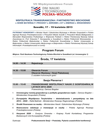 VII Międzynarodowe Forum WSPÓŁPRACA TRANSGRANICZNA i PARTNERSTWO WSCHODNIE ● NOWE MATERIAŁY I PROCESY ● ZDROWIE ● ICT ● ENERGIA ● ŚRODOWISKO Suwałki, 17 – 19 kwietnia 2013 PATRONAT HONOROWY ● Minister Nauki i Szkolnictwa Wyższego ● Minister Gospodarki ● Polska Agencja Rozwoju Przedsiębiorczości ● Prezydent Miasta Suwałk ● Prezydent Miasta Białegostoku ● Marszałek Województwa Podlaskiego ● Wojewoda Podlaski ● Rektor Państwowej Wyższej Szkoły Zawodowej im. Prof. Edwarda F. Szczepanika w Suwałkach ● Rektor Politechniki Warszawskiej ● Rektor Politechniki Białostockiej ● Rektor Politechniki Koszalińskiej ● Rektor Uniwersytetu w Białymstoku ● Rektor Uniwersytetu Medycznego w Białymstoku ● Rektor Państwowej Wyższej Szkoły Informatyki i Przedsiębiorczości w Łomży Program Forum Miejsce: Park Naukowo-Technologiczny Polska-Wschód w Suwałkach (ul. Innowacyjna 1) Środa, 17 kwietnia 14.00 – 14.30 Rejestracja 14.30 – 15.00 Otwarcie Forum Otwarcie Wystawy i Sesji Plakatowej Z udziałem honorowych gości Sesja Plenarna I 15.00 – 15.45 FINANSOWANIE WSPÓLPRACY NAUKI Z GOSPODARKĄ W LATACH 2014–2020 Przewodniczy: Dariusz Bogdan 1. Innowacyjny rozwój gospodarczy a polityka gospodarcza rządu – Dariusz Bogdan – Ministerstwo Gospodarki (Polska) 2. Europejska Współpraca Terytorialna – doświadczenia i perspektywy na lata 2014 – 2020 – Rafał Baliński - Ministerstwo Rozwoju Regionalnego (Polska) 3. Środki finansowe na naukę – Ministerstwo Nauki i Szkolnictwa Wyższego (Polska) 4. Nowoczesna edukacja a inwestycje w naukę – Polska Agencja Rozwoju Przedsiębiorczości (Polska) 5. Horyzont 2020 – Grażyna Omarska – Krajowy Punkt Kontaktowy Programów Badawczych Unii Europejskiej (Polska) Dyskusja: Podsumowanie Sesji – Postulaty. Pytania uczestników konferencji Sesja Plenarna II 15.45 – 16.45 NAUKA – EDUKACJA I W PRZYSZŁOŚCI – GOSPODARKA DZIŚ Przewodniczy: Łukasz Kurpisz „Trójkąt wiedzy w praktyce” 1. Jak zarabiać pieniądze w trudnych czasach – Łukasz Kurpisz – Krajowy Punkt Kontaktowy Programów Badawczych Unii Europejskiej (Polska) 2. Uniwersytet Trzeciej Generacji – Andrzej Rabczenko – Pracodawcy RP (Polska) 3. Top 500 Innovators – Katarzyna Walczyk-Matuszyk – Krajowy Punkt Kontaktowy Programów Badawczych Unii Europejskiej (Polska) „Prezentacja referatów uczestników konferencji” 4. Zwiększenie potencjału badawczo – rozwojowego PSW na przykładzie Centrum Badań nad Innowacjami – Dorota Plewik – Państwowa Szkoła Wyższa im. Papieża Jana Pawła II w Białej Podlaskiej (Polska) 5. Szanse i zagrożenia rozwoju szkolnictwa wyższego w transgranicznej przestrzeni –Tadeusz Kowalewski – Politechnika Białostocka (Polska) Dyskusja: Podsumowanie Sesji – Postulaty. Pytania uczestników konferencji 16.45 – 17.00 Przerwa Kawowa 17.00 – 18.30 Workshop I. Energia i środowisko Przewodniczy: Tomasz Kulisiewicz, Witold Witowski „Energetyka Rozproszona” 1. Ekologiczne elektrownie wodne na rzekach nizinnych technologia niskich spadów – Mariusz Kostrzewa – Elektrownie Wodne ZENERIS Sp. z o.o. (Polska) 2. Po co Polsce gazoport? – Katarzyna Cieślak – Krajowy Punkt Kontaktowy Programów Badawczych Unii Europejskiej (Polska) 3. Technologia System „BS” pasywna energia alternatywna – Jerzy Busłowicz – BUSICO PL (Polska) „Prezentacja referatów uczestników konferencji” 4. Produkcja gazu hydraty – Аnatoliy Pavlenko – Połtawski Narodowy Uniwersytet Techniczny im. Yuri Kondratyuk (Ukraina) 5. Innowacyjne środowisko dla BiR oraz MŚP zorientowanych na zaawansowane technologie – Mariusz Cholewa – Dolnośląski Park Innowacji i Nauki S.A. (Polska) 6. Zrównoważone wykorzystanie zasobów biologicznych rolnictwa i leśnictwa – Zita Kriauciuniene – Uniwersytet Aleksandrasa Stulginskisa (Litwa) 7. Przyjazne dla środowiska technologiczne środki trwałe biosystemy inżynierii i bioenergii – Zivile Jukneviciene – Uniwersytet Aleksandrasa Stulginskisa (Litwa) 8. Ocena sieci wodociągowej w obwodzie lwowskim – Ulyana Lototska-Dudyk – Lwowski Państwowy Uniwersytet Medyczny im. Danylo Halytskiy (Ukraina) Dyskusja: Podsumowanie Sesji – Postulaty. Pytania uczestników konferencji 14.30 – 18.30 Prezentacje Wystawców 1. Stowarzyszenie Innowacyjna Polska Wschodnia 2. Park Naukowo–Technologiczny Polska–Wschód w Suwałkach 3. Urząd Marszałkowski Województwa Podlaskiego 4. Warszawski Uniwersytet Medyczny 5. BALTON SP. Z O.O. 6. POL–LAB SP. Z O.O. 7. Achtel Sp. z o.o. 8. Politechnika Białostocka 9. Stoisko wystawiennicze uczestników z Ukrainy 14.30 – 18.30 Sesja Plakatowa ZDROWIE 1. Kompleks wideo "Tsitomir" i poklatkowy wideo mikroskopii żywych komórek in vitro – Nina Balashenko – Instytut Genetyki i Cytologii, Białoruska Akademia Nauk (Białoruś) P01_HEA 2. PCNL w leczeniu kamicy moczowej – Standnyk Oksana, Sheremeta Roman, Stadnyk Bohdan – Lwowski Regionalny Szpital Kliniczny (Ukraina) P02_HEA 3. Current trends in the promotion of healthy lifestyles by medical students – Lesya Lototska1, Oksana Blavatska1, Ihor Blavatskyj2 – Lwowski Narodowy Medyczny Uniwersytet im. Danylo Galytskyj1, Narodowy Uniwersytet „Politechnika Lwowska” 2 (Ukraina) P05_HEA 04 NOWE MATERIAŁY I PROCESY 1. BALTON SP. Z O.O. – Wasyluk Łukasz – BALTON SP. Z O.O. (Polska) P02_NMP ICT 1. Some aspects of the IT gadgets‘ use in emergency medicine – Lesya Lototska1, Oksana Blavatska1, Ihor Blavatskyj2 – Lwowski Narodowy Medyczny Uniwersytet im. Danylo Galytskyj1, Narodowy Uniwersytet „Politechnika Lwowska” 2 P04_ICT 40 19.00 – 21.00 Uroczysta Kolacja. Wręczenie Forum Award Czwartek, 18 kwietnia 10.00 – 11.30 Workshop II. Współpraca transgraniczna i Partnerstwo Wschodnie Prezentacja referatów uczestników konferencji Przewodniczy: Ivan Kulchytskyy 1. Możliwości współpracy w ramach Partnerstwa Wschodniego – Włodzi