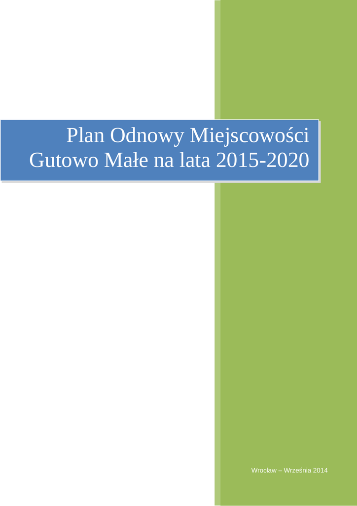Plan Odnowy Miejscowości Gutowo Małe na lata 2015-2020 Wrocław – Września 2014 Plan Odnowy Miejscowości Gutowo Małe na lata 2015-2020 Spis treści 2 Plan Odnowy Miejscowości Gutowo Małe na lata 2015-2020 Wstęp Plan Odnowy Miejscowości to dokument strategiczny, niezwykle istotny z punktu widzenia rozwoju najmniejszych jednostek administracyjnych, czyli sołectw bądź nawet pojedynczych wsi. Jego waga wynika jednak nie tylko z faktu, że wykorzystuje się go przy aplikowaniu o środki unijne (a jak wiadomo, w związku z nową perspektywą finansową, jest to temat szczególnie aktualny). Programowanie rozwoju lokalnego to sprawa bardzo ważna, a przede wszystkim skomplikowana. Wszystkie jednostki funkcjonują w warunkach ogromnej konkurencji, a jednocześnie zmuszone są reagować na ciągle zmieniające się warunki otoczenia. Stąd tak istotne jest, aby wszelkie dokumenty strategiczne, a więc również Plany Odnowy Miejscowości, były na bieżąco aktualizowane i uwzględniały właśnie te zmieniające się okoliczności zewnętrzne i wewnętrzne. Tylko w takiej sytuacji władze lokalne będą w stanie wykorzystać pojawiające się szanse rozwojowe i zapobiec (lub przynajmniej znacząco ograniczyć) zagrożeniom. Poza znaczeniem czysto finansowym, Plany Odnowy Miejscowości spełniają funkcję integracyjną, sprzyjają budowie tożsamości lokalnej oraz poczucia współodpowiedzialności za swoje miejsce. Należy zatem podkreślić, że Plan Odnowy Miejscowości Gutowo Małe ma charakter partycypacyjny i tworzony był przy udziale mieszkańców miejscowości. To bowiem mieszkańcy najlepiej znają swoją miejscowość, są w stanie określić jej niedostatki oraz atuty, a jednocześnie tylko w taki sposób można było zagwarantować, że dokument będzie odpowiadał rzeczywiście na ich potrzeby. 3 Plan Odnowy Miejscowości Gutowo Małe na lata 2015-2020 1. Charakterystyka miejscowości Początki Gutowa datuje się na średniowiecze, kiedy to istniała jedna wieś o tej właśnie nazwie. Należała ona do rodu Porajów, zaś członkowie rodu, dziedziczący te dobra, przyjmowali nazwisko Gutowscy. Wieś powstała nad rzeką Rudnik i swoją nazwę wzięła od gutów, czyli drewnianych beli, które tworzyły przechodzącą przez rzekę groblę. W miejscowości można było wyróżnić dwie części – starszą, czyli Gutowo Stare (obecnie – Wielkie) oraz nowszą, czyli Gutowo Nowe (obecnie – Małe). Podziału wsi dokonano dopiero w 1862 roku. W XVI w. w Gutowie Małym powstał folwark, funkcjonował również jeden zagrodnik. Wówczas też wieś przejął ród Bardzkich. Wojny ze Szwecją, w tym potop szwedzki oraz wojna północna, spowodowały ogromne zniszczenia. Jednak mimo to w XVIII w. funkcjonowała tam owczarnia, a w 1776 r. sprowadzono tam Niemców. W 1818 r. oba Gutowa włączono do właśnie tworzonego powiatu z siedzibą we Wrześni. Północna granica wsi była jednocześnie jego granicą. W 1885 r. w części chłopskiej Gutowa Małego mieszkało 151 osób (w tym 147 wyznania katolickiego, pozostali byli ewangelikami), z kolei w części dworskiej mieszkały 123 osoby (w tym 111 wyznania katolickiego, reszta ewangelików). W 1902 r. von Heydebrandt, ówczesny właściciel Gutowa, sprzedał je Prusom. Pierwszym dzierżawcą został Paweł Zummermann, który zmienił nazwę majątku na Neu Scheda, a samej miejscowości na Kleine Gutowy. W 1918 r., po wyzwoleniu terenów Wielkopolski spod zaboru pruskiego, majątki z obu miejscowości zostały przekazane na własność Skarbu Państwa. Majątek w Gutowie Małym dzierżawił Florian Ozdowski. Specjalizował się w reprodukcji nasienia buraczanego oraz prowadził hodowlę trzody chlewnej uszlachetnionej rasy krajowej (14 zwierząt). Później, w dwudziestoleciu międzywojennym, na polach Gutowa znajdował się magazyn amunicji (prochownia) i poligon ćwiczebny 68. Pułku Piechoty z Wrześni. Obecnie pozostały po nich jedynie fundamenty i strażnica, na której widoczne są jeszcze niemieckie napisy. 4 Plan Odnowy Miejscowości Gutowo Małe na lata 2015-2020 Ryc.1. Dawna prochownia 68. Pułku Piechoty z Wrześni. Źródło: http://www.dobroni.pl/ 3 IX 1939 r. Niemcy zrzucili bomby na Gutowo, jednak nie wyrządziły one większych szkód. Celem ataku była przede wszystkim przebiegająca tędy linia kolejowa łącząca Poznań z Warszawą. Mimo nieudanego ataku bombowego, Niemcy wkrótce weszli do Gutowa, zajmując na swoją siedzibę tutejszy pałac. Zorganizowali tam punkt zborny, do którego przyprowadzano wszystkich Polaków, wywożonych następnie do Generalnego Gubernatorstwa bądź do obozów koncentracyjnych. Tutejszą szkołę (wybudowana po 1910 r., po odłączeniu Gutowa Małego od obwodu szkolnego Gutowa Wielkiego) zamknięto dla polskich dzieci. W 1956 r. w Gutowie Małym powstało kółko rolnicze. Zawiązało się również Koło Gospodyń Wiejskich, utworzono świetlicę wiejską. Zajęty wcześniej przez Niemców pałac, jeszcze w 1949 r. został przekazany szkole i działał tam Zespół Szkolno-Przedszkolny (na zdj. poniżej), a obecnie przedszkole. Pałac to jednopiętrowy budynek, założony na planie prostokąta, z wyższym ryzalitem obejmującym wejście. 5 Plan Odnowy Miejscowości Gutowo Małe na lata 2015-2020 Ryc. 2. Dwór z XIX w. w Gutowie Małym. Źródło: http://www.polskaniezwykla.pl/ Gutowo Małe to wieś o powierzchni 552,06 ha, zamieszkiwana przez 698 osób (dane z 2013 r.). Od wrześni jest oddalona zaledwie o ok. 6 km, co czyni z niej wieś o podmiejskim charakterze. Ryc. 3. Położenie Gutowa Małego względem miasta Września. Źródło: https://www.google.pl/maps/ 6 Plan Odnowy Miejscowości Gutowo Małe na lata 2015-2020 Zauważyć można ciągły wzrost liczby mieszkańców wioski. Ma to zapewne związek z bliskością Wrześni. Tab. 1. Liczba ludności w Gutowie Małym w latach 2005-2013. Rok Liczba ludności 2005 2006 2007 2008 2009 2010 594 602 609 641 651 664 201
