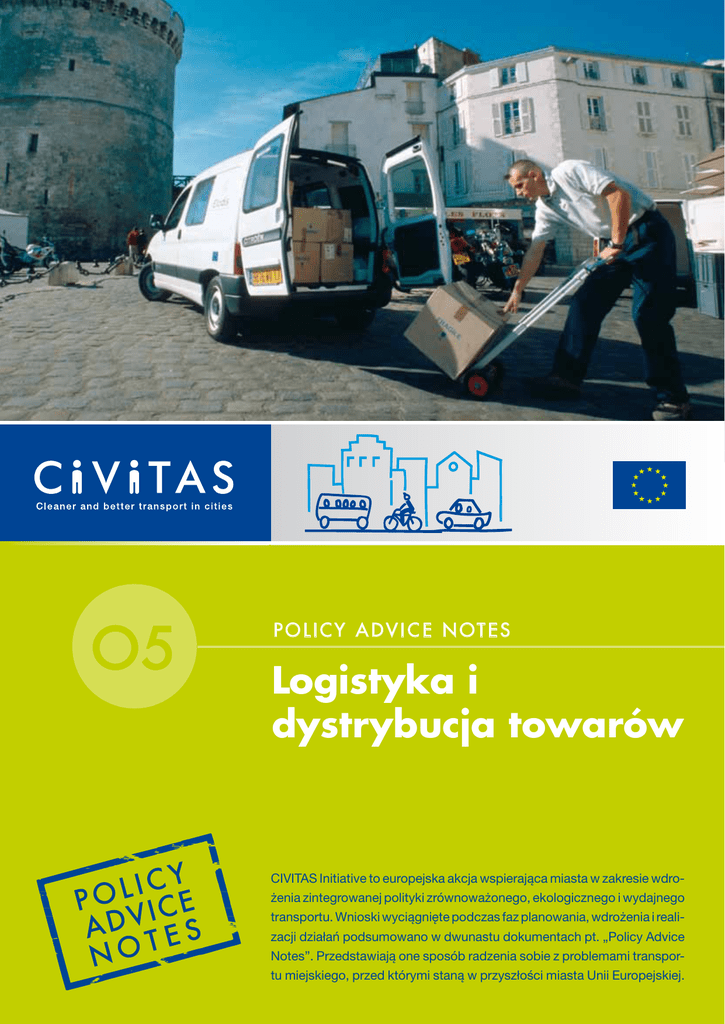 O5 Policy AdviCE notes Logistyka i dystrybucja towarów CIVITAS Initiative to europejska akcja wspierająca miasta w zakresie wdrożenia zintegrowanej polityki zrównoważonego, ekologicznego i wydajnego transportu. Wnioski wyciągnięte podczas faz planowania, wdrożenia i realizacji działań podsumowano w dwunastu dokumentach pt. „Policy Advice Notes”. Przedstawiają one sposób radzenia sobie z problemami transportu miejskiego, przed którymi staną w przyszłości miasta Unii Europejskiej. Policy AdviCE Notes Logistyka i dystrybucja t o wa r ó w Logistyka i dystrybucja towarów Przyjazna środowisku dystrybucja towarów w miastach Informacje ogólne Administracja każdego miasta może wdrożyć działania służące usprawnieniu dostawy towarów w centrum lub okre- O P IS D Z IA Ł A Ń ślonych lokalizacjach (centrach handlo- Choć kilometry przejechane przez ciężarówki stanowią w Europie nie więcej niż 10% ruchu drogowego, pojazdy ciężarowe odpowiadają za połowę emisji dwutlenku azotu, około 1/3 emisji cząstek stałych i ponad 20% emisji gazów cieplarnianych1. Sektor transportu i logistyki ma szczególnie duży wpływ na miasta portowe i przemysłowe. Duże natężenie ruchu samochodów przewożących ciężkie ładunki występuje także w obszarach, w których prowadzone są intensywne prace budowlane. Dlatego więc zarządzanie ruchem drogowym związanym z dostawami towarów powinno być częścią ogólnego głównego planu komunikacji i transportu i należy je uwzględniać w ogólnej polityce każdego miasta. Optymalizację dostaw towarów można osiągnąć za pomocą kliku typów działań: 1. Zainicjowanie partnerstwa między wszystkimi udziałowcami i co najmniej częścią operatorów, np. przez stworzenie dobrowolnego kodeksu dotyczącego zharmonizowanych i spójnych działań w zakresie dostaw towarów w mieście. Takie partnerstwo dostawców może na przykład objąć współpracę sklepów spożywczych w zakresie lokalnej dystrybucji i dostaw przy wykorzystaniu rozwiązań ITS (systemów inteligentnego zarządzania transportem), aby zminimalizować liczbę przejazdów do sklepów i klientów poprzez współdzielenie ładunków, a więc maksymalizację wydajności pojazdów. wych, placach budowy itp.). W ramach inicjatywy CIVITAS II (2005–2009) wprowadzono określone działania, których celem było zwiększenie wydajności pojazdów, redukcja korków ulicznych i zmniejszenie oddziaływania dostawy towarów w miastach na środowisko naturalne. Najważniejsze informacje na temat wdrożenia tych działań oraz doświadczeń miast objętych inicjatywą CIVITAS II podsumowano w niniejszym dokumencie pt. „Policy Advice Note”. Ma on stanowić pomoc i materiał informacyjny dla lokalnych polityków i innych decydentów zainteresowanych takimi działaniami. 1 http://www.tremove.org 2 Policy AdviCE Notes Logistyka i dystrybucja t o wa r ó w 2. Utworzenie platform logistycznych, integrujących firmy handlowe, usługowe i przemysłowe, logistyczne, serwisowe i dostawcze, na przykład w obrębie miejskich centrów dystrybucji oferujących terminale logistyczne, przestrzeń magazynową i/lub doki załadowcze. 3. Utworzenie regulacji i ram prawnych zobowiązujących przewoźników i operatorów do współpracy. 4. Zdefiniowanie spójnych regulacji dostępu do obszarów miejskich dla samochodów dostawczych (np. dostęp tylko w ustalonych godzinach lub tylko dla pojazdów spełniających określone normy dotyczące emisji). 5. Zwiększenie świadomości publicznej, ponieważ może to wpłynąć na sposób zarządzania dostawami towarów przez właścicieli sklepów i handlowców. Oni z kolei mogą wywierać naciski na przewoźników i dystrybutorów towarów. 6. Utworzenie map i oznakowania dostaw towarów, wskazujących najodpowiedniejsze trasy dostaw do kluczowych obszarów w mieście, a także przeszkody oraz obszary, których należy unikać, takie jak niskie mosty, ciasne zakręty, wąskie ulice, obszary mieszkalne, strefy ruchu pieszego itp. 7. Zarządzanie miejscami parkingowymi służącymi do załadunku i rozładunku towarów w danym obszarze. 8. Wprowadzenie technologii inteligentnych systemów transportu (ITS) i/lub internetowych systemów koordynacji logistyki, pozwalających na wydajniejsze planowanie transportu i zwiększenie wskaźnika załadowania. Wszystkie te możliwości wymagają długiego okresu współpracy, koordynacji i negocjacji. Dlatego też omawiane działania są w większości kosztowne. GRU P Y DOC E L OW E Działania dotyczące dostawy towarów i logistyki kierowane są do następujących grup: • Usługodawcy i przewoźnicy w sektorze dostaw towarów. • Właściciele sklepów i lokalne przedsiębiorstwa w danym obszarze. • Nowe inwestycje i miejsca budowy. ODD Z IA Ł YWA N I E I KOR Z Y Ś CI Dla ogółu mieszkańców • Zmniejszenie liczby pojazdów ciężarowych w centrum miasta, a więc zwiększona dostępność dzięki mniejszym korkom ulicznym. • Mniejszy poziom emisji i hałasu oraz mniej wypadków. • Zmniejszenie drgań spowodowanych przez ciężarówki, uszkadzających stare budynki. • Zwiększona dostępność obszarów handlowych. Dla podmiotów gospodarczych • Oszczędność kosztów dzięki wydajniejszym przejazdom (zmniejszone przebiegi), lepsze wskaźniki załadowania oraz optymalizacja procesów dostaw i odbioru (np. w przypadku centrów dystrybucji towarów). • Oszczędności wynikające z mniejszych korków na drogach, wyższa średnia prędkość pojazdów i niezawodność działania dla operatorów i użytkowników końcowych. • Mniejsze zapotrzebowanie na personel, prowadzące do możliwości zmniejszenia cen świadczonych usług. • Zwiększona produktywność, ponieważ trasy przejeżdżane przez kierowców są bardziej zoptymalizowane. Można także wprowadzić działania zwiększające bezpieczeństwo i chroniące mieszkańców przed wypadkami dzięki dobrze zaprojektowanym i wła