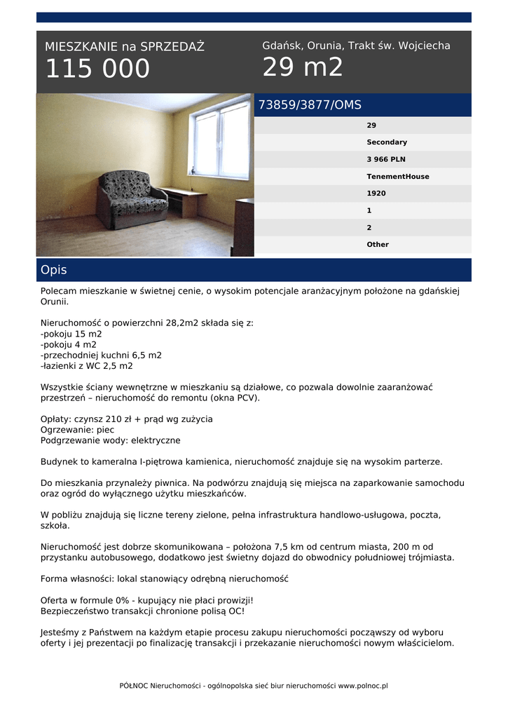 MIESZKANIE na SPRZEDAŻ 115 000 Gdańsk, Orunia, Trakt św. Wojciecha 29 m2 73859/3877/OMS 29 Secondary 3 966 PLN TenementHouse 1920 1 2 Other Opis Polecam mieszkanie w świetnej cenie, o wysokim potencjale aranżacyjnym położone na gdańskiej Orunii. Nieruchomość o powierzchni 28,2m2 składa się z: -pokoju 15 m2 -pokoju 4 m2 -przechodniej kuchni 6,5 m2 -łazienki z WC 2,5 m2 Wszystkie ściany wewnętrzne w mieszkaniu są działowe, co pozwala dowolnie zaaranżować przestrzeń – nieruchomość do remontu (okna PCV). Opłaty: czynsz 210 zł + prąd wg zużycia Ogrzewanie: piec Podgrzewanie wody: elektryczne Budynek to kameralna I-piętrowa kamienica, nieruchomość znajduje się na wysokim parterze. Do mieszkania przynależy piwnica. Na podwórzu znajdują się miejsca na zaparkowanie samochodu oraz ogród do wyłącznego użytku mieszkańców. W pobliżu znajdują się liczne tereny zielone, pełna infrastruktura handlowo-usługowa, poczta, szkoła. Nieruchomość jest dobrze skomunikowana – położona 7,5 km od centrum miasta, 200 m od przystanku autobusowego, dodatkowo jest świetny dojazd do obwodnicy południowej trójmiasta. Forma własności: lokal stanowiący odrębną nieruchomość Oferta w formule 0% - kupujący nie płaci prowizji! Bezpieczeństwo transakcji chronione polisą OC! Jesteśmy z Państwem na każdym etapie procesu zakupu nieruchomości począwszy od wyboru oferty i jej prezentacji po finalizację transakcji i przekazanie nieruchomości nowym właścicielom. PÓŁNOC Nieruchomości - ogólnopolska sieć biur nieruchomości www.polnoc.pl Pomagamy we wszelkich formalnościach związanych z uzyskaniem kredytu na zakup nieruchomości. Nasz doradca kredytowy bezpłatnie pomoże sprawdzić zdolność kredytową, przedstawi najkorzystniejszą propozycję spośród oferty 21 banków i sprawnie przeprowadzi Państwa przez proces realizacji kredytu. Dodatkowo otrzymają Państwo bezpłatnie ubezpieczenie nieruchomości w PZU na okres 12 miesięcy. Zapraszam na prezentację. Zaproponuj swoją cenę! Więcej ofert znajdziesz na naszej stronie www.polnoc.pl * UWAGA! Zamieszczone na naszych stronach oferty nie stanowią oferty w rozumieniu Kodeksu Cywilnego, a dane w nich zawarte mają jedynie charakter informacyjny. Maciej Bojanowski tel. 530-576-607 email: [email protected] PÓŁNOC Nieruchomości - ogólnopolska sieć biur nieruchomości www.polnoc.pl Powered by TCPDF (www.tcpdf.org)