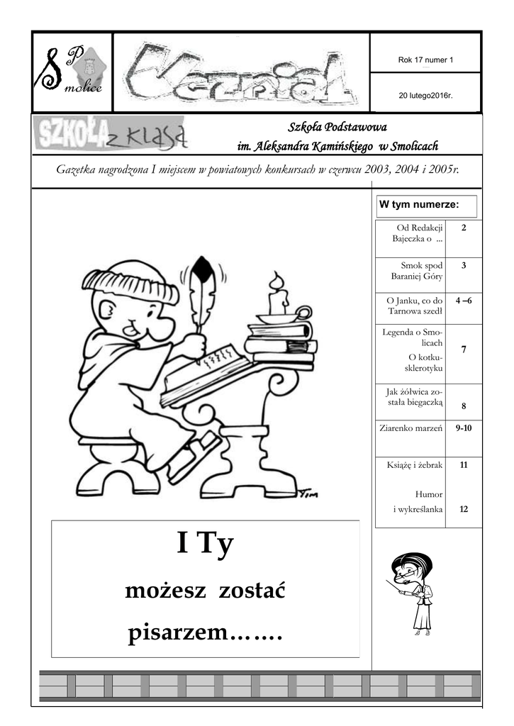 Smolice Rok 17, nu mer 1 Rok 17, nu mer 1 P Rok 17 numer 1 Mini ster s two Edu kac ji Nar o d owej Rok 17 numer 1 20 lutego2016r. Szkoła Podstawowa im. Aleksandra Kamińskiego w Smolicach Gazetka nagrodzona I miejscem w powiatowych konkursach w czerwcu 2003, 2004 i 2005r. W tym numerze: Od Redakcji Bajeczka o ... 2 Smok spod Baraniej Góry 3 O Janku, co do Tarnowa szedł 4 –6 Legenda o Smolicach O kotkusklerotyku Jak żółwica została biegaczką Ziarenko marzeń Książę i żebrak 7 8 9-10 11 Humor i wykreślanka I Ty możesz zostać pisarzem……. 12 Rok 17, numer 1 Str. 2 Od Redakcji Kochani Czytelnicy Nagrodzony tekst Bartosza znajdzieZaczynamy kolejny rok naszej przy- cie w tym numerze, a oprócz niego poznacie gody w zespole redakcyjnym szkolnej ga- inne formy literackie– bajki, bajeczki i opowiadania. Mamy nadzieję, że Wam się zetki „ Ucznial”. W roku ubiegłym grupę redaktorów tworzyli uczniowie klasy IV i V. spodobają i może zainspirują do podjęcia Teraz , rok starsi, nadal próbują redagować własnej twórczości. pisemko, żeby nie tylko pokazać co ciekaZapraszamy oczywiście wszystkich wego dzieje się w szkole, ale i spotkać się chętnych na spotkania kółka redakcyjnego– po lekcjach z kolegami, porozmawiać, miło każdy czwartek od 13.20 do 15.00. Udowodi twórczo spędzić popołudnie. Efekt ich nimy, że każdy może zostać pisarzem. pracy oddajemy teraz do Waszych rąk. Życzymy miłej lektury Przed Wami kolejny numer naszego pisemka, ale jak zauważycie inny niż dotychczas. Postanowiliśmy trochę poeksperymentować i w ramach tego eksperymentu powstał właśnie „ Ucznial” w całości wypełniony samodzielnie napisanymi tekstami. Nie ukrywamy, że zainspirował nas sukces redakcyjnego kolegi Bartosza, który za swoją legendę zdobył 2 miejsce w konkursie literackim „ Czytam, bo lubię” zorganizowanym przez Stowarzyszenie „ Raciechowice2005” w ramach projektu „ Czytanie w Małopolsce– lubię to!”. Redakcja Ludzie czytają i często także znajdują w sobie odwagę, aby pisać. Bo pisanie zawsze wymaga odwagi. Poddać ocenie innych swoje teksty, napisać je lub wyciągnąć z ukrycia, "z szuflady", to odwaga poddania się ocenie innych. Janusz Leon Wiśniewski Bajeczka o bohaterskim Bąbelku Żył sobie piesek o imieniu Bąbel. Piesek ten nie miał domu ani rodziny. Pewnego dnia podczas przechadzki po parku usłyszał wołanie o pomoc. Co sił w nogach pobiegł w stronę tego głosu. Kiedy tam dobiegł, zobaczył palący się budynek. W oknie stał mały chłopczyk i nie mógł uciec. Bąbel bez zastanowienia wskoczył do budynku i uratował chłopca. W nagrodę piesek dostał medal za odwagę i zamieszkał u chłopca, którego uratował. Daniel Piórowski Rok 17 numer 1 Str. 3 Smok spod Baraniej Góry Spod Baraniej Góry Wisła wypływa, historia właśnie dotyczy tej rzeki. Dawno, dawno temu pod Baranią Górą było sobie małe miasteczko, w którym mieszkał chłopiec o imieniu Jaś. Pewnego dnia pod Baranią Górą zamieszkał smok, który był mniej sławnym kuzynem Smoka Wawelskiego. Gdy zobaczył miasteczko, poczuł się tak głodny, że od razu tam poszedł. Jaś wystraszył się smoka i pobiegł na górę do swojej małej jaskini. Gdy tam się schował, przypomniał sobie bajkę o Smoku Wawelskim. Chciał powiedzieć o tym swoim przyjaciołom i sąsiadom, jednak oni nie chcieli go słuchać. Chłopiec postanowił zrobić to sam , ale nie wiedział skąd wziąć barana, smok większość zjadł, a pozostałe uciekły. Następnego dnia Jaś idąc do swej jaskini, znalazł leżącego martwego barana, wziął go do szewca, który był ojcem jego przyjaciela. Poprosił go, żeby wypchał barana siarką kupioną w sklepiku. Szewc wykonał swoje zadanie perfekcyjnie, nie dało się odróżnić martwego barana od żywego. Z wyjątkiem tego, że jeden się nie ruszał, ale smok się przecież da nabrać. Jaś znalazł legowisko smoka i podłożył mu tam barana. Następnego ranka w promieniu wielu kilometrów dało się słyszeć straszliwy ryk, jednak tylko Jaś wiedział co się stało i uśmiechnięty siedział pod górą. To smok poczuł straszliwe pieczenie w brzuchu. Szybko pobiegł do źródła Wisły i pił, pił, pił… Gdy smok pił, poziom rzeki obniżył się tak bardzo, że w Gdańsku handlarze trzymali się za głowy i biadolili, bo ich statki utknęły na dnie Wisły. Nagle rozległo się wielkie BOOOOOM!!!!!!!! Całe miasto wraz z Baranią Górą podskoczyło. Jasiu zadowolony udał się do źródła Wisły i zobaczył wgłębienie po wybuchu. Nie chwalił się tym, więc nikt nie poznał historii o kuzynie smoka wawelskiego, co mieszkał pod Baranią Górą. Bartosz Mucha Str. 4 Rok 17, numer 1 O Janku, co do Tarnowa szedł na skróty Praca nagrodzona 2 miejscem w konkursie literackim „ Czytam, bo lubię” zorganizowanym przez Stowarzyszenie „ Raciechowice2005” w ramach projektu „ Czytanie w Małopolsce– lubię to!” Dawne to były czasy złowieszcze i niepewne, od wsi do miast bowiem przechodziły historie, żeby uważać na to gdzie się idzie. Z Krakowa do Tarnowa bezpieczniej było iść dłuższą drogą z powodu węży, co swe legowiska miały wokół Kroczyc. W Krakowie mieszkał z rodzicami jedenastoletni chłopak o imieniu Janek. Wiodło mu się dobrze. W szkole dostawał dobre oceny, a koledzy go lubili. Janek był silnym i wysportowanym chłopcem, włosy miał koloru złotego, a jego oczy zachwycały błękitem niczym morze. Chłopczyna w wolne chwile roznosił gazety, żeby zarobić sobie trochę grosza. Każdego roku na początku wakacji odwiedzał swoją babcię i dziadka, którzy mieszkali w Tarnowie. Niestety okazało się, że główna droga do tego miasta z powodu burzy została zalana, Janek myślał, że woda opadnie, jednak się na to nie zanosiło. Zostało sześć dni do końca roku szkolnego, chłopak był bardzo niezadowolony, ponieważ sytuacja na drodze się nie 