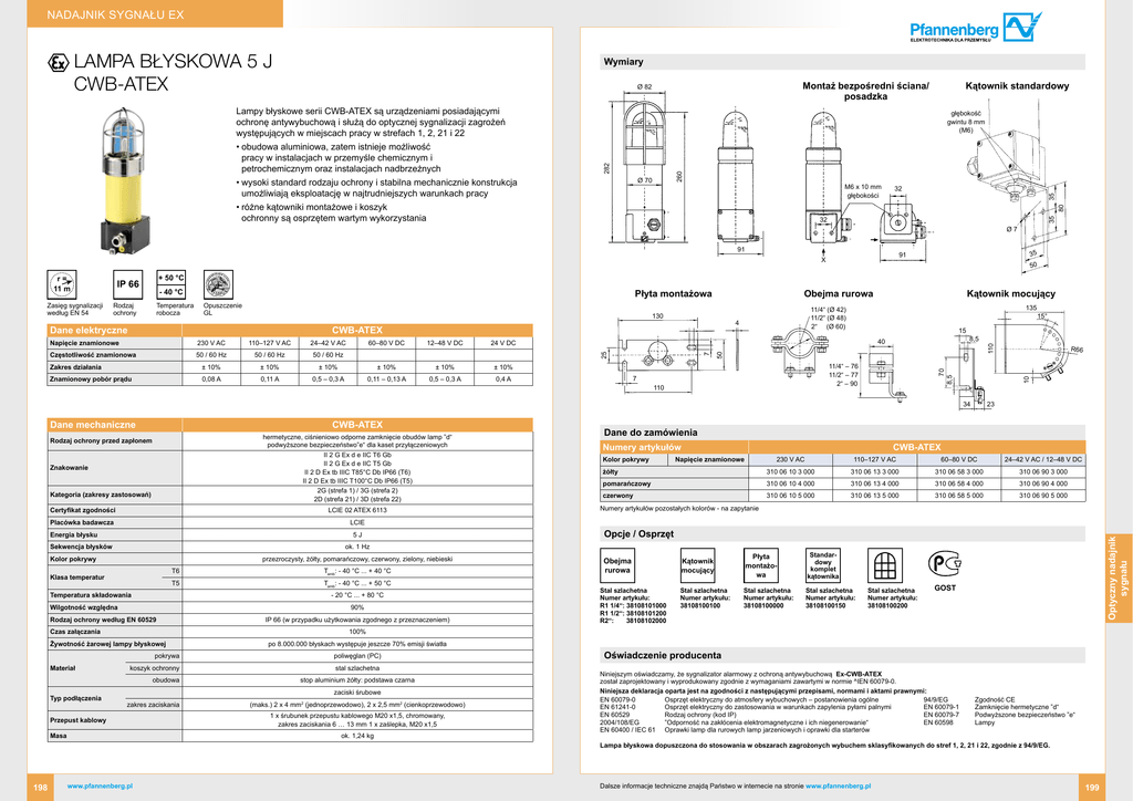 Nadajnik sygnału Ex Lampa błyskowa 5 J CWB-ATEX Wymiary Montaż bezpośredni ściana/ posadzka Ø 82 Kątownik standardowy Lampy błyskowe serii CWB-ATEX są urządzeniami posiadającymi ochronę antywybuchową i służą do optycznej sygnalizacji zagrożeń występujących w miejscach pracy w strefach 1, 2, 21 i 22 260 282 Ø 70 •wysoki standard rodzaju ochrony i stabilna mechanicznie konstrukcja umożliwiają eksploatację w najtrudniejszych warunkach pracy M6 x 10 mm głębokości 80 •różne kątowniki montażowe i koszyk ochronny są osprzętem wartym wykorzystania 32 35 •obudowa aluminiowa, zatem istnieje możliwość pracy w instalacjach w przemyśle chemicznym i petrochemicznym oraz instalacjach nadbrzeżnych głębokość gwintu 8 mm (M6) 35 32 Ø7 91 Płyta montażowa Opuszczenie GL Obejma rurowa 130 Dane elektryczne 4 CWB-ATEX Napięcie znamionowe 230 V AC 110–127 V AC 24–42 V AC Częstotliwość znamionowa 50 / 60 Hz 50 / 60 Hz 50 / 60 Hz Zakres działania ± 10% ± 10% Znamionowy pobór prądu 0,08 A 0,11 A 12–48 V DC 24 V DC ± 10% ± 10% ± 10% ± 10% 0,5 – 0,3 A 0,11 – 0,13 A 0,5 – 0,3 A 0,4 A 135 15 40 25 60–80 V DC Kątownik mocujący 11/4“ (Ø 42) 11/2“ (Ø 48) 2“ (Ø 60) 11/4“ – 76 11/2“ – 77 2“ – 90 7 110 8,5 34 CWB-ATEX hermetyczne, ciśnieniowo odporne zamknięcie obudów lamp ”d“ podwyższone bezpieczeństwo”e“ dla kaset przyłączeniowych Rodzaj ochrony przed zapłonem II 2 G Ex d e IIC T6 Gb II 2 G Ex d e IIC T5 Gb II 2 D Ex tb IIIC T85°C Db IP66 (T6) II 2 D Ex tb IIIC T100°C Db IP66 (T5) 2G (strefa 1) / 3G (strefa 2) 2D (strefa 21) / 3D (strefa 22) Znakowanie Kategoria (zakresy zastosowań) Certyfikat zgodności LCIE 02 ATEX 6113 Placówka badawcza LCIE Energia błysku 5J Sekwencja błysków przezroczysty, żółty, pomarańczowy, czerwony, zielony, niebieski Klasa temperatur T6 Tamb: - 40 °C ... + 40 °C T5 Tamb: - 40 °C ... + 50 °C Temperatura składowania - 20 °C ... + 80 °C Wilgotność względna 90% Rodzaj ochrony według EN 60529 Czas załączania Kolor pokrywy CWB-ATEX Napięcie znamionowe 230 V AC 110–127 V AC 60–80 V DC 24–42 V AC / 12–48 V DC żółty 310 06 10 3 000 310 06 13 3 000 310 06 58 3 000 310 06 90 3 000 pomarańczowy 310 06 10 4 000 310 06 13 4 000 310 06 58 4 000 310 06 90 4 000 czerwony 310 06 10 5 000 310 06 13 5 000 310 06 58 5 000 310 06 90 5 000 Numery artykułów pozostałych kolorów - na zapytanie Opcje / Osprzęt Obejma rurowa Stal szlachetna Numer artykułu: R1 1/4“: 38108101000 R1 1/2“: 38108101200 R2“: 38108102000 Kątownik mocujący Płyta montażowa Standardowy komplet kątownika Stal szlachetna Numer artykułu: 38108100100 Stal szlachetna Numer artykułu: 38108100000 Stal szlachetna Numer artykułu: 38108100150 Stal szlachetna Numer artykułu: 38108100200 GOST po 8.000.000 błyskach występuje jeszcze 70% emisji światła pokrywa poliwęglan (PC) koszyk ochronny stal szlachetna obudowa Typ podłączenia Numery artykułów 100% Żywotność żarowej lampy błyskowej Materiał IP 66 (w przypadku użytkowania zgodnego z przeznaczeniem) 23 Dane do zamówienia ok. 1 Hz Kolor pokrywy R66 Optyczny nadajnik sygnału Dane mechaniczne 15° 110 Temperatura robocza 10 - 40 °C Rodzaj ochrony 70 8,5 IP 66 7 Zasięg sygnalizacji według EN 54 50 + 50 °C 50 r= 11 m 35 91 X stop aluminium żółty: podstawa czarna zaciski śrubowe zakres zaciskania Przepust kablowy Masa (maks.) 2 x 4 mm2 (jednoprzewodowo), 2 x 2,5 mm2 (cienkoprzewodowo) 1 x śrubunek przepustu kablowego M20 x1,5, chromowany, zakres zaciskania 6 … 13 mm 1 x zaślepka, M20 x1,5 ok. 1,24 kg Oświadczenie producenta Niniejszym oświadczamy, że sygnalizator alarmowy z ochroną antywybuchową Ex-CWB-ATEX został zaprojektowany i wyprodukowany zgodnie z wymaganiami zawartymi w normie ^IEN 60079-0. Niniejsza deklaracja oparta jest na zgodności z następującymi przepisami, normami i aktami prawnymi: EN 60079-0 Osprzęt elektryczny do atmosfery wybuchowych – postanowienia ogólne 94/9/EG EN 61241-0 Osprzęt elektryczny do zastosowania w warunkach zapylenia pyłami palnymi EN 60079-1 EN 60529 Rodzaj ochrony (kod IP) EN 60079-7 2004/108/EG ”Odporność na zakłócenia elektromagnetyczne i ich niegenerowanie“ EN 60598 EN 60400 / IEC 61 Oprawki lamp dla rurowych lamp jarzeniowych i oprawki dla starterów Zgodność CE Zamknięcie hermetyczne ”d“ Podwyższone bezpieczeństwo ”e“ Lampy Lampa błyskowa dopuszczona do stosowania w obszarach zagrożonych wybuchem sklasyfikowanych do stref 1, 2, 21 i 22, zgodnie z 94/9/EG. 198 www.pfannenberg.pl Dalsze informacje techniczne znajdą Państwo w internecie na stronie www.pfannenberg.pl 199