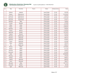 Łącznie wszystkie płatności: 8 028 689,68 PLN Lp. Imię 1 Elżbieta 2 Dariusz 3 Genowefa 4 Krzysztof 5 6 Nazwisko Nazwa Gmina Kod pocztowy Suma Adamska Lgota Wielka 97-565 3 852,98 Albrychowicz Lgota Wielka 97-565 116 384,58 Albrychowicz Lgota Wielka 97-565 6 890,70 Albrychowicz Lgota Wielka 97-565 51 631,85 Krzysztof Augustowski Lgota Wielka 97-565 3 534,17 Stanisław Bałut Lgota Wielka 97-565 7 580,86 7 Czesław Barański Lgota Wielka 97-565 6 795,09 8 Błażej Barda Lgota Wielka 97-565 74 816,70 9 Hubert Barda Lgota Wielka 97-565 10 800,29 10 Stanisław Barda Lgota Wielka 97-565 4 864,05 11 Tomasz Barszcz Lgota Wielka 97-565 11 229,54 12 Agnieszka Bartnik Lgota Wielka 97-565 24 318,95 13 Andrzej Bartosik Lgota Wielka 97-565 2 532,22 14 Wiesława Bednarczyk Lgota Wielka 97-565 1 876,39 15 Wiesława Bednarska Lgota Wielka 97-565 4 485,35 16 Zdzisława Bednarska Lgota Wielka 97-565 4 244,65 17 Żaneta Bednarska Lgota Wielka 97-565 6 285,00 18 Beata Bedyńska Lgota Wielka 97-565 1 038,39 19 Jan Będkowski Lgota Wielka 97-565 9 800,12 20 Bożena Białek Lgota Wielka 97-565 22 610,66 21 Henryk Białek Lgota Wielka 97-565 4 171,78 22 Krystyna Białek Lgota Wielka 97-565 3 944,07 23 Krzysztof Białek Lgota Wielka 97-565 6 576,48 24 Rafał Białek Lgota Wielka 97-565 100 000,00 25 Wiesława Białek Lgota Wielka 97-565 1 976,59 26 Jadwiga Biczak Lgota Wielka 97-565 9 080,91 27 Andrzej Biernacki Lgota Wielka 97-565 4 080,70 28 Paweł Biernacki Lgota Wielka 97-565 7 086,57 29 Sławomir Blada Lgota Wielka 97-565 24 173,72 30 Krzysztof Błasiak Lgota Wielka 97-565 947,30 31 Agata Błaszczyk Lgota Wielka 97-565 3 115,18 Strona 1/17 32 Elżbieta Błaszczyk Lgota Wielka 97-565 5 403,79 33 34 Weronika Błędniak Lgota Wielka 97-565 3 333,78 Marek Błędowski Lgota Wielka 97-565 1 430,07 35 Czesław Borowiecki Lgota Wielka 97-565 12 564,65 36 Zofia Boruta Lgota Wielka 97-565 3 183,90 37 Barbara Botór Lgota Wielka 97-565 6 473,53 38 Bogusława Broniszewska Lgota Wielka 97-565 23 613,45 39 Paweł Broniszewski Lgota Wielka 97-565 9 538,86 40 Rafał Broniszewski Lgota Wielka 97-565 7 068,35 41 Joanna Bugajska Lgota Wielka 97-565 5 146,42 42 Zdzisław Bugajski Lgota Wielka 97-565 12 458,58 43 Edward Bujacz Lgota Wielka 97-565 27 002,04 44 Julita Bujacz Lgota Wielka 97-565 21 170,24 45 Karol Bujacz Lgota Wielka 97-565 11 355,40 46 Katarzyna Bujacz Lgota Wielka 97-565 4 460,40 47 Zenon Bujacz Lgota Wielka 97-565 16 857,33 48 Łukasz Cebula Lgota Wielka 97-565 147 004,59 49 ELŻBIETA CEBULA Lgota Wielka 97-565 10 076,90 50 Halina Cegieła Lgota Wielka 97-565 3 106,07 51 Stanisław Chałaczkiewicz Lgota Wielka 97-565 10 069,82 52 Eugeniusz Chaładaj Lgota Wielka 97-565 7 487,35 53 Anna Chądzyńska Lgota Wielka 97-565 1 502,94 54 Witold Chądzyński Lgota Wielka 97-565 15 320,96 55 Jolanta Chmielewska Lgota Wielka 97-565 5 456,11 56 Agnieszka Chobot Lgota Wielka 97-565 3 105,97 57 Paweł Chobot Lgota Wielka 97-565 407 715,17 58 Zdzisława Chodakowska Lgota Wielka 97-565 2 851,02 59 Paweł Chojka Lgota Wielka 97-565 14 870,53 60 Sławomir Chojka Lgota Wielka 97-565 1 156,80 61 Agnieszka Chrząszcz Lgota Wielka 97-565 8 070,31 62 Marianna Chrząszcz Lgota Wielka 97-565 12 309,21 63 Krzysztof Chwilczyński Lgota Wielka 97-565 7 387,16 64 Mieczysław Chwilczyński Lgota Wielka 97-565 106 362,65 65 Stefan Cichoń Lgota Wielka 97-565 1 812,63 66 Urszula Ciepluch Lgota Wielka 97-565 5 884,22 Strona 2/17 67 Andrzej Cierpisz Lgota Wielka 97-565 17 627,59 68 Elżbieta Cierpisz Lgota Wielka 97-565 6 357,87 69 Renata Cierpisz Lgota Wielka 97-565 7 368,94 70 Izabela Cieśla Lgota Wielka 97-565 2 368,26 71 Krzysztof Cieśla Lgota Wielka 97-565 19 930,16 72 Bogusława Cieślak Lgota Wielka 97-565 3 934,96 73 Grzegorz Cieślak Lgota Wielka 97-565 10 520,72 74 Jan Cieślak Lgota Wielka 97-565 7 507,42 75 Tomasz Cieślak Lgota Wielka 97-565 4 271,98 76 Joanna Cisowska - Łatacz Lgota Wielka 97-565 24 139,31 77 Bernard Cisowski Lgota Wielka 97-565 27 002,04 78 Kazimierz Ciupa Lgota Wielka 97-565 3 720,59 79 Anna Dąbrowska Lgota Wielka 97-565 15 578,16 80 Grzegorz Dąbrowski Lgota Wielka 97-565 910,87 81 Michał Dąbrowski Lgota Wielka 97-565 1 257,11 82 Przemysław Dąbrówka Lgota Wielka 97-565 65 623,96 83 Sławomir Dąbrówka Lgota Wielka 97-565 4 727,42 84 Jarosław Długosz Lgota Wielka 97-565 1 767,09 85 Marian Drab Lgota Wielka 97-565 15 578,16 86 Rafał Drogosz Lgota Wielka 97-565 3 561,50 87 Stanisław Drogosz Lgota Wielka 97-565 14 108,17 88 Wiesław Dróżdż Lgota Wielka 97-565 1 083,94 89 Kazimierz Dryja Lgota Wielka 97-565 8 252,48 90 Piotr Dudek Lgota Wielka 97-565 2 258,96 91 Adam Durka Lgota Wielka 97-565 7 724,18 92 Cezary Dyguda Lgota Wielka 97-565 951,86 93 Zofia Dyguda Lgota Wielka 97-565 8 313,00 94 Jan Dziadkiewicz Lgota Wielka 97-565 6 712,11 95 Leokadia Dzierżawa Lgota Wielka 97-565 3 547,23 96 Beata Dziuboń Lgota Wielka 97-565 5 720,26 97 Anna Dźbik Lgota Wielka 97-565 1 603,13 98 Tomasz Famulski Lgota Wielka 97-565 8 829,19 99 Anna Frach Lgota Wielka 97-565 3 051,41 100 Jacek Frankowski Lgota Wielka 97-565 1 184,13 101 Tomasz Frankowski Lgota Wielka 97-565 1 211,46 Strona 3/17 102 Zofia Frydrychowska Lgota Wielka 97-565 2 291,00 103 Rafał Frydrychowski Lgota Wielka 97-565 9 606,15 104 Marzanna Gadzińska Lgota Wielka 97-565 4 089,81 105 Artur Gajda Lgota Wielka 97-565 100 000,00 106 Bogumiła Gajda Lgota Wielka 97-565 1 484,72 107 Jacek Gajda Lgota Wielka 97-565 13 583,05 108 Roman Gajda Lgota Wielka 97-565 4 463,26 109 Czesław Gajewski Lgota Wielka 97-565 4 435,94 110 Małgorzata Gałkowska Lgota Wielka 97-565 3 716,35 111 Zdzisław Gałkowski Lgota Wielka 97-565 1 229,67 112 Dorota Gałwa Lgota Wielka 97-565 1 557,59 113 Norbert Gałwa Lgota Wielka 97-565 1 348,09 114 Aleksander Gbur Lgota Wielka 97-565 4 927,81 115 Krzysztof Gierakowski Lgota Wielka 97-565 4 481,48 116 Janina Giermata Lgota Wielka 97-565 8 370,70 117 Aneta Gliźniewicz Lgota Wielka 97-565 2 723,50 118 Marian Gonera Lgota W