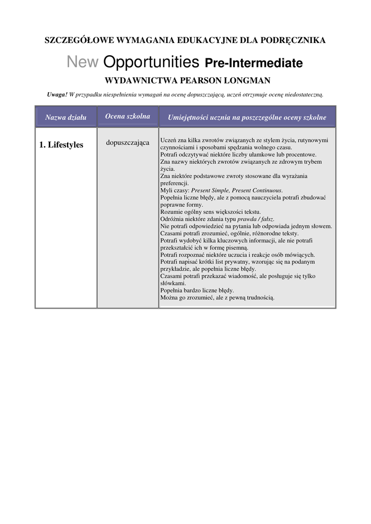 SZCZEGÓŁOWE WYMAGANIA EDUKACYJNE DLA PODRĘCZNIKA New Opportunities Pre-Intermediate WYDAWNICTWA PEARSON LONGMAN Uwaga! W przypadku niespełnienia wymagań na ocenę dopuszczającą, uczeń otrzymuje ocenę niedostateczną. Nazwa działu 1. Lifestyles Ocena szkolna Umiejętności ucznia na poszczególne oceny szkolne dopuszczająca Uczeń zna kilka zwrotów związanych ze stylem życia, rutynowymi czynnościami i sposobami spędzania wolnego czasu. Potrafi odczytywać niektóre liczby ułamkowe lub procentowe. Zna nazwy niektórych zwrotów związanych ze zdrowym trybem życia. Zna niektóre podstawowe zwroty stosowane dla wyrażania preferencji. Myli czasy: Present Simple, Present Continuous. Popełnia liczne błędy, ale z pomocą nauczyciela potrafi zbudować poprawne formy. Rozumie ogólny sens większości tekstu. Odróżnia niektóre zdania typu prawda / fałsz. Nie potrafi odpowiedzieć na pytania lub odpowiada jednym słowem. Czasami potrafi zrozumieć, ogólnie, różnorodne teksty. Potrafi wydobyć kilka kluczowych informacji, ale nie potrafi przekształcić ich w formę pisemną. Potrafi rozpoznać niektóre uczucia i reakcje osób mówiących. Potrafi napisać krótki list prywatny, wzorując się na podanym przykładzie, ale popełnia liczne błędy. Czasami potrafi przekazać wiadomość, ale posługuje się tylko słówkami. Popełnia bardzo liczne błędy. Można go zrozumieć, ale z pewną trudnością. Nazwa działu Ocena szkolna Umiejętności ucznia na poszczególne oceny szkolne dostateczna Uczeń zna podstawowe zwroty związane ze stylem życia, rutynowymi czynnościami i sposobami spędzaniem wolnego czasu. Potrafi odczytywać niektóre liczby ułamkowe i procentowe. Zna nazwy niektórych zwrotów związanych ze zdrowym trybem życia. Zna niektóre zwroty stosowane dla wyrażania preferencji. Zna podstawowe zwroty związane z podróżowaniem i wypoczynkiem. Stosuje czasy: Present Simple, Present Continuous , ale popełnia liczne błędy. Rozumie ogólny sens czytanych tekstów. Odróżnia większość zdań typu prawda / fałsz. Ma problemy z odpowiadaniem na pytania związane z tekstem. Rozumie ogólnie różnorodne teksty. Potrafi wydobyć część kluczowych informacji, przekształcić je, choć nieporadnie, w formę pisemną. Na ogół potrafi rozpoznać niektóre uczucia i reakcje osób mówiących. Potrafi napisać – z niewielkimi uchybieniami (np. tekst jest za krótki) – list prywatny, zachowując odpowiednią formę, stosując poznane na lekcji słownictwo i struktury gramatyczne, wzorując się na podanym przykładzie, ale popełnia dość liczne błędy. Potrafi przekazać wiadomość, ale mówi z wyraźnym wahaniem. Posługuje się ograniczonym słownictwem. Popełnia dość liczne błędy, ale można go zrozumieć. dobra Uczeń zna większość zwrotów związanych ze stylem życia, rutynowymi czynnościami i sposobami spędzania wolnego czasu. Zna słownictwo związane z ekologią, zdrowym trybem życia. Potrafi z odczytywać większość liczb ułamkowych i procentowych. Zna podstawowe zwroty stosowane dla wyrażania preferencji. Stosuje czasy: Present Simple, Present Continuous, popełnia nieliczne błędy. Rozumie czytane teksty. Odróżnia większość zdań typu prawda / fałsz. Odpowiada na pytania związane z tekstem, przy czym często posługuje się fragmentami tekstu. Rozumie ogólnie różnorodne teksty. Potrafi wydobyć większość kluczowych informacji, przekształcić je w formę pisemną. Na ogół potrafi rozpoznać uczucia i reakcje osób mówiących. Potrafi napisać list prywatny, zachowując właściwą formę, stosując poznane na lekcji słownictwo i struktury gramatyczne, wzorując się na podanym przykładzie. Potrafi mówić spójnie, z niewielkim wahaniem, wyrażać opinie, uzasadniając je, stosując – dość poprawnie – poznane na lekcji słownictwo i struktury gramatyczne. Posługuje się w miarę poprawnym językiem, popełniając nieliczne, ale zauważalne, błędy. Nazwa działu Ocena szkolna Umiejętności ucznia na poszczególne oceny szkolne bardzo dobra Uczeń zna zdecydowaną większość zwrotów związanych ze stylem życia, rutynowymi czynnościami i sposobami spędzania wolnego czasu. Zna słownictwo związane z ekologią, zdrowym trybem życia. Potrafi, z nielicznymi błędami, odczytywać liczby ułamkowe i procentowe. Zna większość zwrotów stosowanych dla wyrażania preferencji. Stosuje czasy: Present Simple, Present Continuous, popełnia nieliczne błędy. Rozumie czytane teksty, odróżnia zdania typu prawda / fałsz. Odpowiada bezbłędnie na pytania związane z tekstem. Czasami posługuje się fragmentami tekstu. Rozumie różnorodne teksty. Potrafi wydobyć wszystkie kluczowe informacje, przekształcić je w formę pisemną. Potrafi napisać bezbłędnie o swoim wymarzonym zawodzie, stylu życia, stosując dość bogate słownictwo i struktury gramatyczne. Potrafi rozpoznać uczucia i reakcje osób mówiących. Potrafi mówić spójnie, wyrażać opinie, uzasadniając je, stosując dość bogate słownictwo i struktury gramatyczne. Posługuje się dość poprawnym językiem, popełniając nieliczne błędy. celująca Uczeń zna wszystkie zwroty związane ze stylem życia, rutynowymi czynnościami i sposobami spędzania wolnego czasu. Zna słownictwo związane z ekologią, zdrowym trybem życia. Potrafi odczytywać liczby ułamkowe i procentowe. Zna wszystkie zwroty stosowane dla wyrażania preferencji. Bezbłędnie stosuje czasy: Present Simple, Present Continuous, czasowniki: like / love / hate / prefer / enjoy / can’t stand + gerund, -ing po przedimkach, czasownikach, w funkcji podmiotu i jako część czasu gramatycznego. Rozumie doskonale czytane teksty. Odróżnia zdania typu prawda / fałsz. Odpowiada bezbłędnie, własnymi słowami, na pytania związane z tekstem. Bezbłędnie rozumie różnorodne teksty. Potrafi bezbłędnie wydobyć wszystkie potrzebne informacje, przekształc