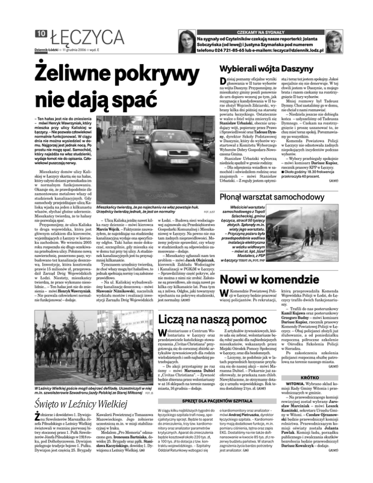 10 ŁĘCZYCA CZEKAMY NA SYGNAŁY Na sygnały od Czytelników czekają nasze reporterki: Jolanta Sobczyńska (od lewej) i Justyna Szymańska pod numerem telefonu 024 721-85-65 lub e-mailem: [email protected] Dziennik Łódzki đ 11 grudnia 2006 đ wyd. E Żeliwne pokrywy nie dają spać Wybierali wójta Daszyny D zisiaj poznamy oficjalne wyniki głosowania w II turze wyborów na wójta Daszyny. Przypomnijmy, że mieszkańcy gminy poszli ponownie do urn dopiero wczoraj po tym, jak rezygnację z kandydowania w II turze złożył Wojciech Zdziarski, wybrany kilka dni później na starostę powiatu łęczyckiego. Ostatecznie w walce o fotel wójta zmierzyli się Stanisław Urbański, obecnie urzędujący wójt, popierany przez Prawo i Sprawiedliwość oraz Tadeusz Dymny, dyrektor Szkoły Podstawowej w Daszynie, który do wyborów wystartował z Komitetu Wyborczego Wyborców Dobry Gospodarz-Nowoczesna Gmina. Stanisław Urbański wyborczą niedzielę spędził w gronie rodziny. – Dla odprężenia wsiadłem w samochód i odwiedziłem rodzinę oraz znajomych – mówi Stanisław Urbański. – Z reguły jestem optymi- – Ten hałas jest nie do zniesienia – mówi Henryk Wawrzyniak, który mieszka przy ulicy Kaliskiej w Łęczycy. – Nie pozwala człowiekowi normalnie funkcjonować. W ciągu dnia nie można wysiedzieć w domu. Najgorzej jest jednak nocą. Po prostu nie mogę spać. Samochód, który najeżdża na właz studzienki, wydaje łomot nie do opisania. Człowiekowi puszczają nerwy. Mieszkańcy domów ulicy Kaliskiej w Łęczycy skarżą się na hałas, który całymi dniami przeszkadza im w normalnym funkcjonowaniu. Okazuje się, że prawdopodobnie źle zamontowano metalowe włazy od studzienek kanalizacyjnych. Gdy samochody przejeżdżające ulicą Kaliską wjadą na jeden z kilkunastu włazów, słychać głośne uderzenie. Mieszkańcy twierdzą, że te hałasy nie pozwalają spać. Przypomnijmy, że ulica Kaliska to droga wojewódzka, która jest głównym szlakiem dla kierowców, wyjeżdżających z Łęczycy w kierunku zachodnim. We wrześniu 2005 roku rozpoczęła się długo oczekiwana przebudowa ulicy. Położono nową nawierzchnię, poszerzono pasy, wybudowano też kanalizację deszczową. Inwestycję, która kosztowała prawie 15 milionów zł, przeprowadził Zarząd Dróg Wojewódzkich w Łodzi. Niestety, mieszkańcy twierdzą, że prace wykonano niesolidnie... – Ten hałas jest nie do zniesienia – mówi Henryk Wawrzyniak. – Nie pozwala człowiekowi normalnie funkcjonować – dodaje. Płonął warsztat samochodowy Mieszkańcy twierdzą, że po najechaniu na właz powstaje huk. Urzędnicy twierdzą jednak, że jest on normalny – Ulicą Kaliską jeżdżę nawet kilka razy dziennie – mówi kierowca Marcin Wójcik. – Faktycznie zauważyłem, że najeżdżając na studzienkę kanalizacyjną wydaje ona specyficzny odgłos. Taki hałas może dokuczać, szczególnie, gdy mieszka się w domu tuż przy tej ulicy. A studzienek kanalizacyjnych jest tu przynajmniej kilkanaście. Tymczasem urzędnicy twierdzą, że choć włazy mogą być hałaśliwe, to jednak spełniają normy i są założone prawidłowo. – Na ul. Kaliskiej wybudowaliśmy kanalizację deszczową – mówi Sławomir Niżnikowski, naczelnik wydziału mostów i realizacji inwestycji Zarządu Dróg Wojewódzkich FOT. JUST w Łodzi. – Budową sieci wodociągowej zajmowało się Przedsiębiorstwo Gospodarki Komunalnej i Mieszkaniowej w Łęczycy. Na pewno nie ma tam żadnych nieprawidłowości. Możemy jedynie sprawdzić, czy włazy w studzienkach są odpowiednio zamocowane – dodaje. – Mieszkańcy zgłaszali nam ten problem – mówi Jacek Olejniczak, kierownik Zakładu Wodociągów i Kanalizacji w PGKiM w Łęczycy. – Sprawdziliśmy część pokryw, ale nie można z nimi nic zrobić. Założone są prawidłowo, ale mają nawet po kilka czy kilkanaście lat. Poza tym są z żeliwa. Odgłos, jaki towarzyszy wjechaniu na pokrywę studzienki, jest normalny. (JUST) Właściciel warsztatu samochodowego z Topoli Szlacheckiej, gmina Łęczyca, stracił 50 tysięcy złotych. Spłonęły m.in. wiaty jego warsztatu. – Przyczyną pożaru była prawdopodobnie wadliwa instalacja elektryczna w wózku widłowym – mówi st. kpt. Józef Mastalerz, z PSP w Łęczycy TEKST JS, FOT. PSP Nowi w komendzie W Komendzie Powiatowej Policji w Łęczycy będzie pracować więcej policjantów. Po rekrutacji, Liczą na naszą pomoc W W Leźnicy Wielkiej goście mogli obejrzeć defiladę. Uczestniczyli w niej m.in. szwoleżerowie Szwadronu Jazdy Polskiej ze Starej Miłosnej FOT. JS Święto w Leźnicy Wielkiej Ż ołnierze i dowództwo 1. Dywizjonu Szwoleżerów Marszałka Józefa Piłsudskiego z Leźnicy Wielkiej świętowali w rocznicę pierwszej bitwy stoczonej przez 1. Pułk Szwoleżerów Józefa Piłsudskiego w 1918 roku, pod Dołhobyczowem. Dywizjon pielęgnuje tradycje bojowe 1. Pułku. Dywizjon jest częścią 25. Brygady stą i teraz też jestem spokojny. Jakoś specjalnie się nie denerwuje. W tej chwili jestem w Daszynie, u mojego brata i razem czekamy na rozstrzygnięcie II tury wyborów. Mniej rozmowy był Tadeusz Dymny. Choć zastaliśmy go w domu, nie chciał z nami rozmawiać. – Niedziela jeszcze nie dobiegła końca – usłyszeliśmy od Tadeusza Dymnego. – Czekam na rozstrzygnięcie i proszę uszanować to, że chcę mieć teraz spokój. Porozmawiamy po wszystkim. Komenda Powiatowa Policji w Łęczycy nie odnotowała żadnych niepokojących incydentów podczas wyborów. – Wybory przebiegały spokojnie – mówi komisarz Dariusz Kupisz, rzecznik prasowy KPP w Łęczycy. đ Około godziny 18.30 frekwencja przekroczyła 40 procent. (JUST) Kawalerii Powietrznej z Tomaszowa Mazowieckiego. Jego żołnierze uczestniczą m.in. w misji stabilizacyjnej w Iraku. Medalem „Pro Memoria” odznaczono gen. Ireneusza Bartniaka, dowódcę 25. Brygady oraz ppłk. Stanisława Kaczyńskiego, dowódcę 1. Dywizjonu z Leź