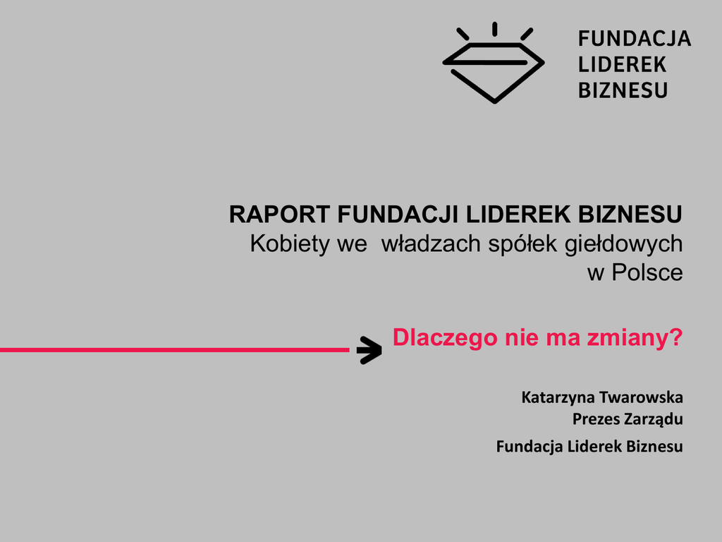 RAPORT FUNDACJI LIDEREK BIZNESU Kobiety we władzach spółek giełdowych w Polsce Dlaczego nie ma zmiany? Katarzyna Twarowska Prezes Zarządu Fundacja Liderek Biznesu Metodologia Przedmiotem analizy były: - składy zarządów oraz rad nadzorczych polskich spółek giełdowych, w podziale na Rynek Główny i NewConnect (901 spółek) - spółki posiadające we władzach co najmniej 3 kobiety (w zarządzie, RN lub w obu organach łącznie) - spółki, które nie posiadają żadnej kobiety we władzach - spółki WIG30 - spółki z co najmniej 25% udziału Skarbu Państwa Udział kobiet w zarządach i radach nadzorczych spółek giełdowych w Polsce – Rynek Główny i NewConnect łącznie, 2010 – 2014 Procentowy udział kobiet w zarządach spółek giełdowych w Polsce – Rynek Główny i NewConnect, 2010 – 2014 Procentowy udział kobiet w radach nadzorczych spółek giełdowych w Polsce – Rynek Główny i NewConnect, 2010 – 2014 Procentowy udział kobiet na stanowiskach prezesów zarządu – Rynek Główny i NewConnect,2010 - 2014 Procentowy udział kobiet na stanowiskach przewodniczących rad nadzorczych – Rynek Główny i NewConnect, 2010 - 2014 Procentowy udział kobiet na stanowiskach decyzyjnych w spółkach giełdowych w Polsce – Rynek Główny i NewConnect, 2010 - 2014 Spółki z co najmniej trzema kobietami we władzach, 2012 - 2014 901 spółek giełdowych 123 spółek (13,5%) Rynek Główny 55 takich spółek (12% rynku) NewConnect 68 spółek (16% rynku) Spółki WIG30 oraz Spółki Skarbu Państwa posiadające > 3 kobiety we władzach WIG30 Orange Polska S.A. mBank S.A. PKO BP S.A. Pekao S.A. ING Bank Śląski S.A. PGE S.A. Enea S,A, Alior Bank S.A. Lotos S.A. Spółki z udziałem Skrabu Państwa PKO BP S.A. PGE S.A. Enea S.A. Lotos S.A. Liczba kobiet w radzie nadzorczej i zarządzie w spółkach z co najmniej 3 kobietami we władzach, spółki z WIG30 oraz Skarbu Państwa, 2014 Spółki bez kobiet we władzach, 2012 - 2014 901 spółek giełdowych 312 spółek (35%) Rynek Główny 177 spółek (38% rynku) NewConnect 135 spółek (31% rynku) Spółki z WIG30 oraz Skarbu Państwa bez kobiet we władzach, 2012 - 2014 WIG30 JSW S.A. Asseco S.A. Lubelski Węgiel Bogdanka S.A. LPP S.A. Synthos S.A. Boryszew S.A. JSW S.A. Spółki z udziałem Skarbu Państwa Giełda Papierów Wartościowych w Warszawie S.A. Udział kobiet w zarządach i radach nadzorczych spółek giełdowych z udziałem Skarbu Państwa, 2012 -2014 W 14 spółkach giełdowych z udziałem Skarbu Państwa praktycznie nie ma kobiet w zarządach W 2014 kobiety były zaledwie w zarządach dwóch spółek (Enea i Tauron), przy czym ani jednej nie było na stanowisku prezesa Na 23 kobiety zasiadające w radach nadzorczych w 2014 roku 14 pracuje w Ministerstwie Skarbu Państwa, 1 kobieta w Ministerstwie Finansów, 1 kobieta w Kancelarii Prezesa Rady Ministrów oraz 1 kobieta w Agencji Rozwoju Przemysłu Od roku 2012 do roku 2014 widać wyraźny wzrost liczby kobiet w radach nadzorczych spółek Skarbu Państwa objętych badaniem. W 2012 roku – 15 kobiet, w 2013 – 20 kobiet, a w 2014 – 23 kobiety. Udział kobiet we władzach spółek giełdowych w Polsce WIG30 oraz Skarbu Państwa, 2012 - 2014 Regulacje Unii Europejskiej Źródło: Raport Komisji Europejskiej, 2013 Regulacje przyjęte przez kraje Unii Europejskiej Francja 40% Grecja 33% Hiszpania 40%* Włochy 33% Austria 35% Holandia 30% Belgia 33% Niemcy 30% Kraje, w których następuje znacząca zmiana Średnia Unii Europejskiej (20,2%) Kwoty Rekomendacje Francja (32,4%) Łotwa (31,7%) Holandia (24,9%) Finlandia (29,2%) Niemcy (24,4%) Szwecja (27,6%) Włochy (24,1%) Wielka Brytania (24,2%) Belgia (22%) Dania (24%) Zmiana udziału kobiet we władzach spółek w okresie październik 2010 – październik 2014 Udziału kobiet we władzach spółek należących do głównych indeksów na giełdach europejskich, 2012 - 2014 Czas na zmiany Przejrzyste procedury awansu i rekrutacji Transparentność - ujawnianie polityk i danych w zakresie zrównoważenia udziału kobiet i mężczyzn w organach spółki Monitoring postępów Ścieżka dojścia do stanowisk decyzyjnych Zaangażowanie biznesu, sfery publicznej oraz mediów w realizację wspólnych celów