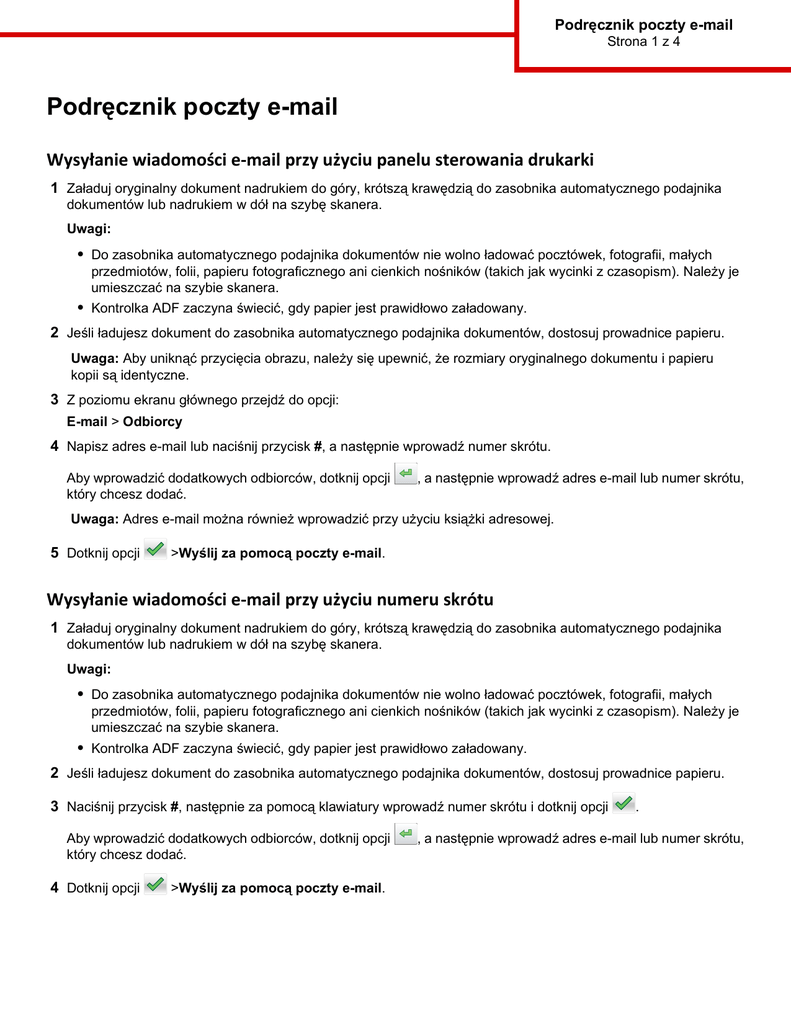 Podręcznik poczty e-mail Strona 1 z 4 Podręcznik poczty e-mail Wysyłanie wiadomości e-mail przy użyciu panelu sterowania drukarki 1 Załaduj oryginalny dokument nadrukiem do góry, krótszą krawędzią do zasobnika automatycznego podajnika dokumentów lub nadrukiem w dół na szybę skanera. Uwagi: • Do zasobnika automatycznego podajnika dokumentów nie wolno ładować pocztówek, fotografii, małych przedmiotów, folii, papieru fotograficznego ani cienkich nośników (takich jak wycinki z czasopism). Należy je umieszczać na szybie skanera. • Kontrolka ADF zaczyna świecić, gdy papier jest prawidłowo załadowany. 2 Jeśli ładujesz dokument do zasobnika automatycznego podajnika dokumentów, dostosuj prowadnice papieru. Uwaga: Aby uniknąć przycięcia obrazu, należy się upewnić, że rozmiary oryginalnego dokumentu i papieru kopii są identyczne. 3 Z poziomu ekranu głównego przejdź do opcji: E-mail > Odbiorcy 4 Napisz adres e-mail lub naciśnij przycisk #, a następnie wprowadź numer skrótu. Aby wprowadzić dodatkowych odbiorców, dotknij opcji który chcesz dodać. , a następnie wprowadź adres e-mail lub numer skrótu, Uwaga: Adres e-mail można również wprowadzić przy użyciu książki adresowej. 5 Dotknij opcji >Wyślij za pomocą poczty e-mail. Wysyłanie wiadomości e-mail przy użyciu numeru skrótu 1 Załaduj oryginalny dokument nadrukiem do góry, krótszą krawędzią do zasobnika automatycznego podajnika dokumentów lub nadrukiem w dół na szybę skanera. Uwagi: • Do zasobnika automatycznego podajnika dokumentów nie wolno ładować pocztówek, fotografii, małych przedmiotów, folii, papieru fotograficznego ani cienkich nośników (takich jak wycinki z czasopism). Należy je umieszczać na szybie skanera. • Kontrolka ADF zaczyna świecić, gdy papier jest prawidłowo załadowany. 2 Jeśli ładujesz dokument do zasobnika automatycznego podajnika dokumentów, dostosuj prowadnice papieru. 3 Naciśnij przycisk #, następnie za pomocą klawiatury wprowadź numer skrótu i dotknij opcji Aby wprowadzić dodatkowych odbiorców, dotknij opcji który chcesz dodać. 4 Dotknij opcji >Wyślij za pomocą poczty e-mail. . , a następnie wprowadź adres e-mail lub numer skrótu, Podręcznik poczty e-mail Strona 2 z 4 Wysyłanie wiadomości e-mail przy użyciu książki adresowej 1 Załaduj oryginalny dokument nadrukiem do góry, krótszą krawędzią do zasobnika automatycznego podajnika dokumentów lub nadrukiem w dół na szybę skanera. Uwagi: • Do zasobnika automatycznego podajnika dokumentów nie wolno ładować pocztówek, fotografii, małych przedmiotów, folii, papieru fotograficznego ani cienkich nośników (takich jak wycinki z czasopism). Należy je umieszczać na szybie skanera. • Kontrolka ADF zaczyna świecić, gdy papier jest prawidłowo załadowany. 2 Jeśli ładujesz dokument do zasobnika automatycznego podajnika dokumentów, dostosuj prowadnice papieru. 3 Z poziomu ekranu głównego przejdź do opcji: E-mail >Odbiorcy > > wpisz nazwę odbiorcy > 4 Dotknij nazwy odbiorcy. Aby szukać dodatkowych odbiorców, dotknij opcji Nowe wyszukiwanie, a następnie wpisz nazwę kolejnego odbiorcy. 5 Dotknij opcji >Wyślij za pomocą poczty e-mail. Informacje o opcjach dotyczących wiadomości e-mail Odbiorcy Opcja ta umożliwia wprowadzanie miejsc docelowych wiadomości e-mail. Można wprowadzić wiele adresów e-mail. Temat Opcja ta umożliwia wprowadzenie wiersza tematu do wiadomości e-mail. Wiadomość Opcja ta umożliwia wpisanie treści wiadomości e-mail, która zostanie wysłana z załącznikiem zawierającym zeskanowany obraz. Nazwa pliku Opcja ta umożliwia dostosowanie nazwy pliku załącznika. Zapisz jako skrót Ta opcja umożliwia zapisanie bieżących ustawień jako skrótu przez przypisanie numeru. Rozmiar oryginału Ta opcja pozwala wybrać rozmiar dokumentów przeznaczonych do wysłania przez e-mail. Jeśli w opcji „Rozmiar oryginału” wybrano ustawienie Rozmiary mieszane, możliwe jest skanowanie oryginalnego dokumentu zawierającego strony o różnych rozmiarach (strony w formacie Letter oraz Legal). Podręcznik poczty e-mail Strona 3 z 4 Intensywność Opcja ta umożliwia dostosowanie jasności (intensywności) obrazu powstałego w procesie skanowania w porównaniu z jasnością oryginalnego dokumentu. Rozdzielczość Opcja ta umożliwia dostosowanie jakości wydruku wiadomości e-mail. Zwiększenie rozdzielczości obrazu powstałego w procesie skanowania powoduje zwiększenie rozmiaru wiadomości e-mail oraz czasu skanowania oryginalnego dokumentu. Zmniejszenie rozdzielczości obrazu umożliwia zmniejszenie rozmiaru pliku. Wyślij jako Opcja ta umożliwia ustawienie typu skanowanego obrazu. Wybierz jedną z poniższych opcji: • PDF — umożliwia utworzenie pojedynczego pliku z wieloma stronami. Taki plik można wysłać w formie zabezpieczonej lub skompresowanej. • TIFF — umożliwia utworzenie wielu plików lub pojedynczego pliku. Jeśli opcja Wielostronicowy format TIFF jest wyłączona w menu ustawień aplikacji Embedded Web Server, opcja TIFF powoduje zapisanie każdej strony jako oddzielnego pliku. Rozmiar tego pliku jest zazwyczaj większy niż rozmiar odpowiadającego mu pliku w formacie JPEG. • JPEG — wybranie tej opcji spowoduje utworzenie i załączenie oddzielnego pliku dla każdej strony oryginału. • XPS — umożliwia utworzenie pojedynczego pliku XPS z wieloma stronami. Zawartość Opcja ta umożliwia ustawienie typu i źródła dokumentu oryginalnego. Wybierz jeden z następujących typów zawartości: • Grafika— ta opcja jest używana, jeśli oryginalny dokument zawiera głównie grafikę typu biznesowego, taką jak wykresy kołowe, słupkowe oraz animacje. • Fotografia — ta opcja jest stosowana wówczas, gdy oryginalny dokument zawiera głównie zdjęcia lub obrazy. • Tekst — ta opcja jest stosowana wówczas, gdy oryginalny dokument zawiera głównie tekst lub grafikę liniową. • Tekst