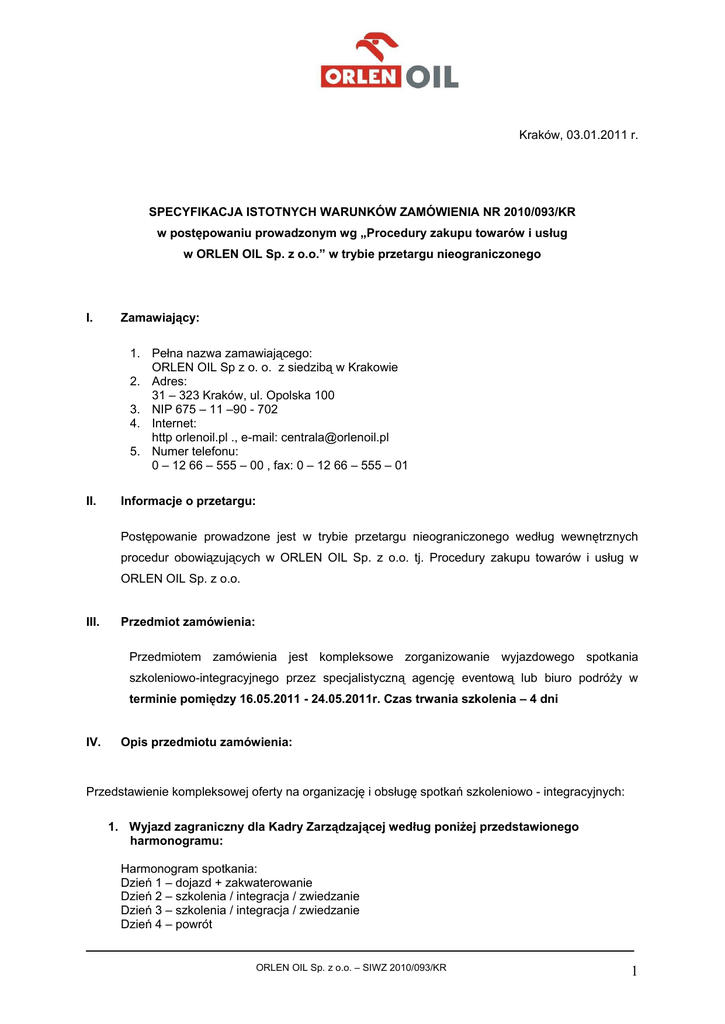 Kraków, 03.01.2011 r. SPECYFIKACJA ISTOTNYCH