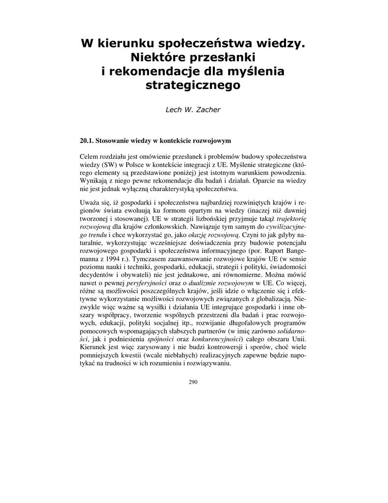 20.1. Stosowanie wiedzy w kontek cie rozwojowym Celem rozdziału jest omówienie przesłanek i problemów budowy społecze stwa wiedzy (SW) w Polsce w kontek cie integracji z UE. My lenie strategiczne (którego elementy s przedstawione poni ej) jest istotnym warunkiem powodzenia. Wynikaj z niego pewne rekomendacje dla bada i działa . Oparcie na wiedzy nie jest jednak wył czn charakterystyk społecze stwa. Uwa a si , i gospodarki i społecze stwa najbardziej rozwini tych krajów i regionów wiata ewoluuj ku formom opartym na wiedzy (inaczej ni dawniej tworzonej i stosowanej). UE w strategii lizbo skiej przyjmuje tak trajektori rozwojow dla krajów członkowskich. Nawi zuje tym samym do cywilizacyjnego trendu i chce wykorzysta go, jako okazj rozwojow . Czyni to jak gdyby naturalnie, wykorzystuj c wcze niejsze do wiadczenia przy budowie potencjału rozwojowego gospodarki i społecze stwa informacyjnego (por. Raport Bangemanna z 1994 r.). Tymczasem zaawansowanie rozwojowe krajów UE (w sensie poziomu nauki i techniki, gospodarki, edukacji, strategii i polityki, wiadomo ci decydentów i obywateli) nie jest jednakowe, ani równomierne. Mo na mówi nawet o pewnej peryferyjno ci oraz o dualizmie rozwojowym w UE. Co wi cej, ró ne s mo liwo ci poszczególnych krajów, je li idzie o wł czenie si i efektywne wykorzystanie mo liwo ci rozwojowych zwi zanych z globalizacj . Niezwykle wi c wa ne s wysiłki i działania UE integruj ce gospodarki i inne obszary współpracy, tworzenie wspólnych przestrzeni dla bada i prac rozwojowych, edukacji, polityki socjalnej itp., rozwijanie długofalowych programów pomocowych wspomagaj cych słabszych partnerów (w imi zarówno solidarnoci, jak i podniesienia spójno ci oraz konkurencyjno ci) całego obszaru Unii. Kierunek jest wi c zarysowany i nie budzi kontrowersji i sporów, cho wiele pomniejszych kwestii (wcale niebłahych) realizacyjnych zapewne b dzie napotyka na trudno ci w ich rozumieniu i rozwi zywaniu. 290 Lech W. Zacher 291 Istotne, by nie traktowa strategii lizbo skiej w sposób statyczny i dogmatyczny. W gospodarce rynkowej (cho w UE i jej pa stwach członkowskich do znacz co regulowanej i koordynowanej) oraz w warunkach globalizacji, która „dotyka” nie tylko Uni jako cało , ale i poszczególne jej kraje członkowskie, nie byłoby to rozs dne. Co wi cej, sama strategia ju si zestarzała i wymaga pewnej aktualizacji (ten postulat b dzie w miar upływu czasu ci gle aktualny – por. Niklewicz, Sołtyk, 2005). A zatem, faktyczne procesy rozwojowe w Unii b d w jakiej mierze ywiołowe (i przeto podlegaj ce pewnej chaotyzacji, czy w efekcie bł dnych wyborów ekonomicznych, konkurencji czy tzw. bł dów rynku) oraz podlegaj ce presji zmieniaj cego si otoczenia – wewn trznego i zewn trznego (globalnego, te geopolitycznego – zwi zanego np. z pozycj gospodarki ChRL, z dost pno ci do zasobów energetycznych, z kwestiami ochrony rodowiska, z zagadnieniami bezpiecze stwa, terroryzmu itp.). Nacisk zatem powinien by poło ony na budow , rozwój i uefektywnianie potencjału wiedzy całej Unii oraz jej poszczególnych cz ci, na koordynacj tych procesów i d enie do uzyskania synergii wspólnych działa . Mo na chyba przyj – wobec wspomnianego wy ej zró nicowania poziomów, mo liwo ci, oddziaływa i polityk – i nie ma jakiej jednej, „jedynie słusznej” drogi. Korzystne i efektywne poł czenie krajowych aspiracji i mo liwo ci z integracyjnym oddziaływaniem i pomoc Unii oraz z potencjalnymi korzy ciami z globalizacji (por. Zacher, 2003) nie b dzie w adnym przypadku automatyczne i łatwe, przeciwnie – b dzie trudn sztuk , która musi si opiera na powszechnym procesie społecznego uczenia si . Proces ten musi obejmowa elity polityczne, decydentów wszystkich szczebli, sfer biznesu, drobnej przedsi biorczo ci, rolników, sektory o wiaty i szkolnictwa, kr gi partii politycznych, organizacji pozarz dowych, wszystkich obywateli. Rola wszelkiego typu instytucji edukacyjnych, szkoleniowych, konsultingu oraz mediów masowych, jak i specjalistycznych, jest w dziedzinie przebudowy wiadomo ci i my lenia nie do przecenienia. Zmiany te i cały proces uczenia si powinny prowadzi do wytworzenia si i umacniania sprzyjaj cych wyzwaniom integracyjnym (i globalizacyjnym) instytucji społecznych (w sensie socjologicznym – jako typów zachowa , postaw). Instytucje takie s cz ci kultury społecznej, która mo e zmianie sprzyja (czy j generowa ) lub nie. St d wielka waga tzw. impoderabiliów kulturowych (por. Sztompka, 1999 oraz Harrison i Huntington, 2003). 20.2. Warunki powodzenia a my lenie strategiczne o gospodarce i społecze stwie wiedzy Po yteczne byłoby, by wymuszenia integracyjne (traktatowe, wynikaj ce ze wspólnych polityk, ze strategii, uczenia si ) prowadziły do kreatywnej (a nie je- 292 W kierunku społecze stwa wiedzy… dynie pasywnej) adaptacji do obecnych i przyszłych wyzwa . Aby to si mogło zi ci , potrzeba innowacyjnego spojrzenia edukatorów, mediów i elit społecznych, otwartej debaty publicznej, rzetelnej informacji na temat mo liwo ci i szans, kosztów i korzy ci, tak e w perspektywie generacyjnej. Perspektyw tak powinny wytycza narodowe plany (programy) rozwoju. Pierwszy warunek ma charakter poznawczo-analityczny. Oznacza przezwyci enie retoryki polityczno-urz dniczej zwykle prezentowanej w mediach i rozmaitych dokumentach ministerialnych. Konieczne jest posiadanie – przez decydentów politycznych, biznes, media, obywateli – pogł bionej wiedzy o samej wiedzy oraz o gospodarkach i społecze stwach nazywanych jej imieniem. Taka wiedza uniemo liwi pozoracje polityczne, biznesowe, medialne, tak e naukowe przekonywuj ce, e budowa ich ju trwa, a sukces pewny i bliski. Cz sto wiedz uto samia si z informacj , a dost p do sieci internetowej staje si jedynym panaceum. Trudno w prostych słowach wytłumaczy ró nic , ale od mówi cych publicznie i od decydentów powinno si wymaga jej rozumienia (por. Zacher, 2002, 2003b, 2003c, 2004b). Przes