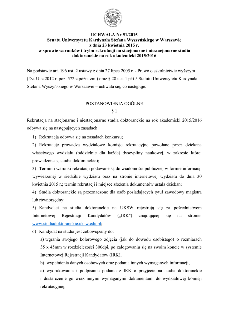 UCHWAŁA Nr 51/2015 - Uniwersytet Kardynała Stefana
