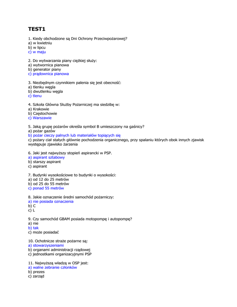 TEST1 1. Kiedy obchodzone są Dni Ochrony Przeciwpożarowej? a) w kwietniu b) w lipcu c) w maju 2. Do wytwarzania piany ciężkiej służy: a) wytwornica pianowa b) generator piany c) prądownica pianowa 3. Niezbędnym czynnikiem palenia się jest obecność: a) tlenku węgla b) dwutlenku węgla c) tlenu 4. Szkoła Główna Służby Pożarniczej ma siedzibę w: a) Krakowie b) Częstochowie c) Warszawie 5. Jaką grupę pożarów określa symbol B umieszczony na gaśnicy? a) pożar gazów b) pożar cieczy palnych lub materiałów topiących się c) pożary ciał stałych głównie pochodzenia organicznego, przy spalaniu których obok innych zjawisk występuje zjawisko żarzenia 6. Jaki jest najwyższy stopień aspirancki w PSP. a) aspirant sztabowy b) starszy aspirant c) aspirant 7. Budynki wysokościowe to budynki o wysokości: a) od 12 do 25 metrów b) od 25 do 55 metrów c) ponad 55 metrów 8. Jakie oznaczenie średni samochód pożarniczy: a) nie posiada oznaczenia b) C c) L 9. Czy samochód GBAM posiada motopompę i autopompę? a) nie b) tak c) może posiadać 10. Ochotnicze straże pożarne są: a) stowarzyszeniami b) organami administracji rządowej c) jednostkami organizacyjnymi PSP 11. Najwyższą władzą w OSP jest: a) walne zebranie członków b) prezes c) zarząd 12. Centralne Muzeum Pożarnictwa w Mysłowicach powstało w: a) 1967 roku b) 1971 roku c) 1975 roku 13. Kto jest obecnie Komendantem Głównym PSP? a) Wiesław Leśniakiewicz b) Kazimierz Krzowski c) Waldemar Pawlak 14. Zawodnikami w Młodzieżowych Zawodach Sportowo-Pożarniczych według regulaminu CTIF są dziewczęta i chłopcy w wieku: a) 8-15 lat b) 12-16 lat c) 16-18 lat 15. Odległość ustawienia sterty od budynku wykonanego z materiałów palnych powinna wynosić co najmniej: a) 20 m b) 30 m c) 50 m 16. Zgodnie z przepisami rozpalanie ognisk jest zabronione w odległości od budynków mniejszej niż: a) 5 m b) 10 m c) 20 m 17. Ile jest stopni zagrożenia pożarowego lasu? a) trzy b) cztery c) pięć 18. Do podręcznego sprzętu gaśniczego nie zaliczymy: a) koca gaśniczego b) hydronetki c) prądownicy uniwersalnej 19. Dwie gwiazdki bez otoku na naramienniku, oznaczają stopień służbowy w Państwowej Straży Pożarnej: a) starszego aspiranta b) młodszego kapitana c) aspiranta 20. Ile razy w roku należy usuwać zanieczyszczenia z przewodów dymowych od palenisk opalanych paliwem stałym (na przykład węglem) w budynku mieszkalnym? a) co najmniej raz w miesiącu b) co najmniej 2 razy c) co najmniej 4 razy 21. Jaki jest najwyższy stopień w korpusie oficerów PSP? a) starszy kapitan b) generał brygadier c) nadbrygadier 22. Jaki narząd jest najbardziej wrażliwy na niedotlenienie? a) serce b) nerki c) mózg 23. Krwotok tętniczy tamujemy opatrunkiem: a) foliowym b) osłaniającym c) uciskowym 24. Państwowa Straż Pożarna została utworzona: a) w 1921 roku b) w 1975 roku c) w 1992 roku 25. Do gaszenia urządzeń elektrycznych użyjesz: a) wody destylowanej b) gaśnicy proszkowej c) gaśnicy pianowej 26. Symbol W-75 oznacza: a) wąż pożarniczy grubości 75 cm b) wąż pożarniczy o średnicy 75 mm c) wąż pożarniczy o długości 75 m 27. Wytwornica pianowa WP 2/75 służy do wytwarzania piany: a) lekkiej b) średniej c) ciężkiej 28. Czy dopuszcza się garażowanie ciągnika rolniczego (traktora) w budynku stodoły? a) nie b) tak, jeżeli czas postoju ciągnika w budynku nie przekracza 60 minut c) tak, jeżeli opróżniony jest w ciągniku zbiornik paliwa 29. Pożary dzieli się w zależności od ich wielkości na: a) A, B, C, D b) mały, duży, bardzo duży c) mały, średni, duży, bardzo duży 30. Jaki gaz wydzielający się podczas pożaru stwarza zagrożenie zatrucia się: a) wodór b) tlen c) tlenek węgla TEST 2 1. Kto jest nazywany pionierem polskiego pożarnictwa? a) Józef Tuliszkowski b) Bolesław Chomicz c) Waldemar Pawlak 2. Co oznacza skrót ZOSP RP? a) Zawody Ochotniczych Straży Pożarnych Rzeczypospolitej Polskiej b) Zarząd Ochotniczej Służby Ratowniczej Rzeczypospolitej Polskiej c) Związek Ochotniczych Straży Pożarnych Rzeczypospolitej Polskiej 3. Pierwszą analizę stanu zagrożenia pożarowego w Polsce zawarto w słynnym dziele Andrzeja Frycz Modrzewskiego „O naprawie Rzeczypospolitej” wydanym w roku: a) 1500 b) 1551 c) 1651 4. W którym roku harcerskie drużyny pożarnicze przekształcono w harcerskie oddziały pożarne? a) w 1926 b) w 1936 c) w 1946 5. Zawodnikami w Młodzieżowych Zawodach Sportowo-Pożarniczych według regulaminu CTIF są dziewczęta i chłopcy w wieku: a) 8 -15 lat b) 12-16 lat c) 16-18 lat 6. Pierwszy ogólnopaństwowy zjazd delegatów straży pożarnej w Polsce w Warszawie odbył się: a) w 1921 roku b) w 1923 roku c) w 1946 roku 7. Strażackie akcje dywersyjne prowadzone podczas II wojny światowej przez Oddział Wojskowy „Skała” były prowadzone pod kryptonimem: a) „Gaśnica” b) „Pożar” c) „Bosak” 8. Jednostką organizacyjną Państwowej Straży Pożarnej w Białej Podlaskiej jest: a) Komenda Powiatowa Państwowej Straży Pożarnej w Białej Podlaskiej b) Komenda Rejonowa Państwowej Straży Pożarnej w Białej Podlaskiej c) Komenda Miejska Państwowej Straży Pożarnej w Białej Podlaskiej 9. Do wytwarzania piany ciężkiej służy: a) wytwornica pianowa b) generator piany c) prądownica pianowa 10. Na terenie wiejskim szerokość drogi pożarowej powinna wynosić a) 3 metry b) 3,5 metry c) 4 metry 11. Do gaśnic powinien być zapewniony dostęp o szerokości co najmniej: a) 0,5 metra b) 1,0 metr c) 1,5 metra 12. Hydranty wewnętrzne służą do : a) gaszenia pożaru w budynku przez straż pożarną b) gaszenia pożaru w obiekcie przez użytkowników obiektu c) zasilania w wodę stałych urządzeń gaśniczych 13. Hydranty zewnętrzne służą do: a) gaszenia pożaru na terenie przyległym przez straż pożarną b) gaszenia pożaru w obiekcie przez użytkownika obiektu c) gaszenia pożaru i zasilania w wodę stałych urządz