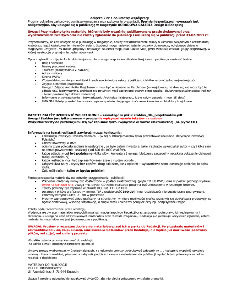 Załącznik nr 1 do umowy współpracy Prosimy dokładnie zastosować poniższe wymagania przy szykowaniu prezentacji. Spełnienie poniższych wymagań jest obligatoryjne, aby ubiegać się o publikację w magazynie OGRODOWA GALERIA Design & Shopping Uwaga! Przyjmujemy tylko materiały, które nie były wcześniej publikowane w prasie drukowanej oraz wydawnictwach zwartych oraz nie zostały zgłoszone do publikacji i nie ukażą się w publikacji przed 31.07.2011 r.! Przypominamy, że aby ubiegać się o publikację w magazynie, należy być absolwentem szkoły o kierunku związanym z architekturą krajobrazu bądź kształtowaniem terenów zieleni. Studenci mogą nadsyłać jedynie projekty do nowego, odrębnego działu w magazynie „Projekty”. W dziale „projekty i realizacje” studenci mogą brać udział tylko, jeżeli wchodzą w skład grupy projektowej, w której występuje przynajmniej jeden absolwent. Oprócz sylwetki – zdjęcia Architekta Krajobrazu lub całego zespołu Architektów Krajobrazu publikacja zawierać będzie : Imię i nazwisko Nazwę pracowni +adres Telefony (maksymalnie 2 numery) Adres mailowy Strona WWW Województwo w którym architekt krajobrazu świadczy usługi. ( jeśli jest ich kilka wybrać jedno najważniejsze) Zdjęcie architekta krajobrazu: Uwaga ! Zdjęcie Architekta Krajobrazu – musi być wykonane na tle pleneru (w krajobrazie, na dworze, nie może być to zdjęcie tzw. legitymacyjne, architekt nie powinien mieć zasłoniętej twarzy przez czapkę, okulary przeciwsłoneczne, rośliny, - twarz powinna być dobrze widoczna) Informacje o wykształceniu i doświadczeniu Architekta Krajobrazu, lub o całym zespole. ( max 15 słów) UWAGA! Należy przesłać także skan dyplomu potwierdzającego ukończenie kierunku architektury krajobrazu. DANE TE NALEŻY UZUPEŁNIĆ WG SZABLONU – zawartego w pliku: szablon_dla_projektantów.pdf Uwaga! Szablon jest tylko wzorem – proszę nie wpisywać ręcznie tekstów na szablon Wszystkie teksty do publikacji muszą być zapisane tylko i wyłącznie w formie elektronicznej (na płycie CD). Informacje na temat realizacji zawierać muszą koniecznie: Lokalizacja inwestycji: miasto-dzielnica - (w tej publikacji możemy tylko prezentować realizacje dotyczące inwestycji Polskich.) Obszar inwestycji w m2: opis na czym polegało zadanie inwestycyjne , co było celem inwestora, jakie inspiracje wykorzystał autor – czyli kilka słów na temat powstawania realizacji ( od 600 do 1000 znaków). każde zdjęcie musi być podpisane –kilka słów, komentarz ( uwaga, kładziemy szczególny nacisk na pokazanie ciekawej małej architektury) każda realizacja musi być zaprezentowana razem z rzutem ogrodu , załączyć dwa rzuty , czysty bez opisów i drugi taki sam, ale z opisami – wydawnictwo samo dostosuje czcionkę do opisu rzutu. Opis roślinności – tylko w języku polskim! Forma przekazania materiałów na potrzeby przygotowania publikacji: Wszystkie materiały winny być dostarczone w postaci elektronicznej (płyta CD lub DVD), oraz w postaci jednego wydruku (tylko na kartkach A4). Uwaga –Na płycie CD każda realizacja powinna być umieszczona w osobnym folderze. Teksty powinny być zapisane w plikach DOC lub TXT lub ODT. parametry plików graficznych – format TIF , rozdzielczość 300 dpi (inna rozdzielczość nie będzie brana pod uwagę!), kolorowy w trybie CMYK, 21 cm w podstawie Prosimy zaproponować układ graficzny na stronie A4- w miarę możliwości graficy przychylą się do Państwa propozycji- co będzie dodatkową, wspólną satysfakcją, a dzięki temu unikniemy pomyłek przy np. podpisywaniu zdjęć Teksty będą recenzowane przez redakcję. Wydawca nie zwraca materiałów nieopublikowanych nadesłanych do Redakcji oraz zastrzega sobie prawo ich redagowania i skracania. Z uwagi na ilość otrzymywanych materiałów oraz formułę magazynu, Redakcja nie publikuje wszystkich zgłoszeń, zatem nadesłanie materiałów nie jest jednoznaczne z publikacją. UWAGA!: Prosimy o rozważne dobieranie materiałów przed ich wysyłką do Redakcji. Po przesłaniu materiałów i zakwalifikowaniu się do publikacji, oraz złożeniu materiałów przez Redakcję, nie będzie już możliwości podmiany plików, ani zdjęć, ani zmiany projektu. Wszelkie pytania prosimy kierować do redakcji: na adres e-mail: [email protected] Umowę proszę wydrukować w 2 egzemplarzach, na odwrocie umowy wydrukować załącznik nr 1 , następnie wypełnić czytelnie umowę : literami wielkimi, pisanymi a załącznik podpisać i razem z materiałami do publikacji wysłać listem poleconym na adres redakcji z dopiskiem: MATERIAŁY DO PUBLIKACJI P.H.P.U. KRUSIKIEWICZ Ul. Rzemieślnicza 8, 71-344 Szczecin Uwaga ! prosimy odpowiednio zapakować płytę CD, aby nie uległa zniszczeniu w trakcie przesyłki.