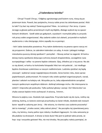 „Z kalendarza leśnika” Chrup! Trzask! Chrup..! Odgłosy zgniatanego pod butem runa, niosą się po jesiennym lesie. Powoli, bez pośpiechu, kroczy sobie przez las zielonkawa postać. Któż to taki? Czy bać się należy? Zwierzę groźne? Niee.. to Leśniczy!- Pan Jerzy. U pana Jerzego w głowie pełno przeróżnych myśli się kłębiło, dlatego wybrał się na spacer leśnymi dróżkami. Szedł sobie po gałęziach, szyszkach i rozmyślał jakby tu przyszły rok pracy sobie zorganizować. Aby zadanie sobie ciut ułatwić, przywołał w myślach wydarzenia z roku bieżącego, które zapadły mu w pamięci. - Ach! Jakie świeżutkie powietrze. Przy takim dotlenieniu na pewno sporo rzeczy mi się przypomni. Dobrze, że zabrałem kalendarz ze sobą. A może i jakiegoś małego mieszkańca puszczy dzisiaj spotkam?- pomyślał. – Muszę zerkać na zegarek. W końcu dzisiaj mamy spotkanie dotyczące ochrony dużych drapieżników, szczególnie rysia europejskiego i wilka- na pewno będzie ciekawie. Ojoj, chłodno już o tej porze. No ale co się dziwić, w końcu to końcówka listopada! Ależ ten rok poleciał... Już niedługo będzie choinkowe szaleństwo w naszym nadleśnictwie. Ludziska zjeżdżać się będą zewsząd i wybierać swoje najpiękniejsza drzewko. Zaraz koniec roku, dużo spraw papierkowych, podsumowań. Po nowym roku wiele spotkań organizacyjnych, narad, planów i założeń na kolejny rok. Wszystko po to, żeby odpowiedzialnie zarządzać naszym społecznym wspólnym dobrem- dotknął zielonego mchu- Ale intensywna ta zieleń! I mięciutka jak poduszka. Tylko położyć głowę i zasnąć. Oo! Sikoreczka! Las chyba zawsze będzie mnie zachwycał. A wiosną.. hmmm.. Wiosna to piękny czas. Dookoła tyle zapachów. Przyroda budzi się do życia, rośliny się zielenią, kwitną, w świecie zwierząt przychodzą na świat młode, dookoła tyle nowych barw- wpadł w zadumę pan Jerzy. - Ale wiosna, to również czas szalenie pracowity! Jak to mawiają” „trzeba zasiać, żeby zebrać plony”. Na początku tej zjawiskowej pory roku, my leśnicy, mamy pełne ręce roboty z budkami lęgowymi. Co roku wieszamy je dla ptaków na drzewach. A drzew w lesie dużo! Nie jest to jednak takie proste, że hop- siup i wszystko gotowe! Nie, nie moi drodzy. Na początku należy pamiętać, że budki mają być powieszone na odpowiedniej wysokości pnia drzewa. Koniecznie w miejscu zacienionym. Budka lęgowa musi być odwrócona otworem wejściowym w kierunku północno- wschodnim lub północnym. A po co? Żeby uniknąć wpływu wiatru, deszczu i przegrzania. Jak już te warunki zostaną spełnione, należy tylko czekać i mieć nadzieję, że wszystkie budki zostaną zasiedlone już w najbliższym okresie lęgowym. W tamtym roku było z tym wesoło. Przyjechały do nas dzieciaki z pobliskiej szkoły i pomagały nam w tym przedsięwzięciu. Dzieci- jak to dzieci, ich śmiech niósł się po całym lesie. Była nauka, była zabawa, dzieci odjechały zadowolone. Oho, a propos dzieci. Przypomniał mi się kwiecień. Młodzież pomagała nam wtedy sadzić nowe pokolenie lasu, a mianowicie, sosnę. Nasi młodzi sadownicy dowiedzieli się przy okazji wielu ciekawych rzeczy na temat drzew, ich życia, ich wpływie na środowisko i teraz zapewne, jak każdy leśnik już wiedzą, że nie wystarczy tylko „wsadzić drzewka zielonym do góry”. Fajnie było. W tym roku trzeba to powtórzyć. W kalendarzu już zanotowane! Po kwietniu oczywiście nadchodzi pachnący świeżością maj. Wtedy to gościnnie u nas, że ho ho! Gościmy studentów, czyli przyszłych leśników. Zapoznajemy ich ze specyfiką Nadleśnictwa oraz tematem zagospodarowania terenów. Ważna sprawa, ponieważ zajmujemy się terenem pohuraganowym. Niejeden mieszkaniec naszych mazurskich terenów pamięta ogrom zniszczeń jakie spowodowała trąba powietrzna z 2002 roku. Wyrywało słabo zakorzenione drzewa, zrywało dachy i niejeden dom uległ znacznemu zniszczeniu. Dwunastka w skali Beauforta ! Aż przykro było na to patrzeć. Jednak nie wszystko było zbierane, naprawiane. Na tych terenach powstało przedsięwzięcie naukowo-badawcze, które umożliwia obserwację naturalnej sukcesji lasu w warunkach poklęskowych. Obszar ten pozostał nietknięty od dnia wichury, jest także wyłączony z pozyskiwania drewna. Minęło już sporo lat od tej daty… pamiętam ile było emocji, pracy.. No więc maj! Studenci leśnicy, w głowie i kalendarzuodnotowane! Oho, przypomniała mi się jeszcze jedna rzecz. Przecież w maju wyjeżdżamy z chłopakami na Zawody Strzeleckie Leśników do Czerwonego Boru! Teraz to już chyba będzie XV edycja. Tam to zawsze humory nam dopisują. Możemy się sprawdzić, porywalizować ze sobą, spotkać kolegów z innych leśniczówek- lubię ten czas. Do wydarzenia jeszcze trochę miesięcy zostało, ale na pewno się zgłoszę. No i 31 maj. Dzień Bociana Białego. Bociek biały to dopiero ptaszysko- przynosi wiosnę, dzieci i szczęście! Tego dnia zazwyczaj uczestniczymy w jakiejś imprezie organizowanej przez jakieś miasto czy muzeum. Podczas obchodów bierzemy udział w organizacji gier, zabaw, konkursów. Muzyczno- kulturalną otoczkę tworzą występy ludowe, a my urządzamy sobie z dziećmi pogadanki o zwierzakach i roślinach. No i małymi kroczkami zakrada się lato. Wspaniały, słoneczny czas. Ale to nie oznacza, że myślimy tylko o urlopach! Zazwyczaj lipiec jest bardzo ciepłym miesiącem. Panuje wtedy wysoki stopień zagrożenia pożarowego w lasach. Upalne temperatury, a do tego brak opadów, powodują, że ściółka jest sucha jak pieprz! Co wtedy robimy? Na wszelkie sposoby przypominamy ludziom, że nie wolno używać otwartego ognia w lesie ani bliżej niż 100m od ściany lasu. Natomiast ogniska i grille można urządzać, ale tylko w przeznaczonych do tego i oznaczonych miejscach. W czasie zagrożenia pożarowego nie wjeżdżamy do lasu pojazdami silnikowymi. Od rozgrzane