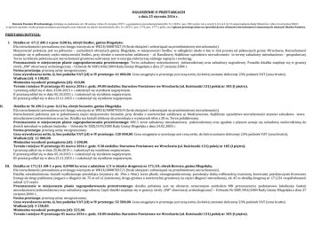 OGŁOSZENIE O PRZETARGACH z dnia 25 stycznia 2016 r. Starosta Powiatu Wrocławskiego, działając na podstawie art. 38 ustawy z dnia 21 sierpnia 1997 r. o gospodarce nieruchomościami (Dz. U. z 2015 r. poz. 782 z późn. zm.), oraz § 3, § 4, § 6 i § 13 rozporządzenia Rady Ministrów z dnia 14 września 2004 r. w sprawie sposobu i trybu przeprowadzania przetargów oraz rokowań na zbycie nieruchomości (Dz. U. z 2015 r. poz. 1774, poz. 1777 z późn. zm.) ogłasza przetargi ustne na sprzedaż prawa własności nieruchomości stanowiących własność Skarbu Państwa. PRZETARGI DOTYCZĄ: I. Działka nr 67/2 AM-1 o pow. 0,08 ha, obręb Siedlec, gmina Długołęka. Dla nieruchomości prowadzona jest księga wieczysta nr WR1E/00087827/0 (brak obciążeń i zobowiązań na przedmiotowej nieruchomości). Miejscowość położona jest na północno – zachodnich obrzeżach gminy Długołęka, w miejscowości Siedlec, w odległości około 6 km w linii prostej od północnych granic Wrocławia. Nieruchomość znajduje się w północnej części miejscowości Siedlec, przy drodze o nawierzchni asfaltowej – ul. Handlowej. Najbliższe sąsiedztwo nieruchomości to tereny zabudowy mieszkaniowo - gospodarczej. Teren na którym położona jest nieruchomość gruntowa uzbrojony jest w energię elektryczną niskiego napięcia i wodociąg. Przeznaczenie w miejscowym planie zagospodarowania przestrzennego: Teren zabudowy mieszkaniowej jednorodzinnej oraz zabudowy zagrodowej. Ponadto działka znajduje się w granicy strefy „OW” obserwacji archeologicznej – Uchwała Nr XXIV/460/2004 Rady Gminy Długołęka z dnia 27 sierpnia 2004 r. Forma przetargu: przetarg ustny nieograniczony. Cena wywoławcza netto, tj. bez podatku VAT (zł) w IV przetargu: 41 000,00. Cena osiągnięta w przetargu jest ceną netto, do której zostanie doliczony 23% podatek VAT (cena brutto). Wadium (zł): 4 100,00. Minimalna wysokość postąpienia (zł): 410,00. Termin i miejsce IV przetargu 01 marca 2016 r. godz. 09.00 siedziba: Starostwo Powiatowe we Wrocławiu (ul. Kościuszki 131) pokój nr 105 (I piętro). I przetarg odbył się w dniu 25.06.2015 r. i zakończył się wynikiem negatywnym. II przetarg odbył się w dniu 05.10.2015 r. i zakończył się wynikiem negatywnym. III przetarg odbył się w dniu 23.11.2015 r. i zakończył się wynikiem negatywnym. II. Działka nr 96 AM-2 o pow. 0,12 ha, obręb Szczodre, gmina Długołęka. Dla nieruchomości prowadzona jest księga wieczysta nr WR1E/00087818/4 (brak obciążeń i zobowiązań na przedmiotowej nieruchomości). Nieruchomość położona jest w południowej części miejscowości Szczodre, przy drodze o nawierzchni asfaltowej ul. Modrzewiowa. Najbliższe sąsiedztwo nieruchomości stanowi zabudowa nowa mieszkaniowa jednorodzinna oraz las. Działka ma kształt zbliżony do prostokąta o wymiarach 60m x 20 m. Teren pofałdowany. Przeznaczenie w miejscowym planie zagospodarowania przestrzennego: MN-1 teren zabudowy mieszkaniowej jednorodzinnej oraz zgodnie z planem uznaje się zabudowę wielorodzinną do dwóch mieszkań w jednym budynku – Uchwała Nr XXXI/539/2005 Rady Gminy Długołęka z dnia 24.02.2005 r. Forma przetargu: przetarg ustny nieograniczony. Cena wywoławcza netto, tj. bez podatku VAT (zł) w IV przetargu: 120 000,00. Cena osiągnięta w przetargu jest ceną netto, do której zostanie doliczony 23% podatek VAT (cena brutto). Wadium (zł): 12 000,00. Minimalna wysokość postąpienia (zł): 1 200,00. Termin i miejsce IV przetargu 01 marca 2016 r. godz. 9.30 siedziba: Starostwo Powiatowe we Wrocławiu (ul. Kościuszki 131) pokój nr 105 (I piętro). I przetarg odbył się w dniu 25.06.2015 r. i zakończył się wynikiem negatywnym. II przetarg odbył się w dniu 05.10.2015 r. i zakończył się wynikiem negatywnym. III przetarg odbył się w dniu 23.11.2015 r. i zakończył się wynikiem negatywnym. III. Działka nr 171/21 AM-1 o pow. 0,0900 ha wraz z udziałem 1/3 w działce drogowej nr 171/24, obręb Borowa, gmina Długołęka. Dla nieruchomości prowadzona jest księga wieczysta nr WR1E/00087837/3 (brak obciążeń i zobowiązań na przedmiotowej nieruchomości). Działka niezabudowana: kształt wydłużonego prostokąta (wymiary ok. 19m x 46m), teren płaski, niezagospodarowany, porośnięty dziką roślinnością trawiastą, krzewami, pojedynczymi drzewami. Dostęp do drogi publicznej (sięgacz o długości ok. 75 m od ul. Jesionowej, droga gminna o nawierzchni gruntowej na części długości utwardzona), ok. 45 m działką drogową nr 171/24–współwłasność udział 1/3 części. Przeznaczenie w miejscowym planie zagospodarowania przestrzennego: działka położona jest na obszarze oznaczonym symbolem MN przeznaczenie podstawowe lokalizacja funkcji mieszkaniowej jednorodzinnej oraz zabudowy zagrodowej. Część działki znajduje się w granicy strefy „OW” obserwacji archeologicznej”.– Uchwała Nr XXIV/456/2004 Rady Gminy Długołęka z dnia 27 sierpnia 2004 r., Forma przetargu: przetarg ustny nieograniczony. Cena wywoławcza netto, tj. bez podatku VAT (zł) w IV przetargu: 52 500,00. Cena osiągnięta w przetargu jest ceną netto, do której zostanie doliczony 23% podatek VAT (cena brutto). Wadium (zł): 5 250,00. Minimalna wysokość postąpienia (zł): 525,00. Termin i miejsce IV przetargu 01 marca 2016 r. godz. 10.00 siedziba: Starostwo Powiatowe we Wrocławiu (ul. Kościuszki 131) pokój nr 105 (I piętro). I przetarg odbył się w dniu 25.06.2015 r. i zakończył się wynikiem negatywnym. II przetarg odbył się w dniu 05.10.2015 r. i zakończył się wynikiem negatywnym. III przetarg odbył się w dniu 23.11.2015 r. i zakończył się wynikiem negatywnym. IV. Działka nr 171/22 AM-1 o pow. 0,1100 ha wraz z udziałem 1/3 w działce drogowej nr 171/24, obręb Borowa, gmina Długołęka. Dla nieruchomości prowadzona jest księga wieczysta nr WR1E/00087837/3 (brak obciążeń i zobowiązań na przedmiotowej nieruchomości). Dzi