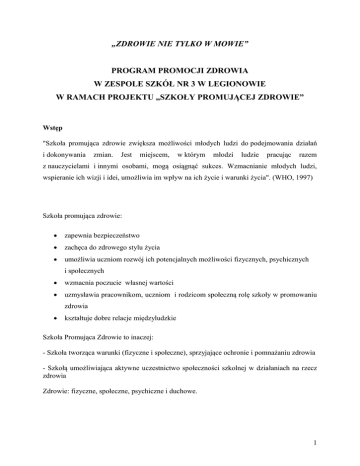 „ZDROWIE NIE TYLKO W MOWIE” PROGRAM PROMOCJI ZDROWIA W ZESPOLE SZKÓŁ NR 3 W LEGIONOWIE W RAMACH PROJEKTU „SZKOŁY PROMUJĄCEJ ZDROWIE” Wstęp "Szkoła promująca zdrowie zwiększa możliwości młodych ludzi do podejmowania działań i dokonywania zmian. Jest miejscem, w którym młodzi ludzie pracując razem z nauczycielami i innymi osobami, mogą osiągnąć sukces. Wzmacnianie młodych ludzi, wspieranie ich wizji i idei, umożliwia im wpływ na ich życie i warunki życia". (WHO, 1997) Szkoła promująca zdrowie: zapewnia bezpieczeństwo zachęca do zdrowego stylu życia umożliwia uczniom rozwój ich potencjalnych możliwości fizycznych, psychicznych i społecznych wzmacnia poczucie własnej wartości uzmysławia pracownikom, uczniom i rodzicom społeczną rolę szkoły w promowaniu zdrowia kształtuje dobre relacje międzyludzkie Szkoła Promująca Zdrowie to inaczej: - Szkoła tworząca warunki (fizyczne i społeczne), sprzyjające ochronie i pomnażaniu zdrowia - Szkołą umożliwiająca aktywne uczestnictwo społeczności szkolnej w działaniach na rzecz zdrowia Zdrowie: fizyczne, społeczne, psychiczne i duchowe. 1 Założenia W dzisiejszym, stechnicyzowanym świecie znaczący wpływ na zdrowie mają zmiany stylu życia, pracy, nauki, sposobu spędzania wolnego czasu. Promocja zdrowia, edukacja prozdrowotna i ekologiczna wpływają na osobisty i społeczny rozwój każdego człowieka już od najmłodszych lat, zwłaszcza poprzez udostępnienie informacji o zdrowiu i zmianę stylu życia. Sieć Szkół Promujących Zdrowie stwarza możliwość przekazania uczniom wiedzy i umiejętności niezbędnych do podejmowania wyborów dla poprawy zdrowia i stanu środowiska. Daje szansę planowania wszechstronnej edukacji prozdrowotnej z zastosowaniem różnych metod aktywizujących społeczność szkolną. Oprócz tego daje perspektywę korzystania z dobrych przykładów innych szkół, pozwala dzielić się wiedzą i doświadczeniem w tak ważnej dziedzinie jaką jest jakość życia człowieka. Jako szkoła mająca na celu dobro dziecka, zależy nam, aby działania prozdrowotne przyczyniły się do osobistych sukcesów zarówno uczniów, nauczycieli jak i rodziców. Takie działania z pewnością przyczynią się także do większej integracji całej społeczności szkolnej i pozwolą zaangażować w rozwój szkoły więcej podmiotów, co tym samym poszerzy zakres oddziaływania edukacji zdrowotnej. Nasza szkoła podejmuje działania promujące zdrowie. Edukacja zdrowotna stanowi ważny element programu nauczania i wychowania szkoły. Uczestniczymy w wielu programach, projektach, konkursach i kampaniach promujących zdrowy styl życia. Wszystkie podejmowane działania łączą nas z siecią szkół promujących zdrowie, dlatego przystąpienie do projektu będzie kontynuacją naszej pracy na rzecz promocji zdrowia. CHARAKTERYSTYKA PROGRAMU I. Termin realizacji: rok 2011 - 2014 II. Wybrane standardy według SzPZ: standard pierwszy: „Szkoła promująca zdrowie pomaga członkom społeczności szkolnej (w tym rodzicom) zrozumieć i zaakceptować koncepcję szkoły promującej zdrowie” standard trzeci: „Szkoła promująca zdrowie prowadzi edukację zdrowotną uczniów i pracowników oraz dąży do zwiększenia jej jakości i skuteczności” Standard czwarty: „Szkoła promująca zdrowie tworzy klimat społeczny sprzyjający: satysfakcji z nauki i pracy w szkole, osiąganiu sukcesów oraz wzmacnianiu poczucia własnej 2 wartości u uczniów i pracowników; zdrowiu i rozwojowi uczniów i pracowników; uczestnictwu, partnerstwu i współdziałaniu członków społeczności szkolnej, rodziców i osób ze społeczności lokalnej. Standard pierwszy: „Szkoła promująca zdrowie pomaga członkom społeczności szkolnej (w tym rodzicom) zrozumieć i zaakceptować koncepcję szkoły promującej zdrowie” Cele: • zrozumieć pojęcie „zdrowie”, • poznać czynniki warunkujące zdrowie, • poznać koncepcję promocji zdrowia, • poznać koncepcję szkoły promującej zdrowie, • zrozumieć korzyści z tworzenia takiej szkoły dla siebie i innych ludzi. Zaakceptować: •zaakceptować własną odpowiedzialność za zdrowie swoje, innych ludzi i tworzenie środowiska sprzyjającego zdrowiu, • aktywnie uczestniczyć w tworzeniu SzPZ. Wskaźniki I. Upowszechnianie wiedzy o koncepcji 1. Przekazywanie nowym członkom i zasadach tworzenia SzPZ i poczucie znajomości społeczności szkolnej wiedzy koncepcji tej koncepcji w społeczności szkolnej. SzPZ. 2. Dostępność publikacji na temat SzPZ. 3. Poczucie członków społeczności szkolnej, że otrzymali wystarczająco dużo informacji o SzPZ. 4. Uczestnictwo większości nauczycieli i innych pracowników i rodziców w zajęciach nt. Szpg w ostatnich 2-3 latach. 5. Wiedza większości uczniów na temat, co robi sięw szkole dla ich zdrowia i dobrego samopoczucia. Wymiary II. Zrozumienie i akceptacja koncepcji SzPZ przez członków społeczności szkolnej 1. Akceptacja koncepcji SzPZ i zasad jej tworzenia przez nauczycieli. 2. Poczucie członków społeczności szkolnej znajomości koncepcji SzPZ. 3 3. Znajomość podstawowych cech SzPZ przez nauczycieli i uczniów. 4. Zrozumienie własnej roli w tworzeniu SzPZ. Standard trzeci: „Szkoła promująca zdrowie prowadzi edukację zdrowotną uczniów i pracowników oraz dąży do zwiększenia jej jakości i skuteczności” Cele: • uświadomienie pojęcia zdrowia, • pogłębienie wiedzy o zdrowiu, zasobach dla zdrowia, czyli czynnikach zwiększających jego potencjał i zagrażających zdrowiu, • dbanie o zdrowie własne i innych, • nabycie umiejętności niezbędnych dla: kształtowania zachowań sprzyjających zdrowiu i radzeniu sobie z nowymi sytuacjami, podejmowaniu właściwych decyzji i wyborów oraz podejmowanie działań służących poprawie zdrowia swojego i innych. Założenia: • uwzględnienie wszystkich aspektów zdrowia (fizycznego, psychicznego, społecznego 