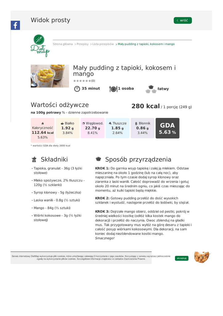 Widok prosty wróć Strona główna Przepisy Lista przepisów Mały pudding z tapioki, kokosem i mango Mały pudding z tapioki, kokosem i mango (0) 35 minut + czas chłodzenia 1 osoba Wartości odżywcze łatwy 280 kcal / 1 porcję (249 g) na 100g potrawy % - dzienne zapotrzebowanie Białko Kaloryczność 112.64 kcal 1.92 g 3.84% Węglowod. 22.70 8.41% g Tłuszcze 1.85 g 2.64% Błonnik 0.86 g 3.44% GDA 5.63 % 5.63% * wartoś ci GDA dla diety 2000 kcal Składniki Tapioka, granulat - 36g (3 łyżki stołowe) Mleko spożywcze, 2% tłuszczu 120g (½ szklanki) Syrop klonowy - 5g (łyżeczka) Laska wanilii - 0.8g (½ sztuki) Mango - 84g (⅓ sztuki) Wiórki kokosowe - 3g (½ łyżki stołowej) Sposób przyrządzenia KROK 1: Do garnka wsyp tapiokę i zalej ją mlekiem. Odstaw mieszaninę na około 1 godzinę (lub na całą noc), aby napęczniała. Po tym czasie dodaj syrop klonowy oraz ziarenka z laski wanilii. Całość doprowadź do wrzenia i gotuj około 20 minut na średnim ogniu, co jakiś czas mieszając do momentu, aż kulki tapioki będą miękkie. KROK 2: Gotowy pudding przełóż do dość wysokich szklanek i wystudź, następnie przełóż do lodówki, by stężał. KROK 3: Dojrzałe mango obierz, oddziel od pestki, pokrój w średniej wielkości kostkę (odłóż kilka kostek mango do dekoracji) i przełóż do naczynia. Owoc zblenduj na gładki mus. Tak przygotowany mus wyłóż na górę deseru z tapioki i całość posyp wiórkami kokosowymi. Dla dekoracji, na sam koniec dodaj niezblendowane kostki mango. Smacznego! Serwis internetowy DietMap wykorzystuje pliki cookies, które umożliwiają i ułatwiają Ci korzystanie z jego zasobów. Korzystając z serwisu wyrażasz jednocześnie zgodę na wykorzystanie plików cookies. Szczegółowe informacje znajdziesz w zakładce Zastrzeżenia Prawne. akceptuję