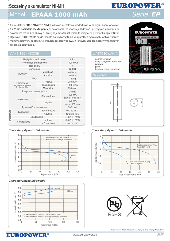 Szczelny akumulator Ni-MH Model: EPAAA 1000 mAh Seria EP Akumulatory EUROPOWER® NiMH, niklowo-metalowo wodorkowe o napięciu znamionowym 1,2 V nie posiadają efektu pamięci, co oznacza, że można je ładować i przerywać ładowanie w dowolnym czasie bez obawy o utratę pojemności, jak miało to miejsce w przypadku ogniw NiCd. Ogniwa EUROPOWER® są doskonałe do wykorzystania w aparatach cyfrowych, odtwarzaczach multimedialnych, pilotach, telefonach bezprzewodowych i innych urządzeniach wymagających zasilania bateryjnego. DANE TECHNICZNE ZASTOSOWANIA Szybkie Temperatura Żywotność projektowana Standardowe Ładowanie Szybkie Rozładowanie < 1 rok Składowanie < 3 miesiące Charakterystyka rozładowania aparaty cyfrowe mały sprzęt elektroniczny zabawki piloty telefony bezprzewodowe WYMIARY 10,5 Standardowe Ładowanie 1,2 V 1000 mAh 1 Ni-MH 40,5 mm 10,5 mm 15,0 g 980 mAh 1000 mAh 950 mAh 35 mW 100 mA przez 14 do 16 h 500 mA przez 135 min 300 cykli 0oC do 45oC 10oC do 45oC -10oC do 65oC -20oC do 35oC -20oC do 45oC 44,5 Napięcie znamionowe Pojemność znamionowa Ilość ogniw Technologia wysokość Wymiary średnica Waga Typowa Pojemność Znamionowa (po ładowaniu prądem 0,1C przez 16h) Minimalna Rezystancja wewnętrzna Charakterystyka rozładowania 200 mA 500 mA Napięcie wyjściowe [V] Napięcie wyjściowe [V] Ładowanie: 100 mA przez 16 h Rozładowane: stałym prądem do 1.0 V Pojemność (C5) [%] Prąd rozładowania: 1C [A] Czas: 56,9 [min] Prąd rozładowania: 2C [A] Czas: 27,4 [min] Czas rozładowania [min] Charakterystyka ładowania 500 mA Napięcie wyjściowe [V] 100 mA Ch-ka ładowania 100 mA: czas ładowania 16h Ch-ka ładowania 500 mA: do rozłączenia przy ΔV=5 mV Pojemność (C5) [%] data wydania: 20.07.2007; numer zmiany: 2; data zmiany: 17.02.2016 www.europower.eu EP