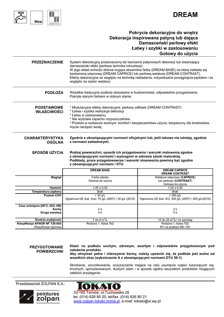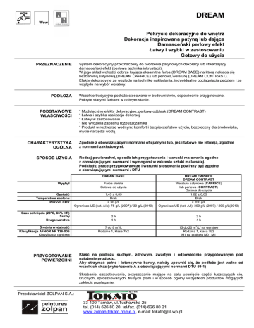 DREAM Wew Pokrycie dekoracyjne do wnętrz Dekoracja inspirowana patyną lub dająca Damasceński perłowy efekt Łatwy i szybki w zastosowaniu Gotowy do uŜycia PRZEZNACZENIE PODŁOśA PODSTAWOWE WŁAŚCIWOŚCI CHARAKTERYSTYKA OGÓLNA SPOSÓB UśYCIA System dekoracyjny przeznaczony do tworzenia patynowych dekoracji lub stwarzający damasceński efekt (perłowa technika inkrustacji). W jego skład wchodzi dobrze kryjąca aksamitna farba (DREAM BASE) na którą nakłada się bezbarwną satynową (DREAM CAPRICE) lub perłową welaturę (DREAM CONTRAST). Efekty dekoracyjne ze względu na technikę nakładania, indywidualne pociągnięcia pędzlem i ze względu na wybór welatury. Wszelkie tradycyjne podłoŜa stosowane w budownictwie, odpowiednio przygotowane. Pokryte starymi farbami w dobrym stanie. * Modulacyjne efekty dekoracyjne, perłowy odblask (DREAM CONTRAST) * Łatwa i szybka realizacja dekoracji * Łatwy w zastosowaniu * Nie wydziela zapachu rozpuszczalnika * Produkt w roztworze wodnym: komfort i bezpieczeństwo uŜycia, bezpieczny dla środowiska, mycie narzędzi wodą Zgodnie z obowiązującymi normami oficjalnymi lub, jeśli takowe nie istnieją, zgodnie z normami zakładowymi. Rodzaj powierzchni, sposób ich przygotowania i warunki malowania zgodne z obowiązującymi normami i wymogami w zakresie sztuki malarskiej. Podkłady, prace przygotowawcze i warunki stosowania powinny być zgodne z obowiązującymi normami / DTU DREAM BASE Wygląd Gęstość Temperatura zapłonu Poziom COV Czas schnięcia (20°C, 65% HR) Suchy Druga warstwa Średnia wydajność Klasyfikacja AFNOR NF T36-005 Klasyfikacja ogniowa PRZYGOTOWANIE POWIERZCHNI 1,45 ± 0,05 Brak < 30 g/L Ogranicza UE (kat. A/a): 75 g/L (2007) / 30 g/L (2010) DREAM CAPRICE DREAM CONTRAST Welatura satynowa (CAPRICE) lub perłowa (CONTRAST) Gotowa do uŜycia 1,02 ± 0,05 Brak < 200 g/L Ogranicza UE (kat. A/I): 300 g/L (2007) / 200 g/L(2010) 2h 4h 2h 4h 7 do 8 m2/L Rodzina 1, klasa 7b2 15 do 20 m2/L/ na warstwę Rodzina 1, klasa 7b2 M1 na podłoŜu M0 i M1 Farba oleista Gotowa do uŜycia Kłaść na podłoŜu suchym, zdrowym, zwartym i odpowiednio przygotowanym pod nałoŜenie produktu. Aby otrzymać pełne i intensywne barwy, naleŜy upewnić się, Ŝe podłoŜe jest wolne od wszelkich skaz (wykończenie A z obowiązującymi normami DTU 59-1) Skrobanie, szczotkowanie, oczyszczanie mające na celu usunięcie części łuszczących się, kruchych, sproszkowanych, tłustych plam i w sposób ogólny wszystkich produktów mogących zakłócić przyleganie. Przedstawiciel ZOLPAN S.A.: 33-100 Tarnów, ul.Tuchowska 25 tel. (014) 626 80 20, tel/fax. (014) 626 80 21 www.zolpan-tokato.home.pl, e-mail: [email protected] Mycie / doszczelnianie starych przylegających powłok malarskich. Jeśli konieczne częściowe szpachlowanie lub całkowite otynkowanie: tynkiem CILD. Szlifowanie, oczyszczanie. Bezpośrednie nakładanie DREAM BASE na podłoŜach dobrze pochłaniających lub pokrytych starymi matowymi farbami. Zagruntowanie MAOLINE na złoŜonych lub porowatych podłoŜach. NAKŁADANIE PRODUKTU Ze względu na efekty dekoracyjne kolorów, jasność lub inne efekty, rezultat końcowy zaleŜy bezpośrednio od uŜytego narzędzia lub sposobu nakładania produktu. Zalecana wcześniejsza próba. Sposób postępowania Dla otrzymania jednolitego koloru podłoŜa, nałoŜyć akrylowym wałkiem 1 do 2 warstw DREAM BASE. Schnięcie między warstwami minimum 4 h. Pozostawić do wysuszenia a następnie kontynuować dekorację. Wygląd patynowy: nakładanie wałkiem lub tamponem nasyconym w welaturze DREAM CAPRICE (wygląd satynowy) lub DREAM CONTRAST (wygląd perłowy) UŜyty tampon moŜe być z zamszu w kształcie pęku, gąbka, miękka szmatka... ze względu na oczekiwany efekt. Wygląd damasceński (perłowa technika inkrustacji): nakładanie wałkiem jednej warstwy welatury DREAM CONTRAST. Schnięcie minimum 4 h i nakładanie tamponem DREAM BASE barwy rozcieńczonej w 30% wody. DREAM BASE: gotowa do uŜycia 30% wody dla wykończenia – efekt damasceński DREAM CAPRICE lub CONTRAST: gotowy do uŜycia Wałek akrylowy, zamszowy tampon, gąbka, szmatka, Rozcieńczanie Materiał Mycie narzędzi ZALECENIA KOLORY OPAKOWANIE PRZECHOWYWANIE BEZPIECZEŃSTWO I HIGIENA PRACY Wodą, natychmiast po uŜyciu. Warunki nakładania: o - w temperaturze otoczenia i podłoŜa wyŜszej od 5 C (z zachowaniem środków ostroŜności przy o T > 35 C) - przy wilgotności względnej niŜszej niŜ 80 %, podłoŜe suche i nie kondensujące - dla jednolitego rezultatu, pracować na jednolitych podłoŜach i zawsze uŜywając tego samego sposobu nakładania - przygotować personel dostosowany do duŜych powierzchni i / lub przy wysokich temperaturach otoczenia DREAM BASE: wzornik realizowany w ZOLPACHROM 2 (biały / baza P) DREAM CAPRICE, DREAM CONTRAST: bezbarwny lub efekt perłowy DREAM BASE: 1 L – 5 L – 15 L DREAM CAPRICE, DREAM CONTRAST: 1L – 5 L 12 miesięcy w oryginalnym zamkniętym opakowaniu. 0 Przechowywać chroniąc przed mrozem i temperaturą powyŜej 35 C. Zapoznać się z: * etykietą informacyjną zasad bezpieczeństwa na opakowaniu * kartą zasad bezpieczeństwa: • MINITEL: 08.36.05.10.12 kod ZOLPAN (nr zielony gratis) • INTERNET: www.zolpan.fr (rubryka Bezpiecznego UŜytkowania) Uw Karta Techniczna nr 2232 Data wydania: wrzesień 2006 Uwaga: UniewaŜnia i zastępuje wcześniejsze wydania. Do naszych klientów naleŜy sprawdzenie, przed uŜyciem, czy chodzi o ostatnie wydanie ulotki. Informacje zawarte w tej ulotce mają tylko charakter orientacyjny i nie mogą zastąpić instrukcji postępowania dostosowanego do natury oraz do stanu konkretnego podłoŜa. Przedstawiciel ZOLPAN S.A.: 33-100 Tarnów, ul.Tuchowska 25 tel. (014) 626 80 20, tel/fax. (014) 626 80 21 www.zolpan-tokato.home.pl, e-mail: [email protected]