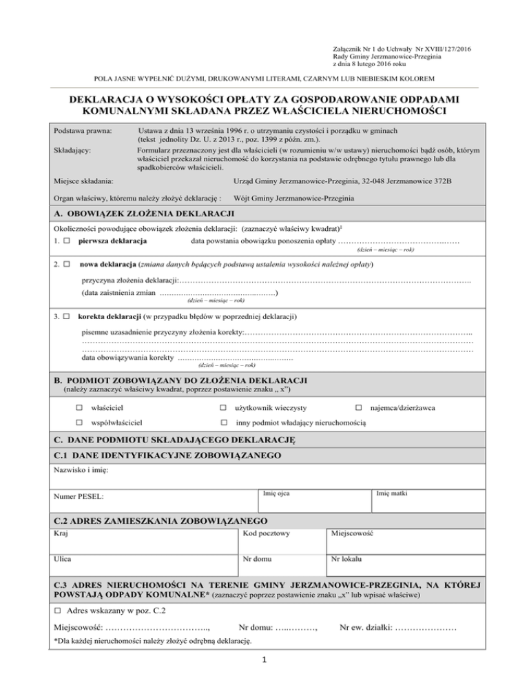 Załącznik Nr 1 do Uchwały Nr XVIII/127/2016 Rady Gminy Jerzmanowice-Przeginia z dnia 8 lutego 2016 roku POLA JASNE WYPEŁNIĆ DUŻYMI, DRUKOWANYMI LITERAMI, CZARNYM LUB NIEBIESKIM KOLOREM DEKLARACJA O WYSOKOŚCI OPŁATY ZA GOSPODAROWANIE ODPADAMI KOMUNALNYMI SKŁADANA PRZEZ WŁAŚCICIELA NIERUCHOMOŚCI Podstawa prawna: Ustawa z dnia 13 września 1996 r. o utrzymaniu czystości i porządku w gminach (tekst jednolity Dz. U. z 2013 r., poz. 1399 z późn. zm.). Składający: Formularz przeznaczony jest dla właścicieli (w rozumieniu w/w ustawy) nieruchomości bądź osób, którym właściciel przekazał nieruchomość do korzystania na podstawie odrębnego tytułu prawnego lub dla spadkobierców właścicieli. Miejsce składania: Urząd Gminy Jerzmanowice-Przeginia, 32-048 Jerzmanowice 372B Organ właściwy, któremu należy złożyć deklarację : Wójt Gminy Jerzmanowice-Przeginia A. OBOWIĄZEK ZŁOŻENIA DEKLARACJI Okoliczności powodujące obowiązek złożenia deklaracji: (zaznaczyć właściwy kwadrat)1 1. □ pierwsza deklaracja data powstania obowiązku ponoszenia opłaty ………………………………….…… (dzień – miesiąc – rok) 2. □ nowa deklaracja (zmiana danych będących podstawą ustalenia wysokości należnej opłaty) przyczyna złożenia deklaracji:……………………………………………………………………………………………….. (data zaistnienia zmian ………………………………….………) (dzień – miesiąc – rok) 3. □ korekta deklaracji (w przypadku błędów w poprzedniej deklaracji) pisemne uzasadnienie przyczyny złożenia korekty:………………………………………………………………………….. ………………………………………………………………………………………………………………………………… ………………………………………………………………………………………………………………………………… data obowiązywania korekty ………………………………….……… (dzień – miesiąc – rok) B. PODMIOT ZOBOWIĄZANY DO ZŁOŻENIA DEKLARACJI (należy zaznaczyć właściwy kwadrat, poprzez postawienie znaku „ x”) □ □ właściciel współwłaściciel □ □ użytkownik wieczysty □ najemca/dzierżawca inny podmiot władający nieruchomością C. DANE PODMIOTU SKŁADAJĄCEGO DEKLARACJĘ C.1 DANE IDENTYFIKACYJNE ZOBOWIĄZANEGO Nazwisko i imię: Imię ojca Numer PESEL: Imię matki C.2 ADRES ZAMIESZKANIA ZOBOWIĄZANEGO Kraj Kod pocztowy Miejscowość Ulica Nr domu Nr lokalu C.3 ADRES NIERUCHOMOŚCI NA TERENIE GMINY JERZMANOWICE-PRZEGINIA, NA KTÓREJ POWSTAJĄ ODPADY KOMUNALNE* (zaznaczyć poprzez postawienie znaku „x” lub wpisać właściwe) □ Adres wskazany w poz. C.2 Miejscowość: …………………………….., Nr domu: …..………, *Dla każdej nieruchomości należy złożyć odrębną deklarację. 1 Nr ew. działki: ………………… C.4 DANE DODATKOWE* (dobrowolnie) Nr telefonu Adres e-mail *podane dane umożliwiają otrzymywanie przez „właściciela” smsów przypominających o zbliżającym się terminie płatności, oraz korespondencji mailowej (np. otrzymywanie blankietów wpłat drogą mailową). D. OŚWIADCZENIE O SPOSOBIE ZBIERANIA ODPADÓW KOMUNALNYCH I NIECZYSTOŚCI CIEKŁYCH NA NIERUCHOMOŚCI WSKAZANEJ W CZEŚCI C.3 2 D.1. Na terenie nieruchomości: □ będzie prowadzona selektywnie zbiórka odpadów i do ustalenia opłaty miesięcznej przyjmują stawkę niższą □ nie będzie prowadzona selektywna zbiórka odpadów i do ustalenia opłaty miesięcznej przyjmują stawkę wyższą. D.2. Na terenie nieruchomości znajduje się kompostownik, w którym zobowiązuje się gromadzić odpady ulegające biodegradacji, a powstały kompost wykorzystywać na własne potrzeby: □ TAK □ NIE D.3. Nieruchomość wyposażona jest: □ kanalizację sanitarną □ zbiornik bezodpływowy o pojemności……..m³ □ przydomową oczyszczalnię ścieków o przepustowości…… m³/d E. OPŁATA ZA GOSPODAROWANIE ODPADAMI KOMUNALNYMI E.1. Rodzaj gospodarstwa domowego3: □ jednoosobowe □ dwuosobowe □ trzyosobowe □ czteroosobowe □ pięcioosobowe i większe (......................) liczba osób E.2. Liczba gospodarstw domowych4 (należy podać liczbę gospodarstw domowych prowadzonych na terenie nieruchomości wskazanej w części C.3. w każdym lokalu mieszkalnym i budynku mieszkalnym). ........... (wpisać liczbę gospodarstw domowych) E.3. Wyliczenie kwartalnej opłaty za gospodarowanie odpadami komunalnymi (iloczyn liczby gospodarstw domowych prowadzonych na terenie nieruchomości zamieszkałej x stawka opłaty x ilość miesięcy – przy wyborze stawki należy zaznaczyć odpowiedni kwadrat, zgodnie z poz. D.1)5: Rodzaj Stawka miesięczna opłaty za gospodarowanie odpadami komunalnymi Gospodarstwo gospodarstwa przypadająca na gospodarstwo domowe (zł/gosp.) domowego Zbiórka selektywna Zbiórka nieselektywna I jednoosobowe 15 25 II dwuosobowe 26 36 III trzyosobowe 30 40 IV czteroosobowe 34 44 V pięcioosobowe i większe 37 47 Wyliczenie kwartalnej opłaty: Gospodarstwo domowe - ................................... jednoosobowe (liczba gospodarstw) x ............................... Gospodarstwo domowe - ................................... dwuosobowe (liczba gospodarstw) x ............................... Gospodarstwo domowe - ................................... trzyosobowe (liczba gospodarstw) x ............................... (stawka opłaty) (stawka opłaty) (stawka opłaty) 2 x 3 miesiące = ................................ (wysokość opłaty) x 3 miesiące = ................................ (wysokość opłaty) x 3 miesiące = ................................ (wysokość opłaty) Gospodarstwo domowe - ................................... czteroosobowe (liczba gospodarstw) Gospodarstwo domowe pięcioosobowe i większe x .......................