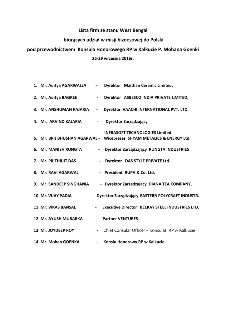 Lista firm ze stanu West Bengal biorących udział w misji biznesowej do Polski pod przewodnictwem Konsula Honorowego RP w Kalkucie P. Mohana Goenki 25-29 września 2016r. 1. Mr. Aditya AGARWALLA - Dyrektor Maithan Ceramic Limited, 2. Mr. Aditya BAGREE - Dyrektor ASBESCO INDIA PRIVATE LiMITED, 3. Mr. ANSHUMAN KAJARIA - Dyrektor VAACHI INTERNATIONAL PVT. LTD. 4. Mr. ARVIND KAJARIA - Dyrektor Zarządzający INFRASOFT TECHNOLOGIES Limited 5. Mr. BRIJ BHUSHAN AGARWAL - Wiceprezes SHYAM METALICS & ENERGY Ltd. 6. Mr. MANISH RUNGTA - Dyrektor Zarządzający RUNGTA INDUSTRIES 7. Mr. PRITHIIJIT DAS - Dyrektor DAS STYLE PRIVATE Ltd. 8. Mr. RAVI AGARWAL - President RUPA & Co. Ltd. 9. Mr. SANDEEP SINGHANIA - Dyrektor Zarządzający DIANA TEA COMPANY, 10. Mr. VIJAY PADIA - Dyrektor Zarządzający EASTERN POLYCRAFT INDUSTR. 11. Mr. VIKAS BANSAL - Executive Director BEEKAY STEEL INDUSTRIES LTD. 12. Mr. AYUSH MURARKA - Partner VENTURES 13. Mr. JOYDEEP ROY - Chief Consular Officer – Konsulat RP w Kalkucie 14. Mr. Mohan GOENKA - Konslu Honorowy RP w Kalkucie