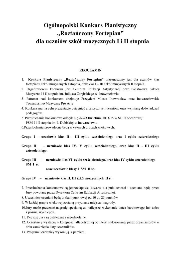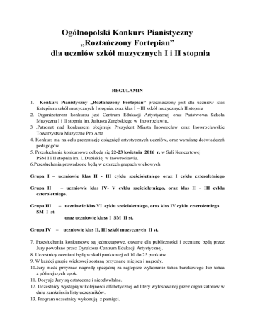 Ogólnopolski Konkurs Pianistyczny „Roztańczony Fortepian” dla uczniów szkół muzycznych I i II stopnia REGULAMIN Konkurs Pianistyczny „Roztańczony Fortepian” przeznaczony jest dla uczniów klas fortepianu szkół muzycznych I stopnia, oraz klas I – III szkół muzycznych II stopnia 2. Organizatorem konkursu jest Centrum Edukacji Artystycznej oraz Państwowa Szkoła Muzyczna I i II stopnia im. Juliusza Zarębskiego w Inowrocławiu, 3 .Patronat nad konkursem obejmuje Prezydent Miasta Inowrocław oraz Inowrocławskie Towarzystwo Muzyczne Pro Arte 4. Konkurs ma na celu prezentację osiągnięć artystycznych uczniów, oraz wymianę doświadczeń pedagogów. 5. Przesłuchania konkursowe odbędą się 22-23 kwietnia 2016 r. w Sali Koncertowej PSM I i II stopnia im. I. Dubiskiej w Inowrocławiu. 6.Przesłuchania prowadzone będą w czterech grupach wiekowych: 1. Grupa I – uczniowie klas II - III cyklu sześcioletniego oraz I cyklu czteroletniego Grupa II – uczniowie klas IV- V cyklu sześcioletniego, oraz klas II - III cyklu czteroletniego. Grupa III – uczniowie klas VI cyklu sześcioletniego, oraz klas IV cyklu czteroletniego SM I st. oraz uczniowie klasy I SM II st. Grupa IV – uczniowie klas II, III szkół muzycznych II st. 7. Przesłuchania konkursowe są jednoetapowe, otwarte dla publiczności i oceniane będą przez Jury powołane przez Dyrektora Centrum Edukacji Artystycznej. 8. Uczestnicy oceniani będą w skali punktowej od 10 do 25 punktów 9. W każdej grupie wiekowej zostaną przyznane miejsca i nagrody. 10.Jury może przyznać nagrodę specjalną za najlepsze wykonanie tańca barokowego lub tańca z późniejszych epok. 11. Decyzje Jury są ostateczne i nieodwołalne. 12. Uczestnicy wystąpią w kolejności alfabetycznej od litery wylosowanej przez organizatorów w dniu zamknięcia listy uczestników. 13. Program uczestnicy wykonują z pamięci. 14. Przesłuchania zakończą się wręczeniem dyplomów i nagród oraz koncertem laureatów. 15. O wyborze utworu na koncert laureatów decyduje Jury. 16. Zgłoszenia uczestników wraz ze zgodą o przetwarzaniu danych osobowych oraz potwierdzeniem wpłaty wpisowego należy przesłać do dnia 25 marca 2016 r. pocztą mailową lub tradycyjną na adres: PSM I i II st w Inowrocławiu lub na adres e-mail [email protected]. 17. Wpisowe przesłuchań wynosi 60,00 zł. Należy je wpłacić do dnia 25 marca 2016 r. na konto: Rada Rodziców PSM I i II st. w Inowrocławiu 36 1090 1069 0000 0000 0701 4116 z dopiskiem „Roztańczony Fortepian”. W razie rezygnacji kandydata wpisowe nie podlega zwrotowi. 18. Lista uczestników zostanie opublikowana na stronie www.psmino.com.pl 11 kwietnia 2016r. 19. Koszty podróży i wyżywienia pokrywają uczestnicy. Program : Grupa I, II i III 1. Etiuda lub utwór o charakterze technicznym 2. Taniec barokowy 3. Taniec z późniejszych epok Grupa IV 1.Etiuda lub utwór o charakterze wirtuozowskim 2. Utwór epoki baroku ( Inwencja trzygłosowa, Preludium i fuga lub dwa kontrastujące tańce z suity) 3. Taniec z późniejszych epok ( po baroku) Wszelkich informacji udziela wicedyrektor M. Rona pod nr.tel. 601 179 701